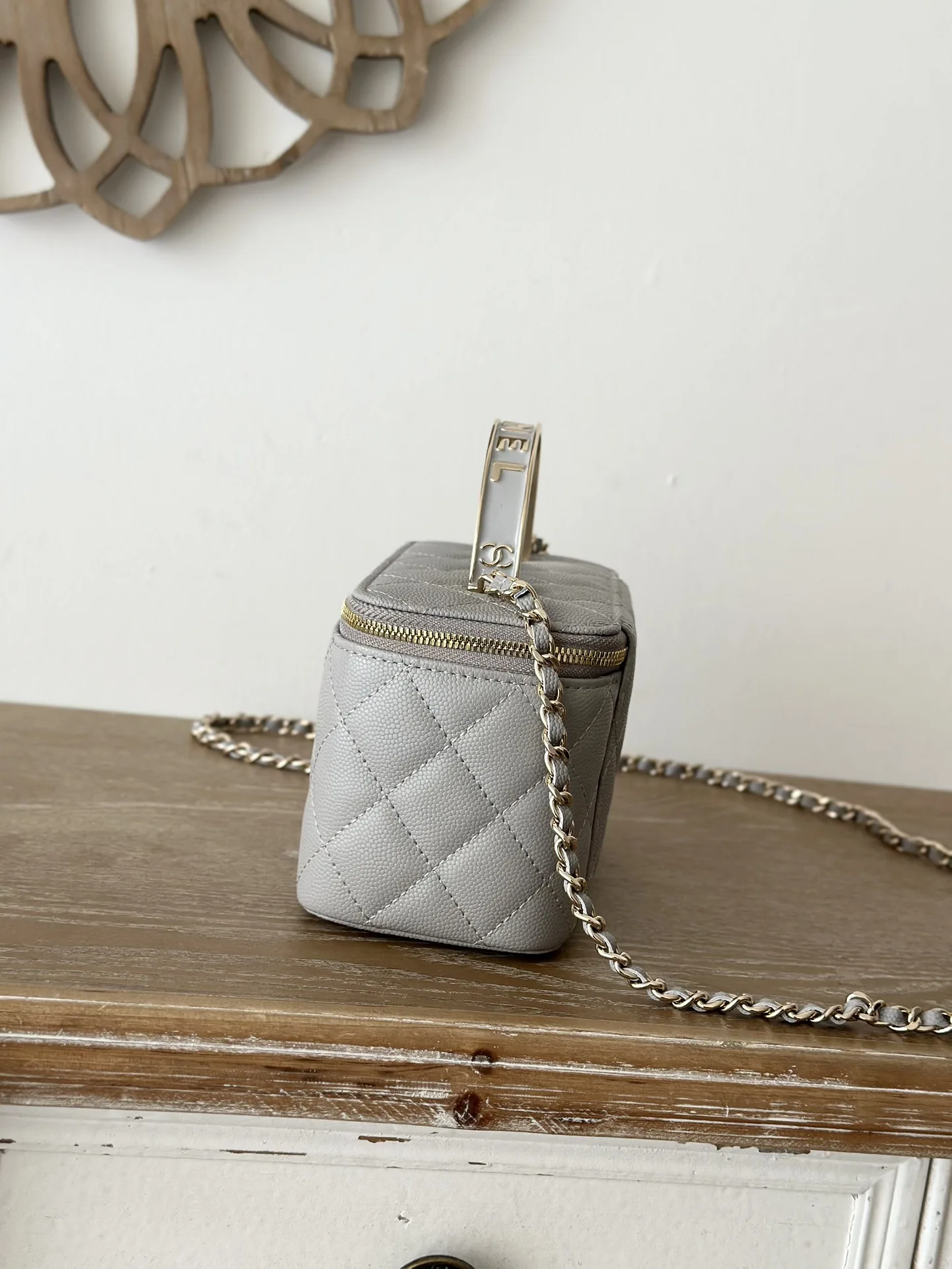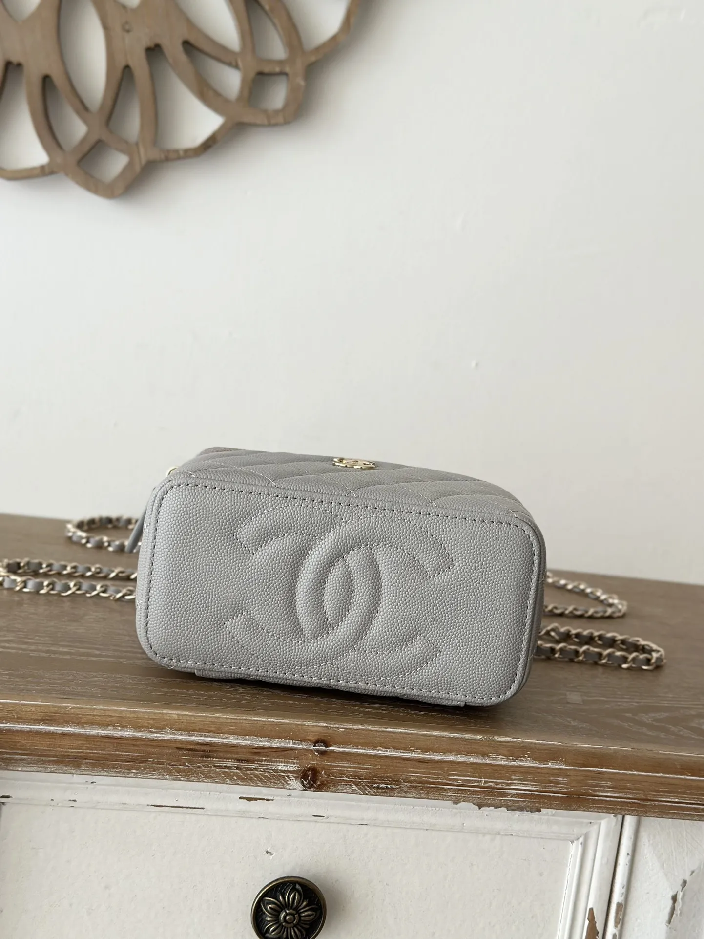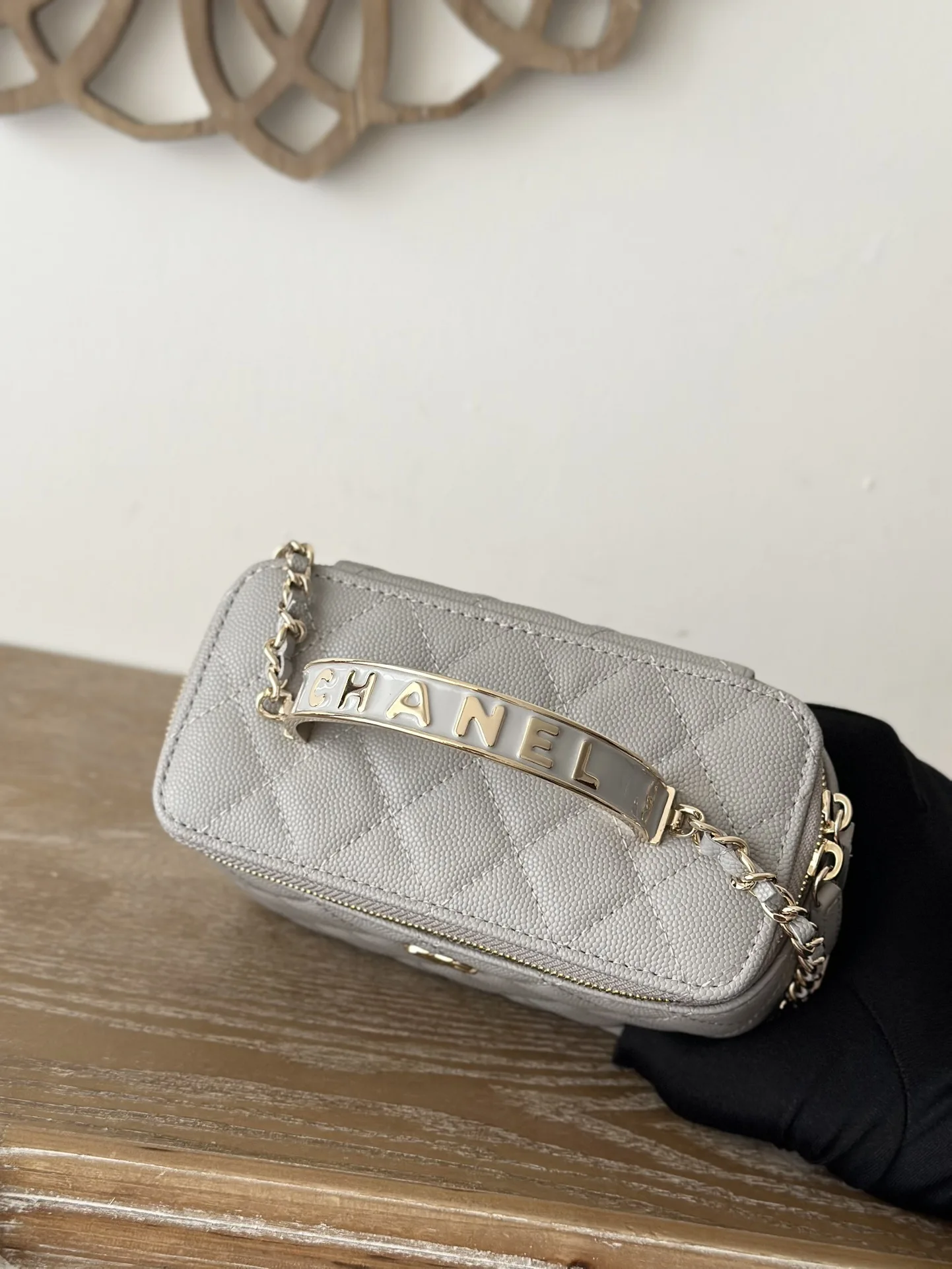 Chanel New Enamel Buckle Large Chain Cosmetic Bag with Mirror. This new box bag features a metal enamel buckle handle! I was completely obsessed when I saw the actual product It has a completely different temperament, a surprise and a stunning look! It can be worn as a shoulder bag, crossbody bag, or handbag! It can hold small items such as lipstick , powder compact, keys, etc. The main point is that a large mobile phone can also fit inside. Size: 9.5 17 8cm, Code: 66009 Light Grey.