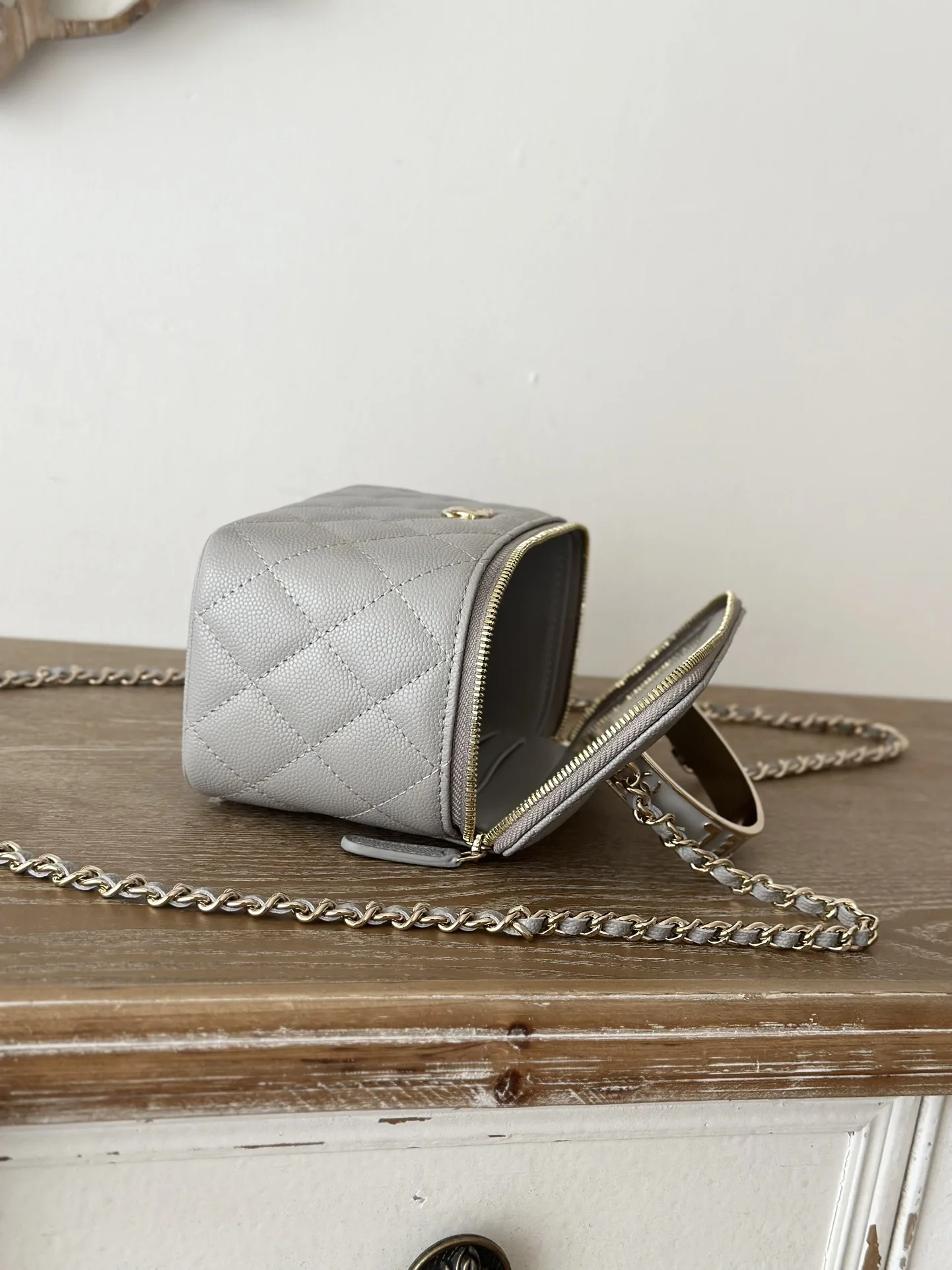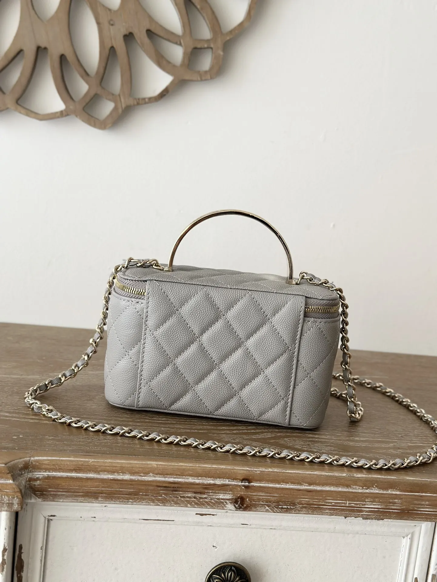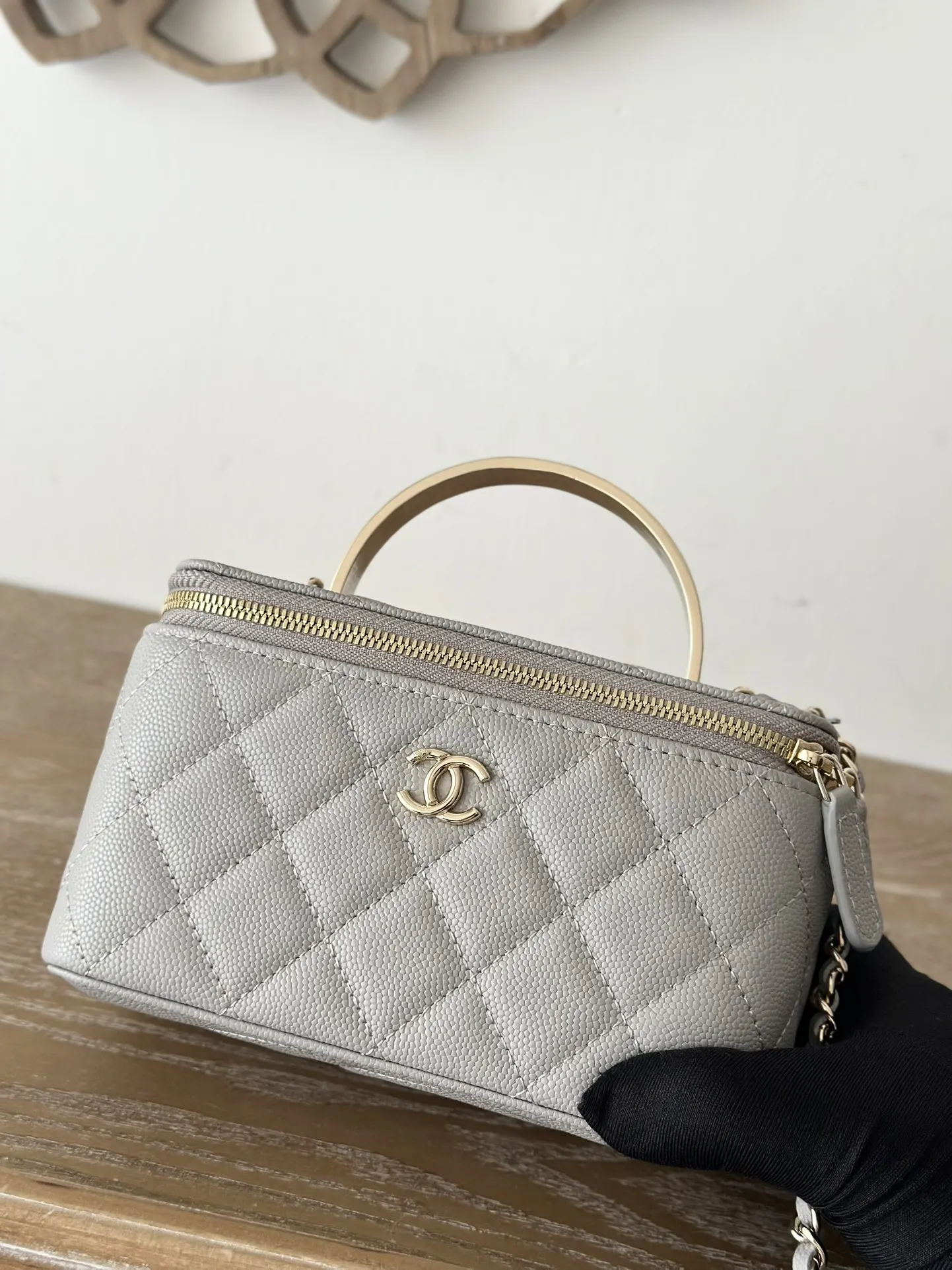Chanel New Enamel Buckle Large Chain Cosmetic Bag with Mirror. This new box bag features a metal enamel buckle handle! I was completely obsessed when I saw the actual product It has a completely different temperament, a surprise and a stunning look! It can be worn as a shoulder bag, crossbody bag, or handbag! It can hold small items such as lipstick , powder compact, keys, etc. The main point is that a large mobile phone can also fit inside. Size: 9.5 17 8cm, Code: 66009 Light Grey.