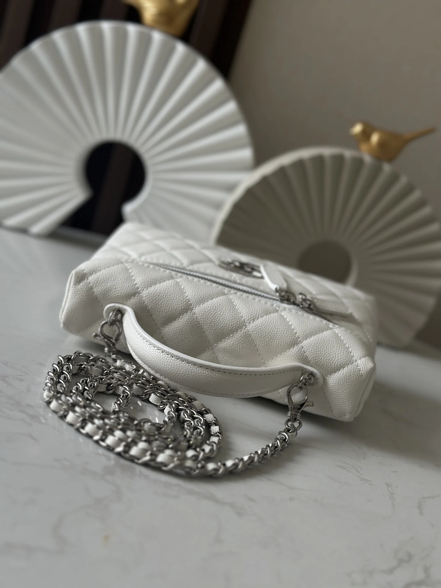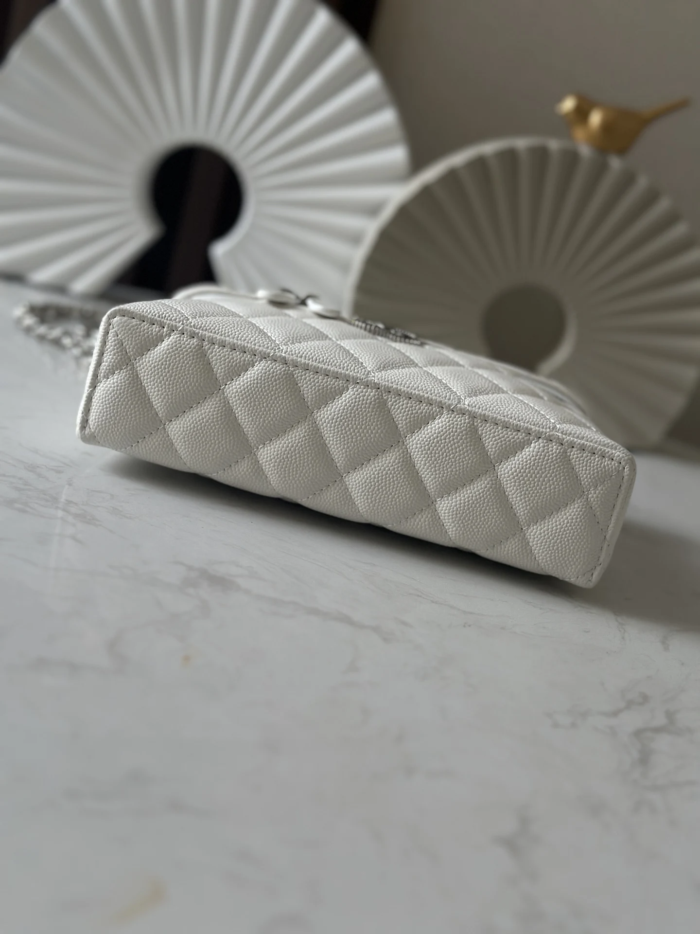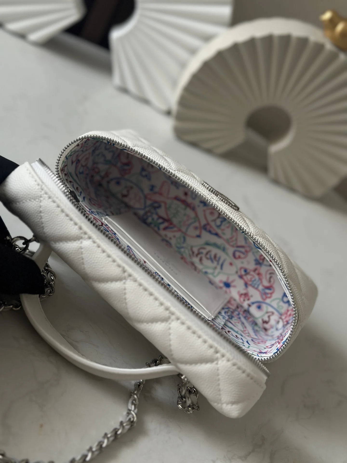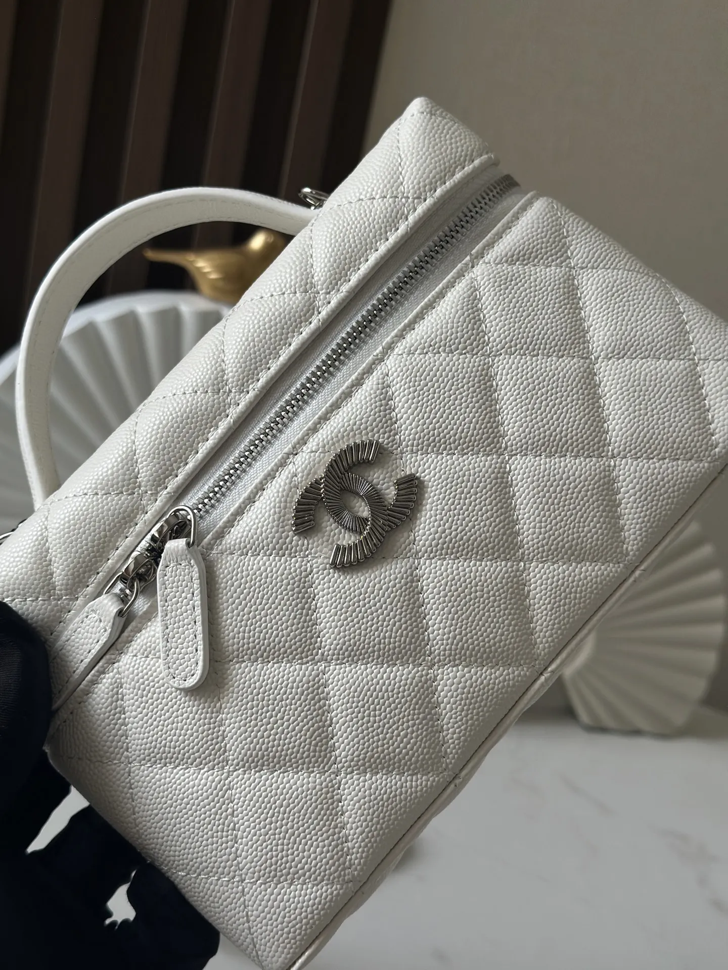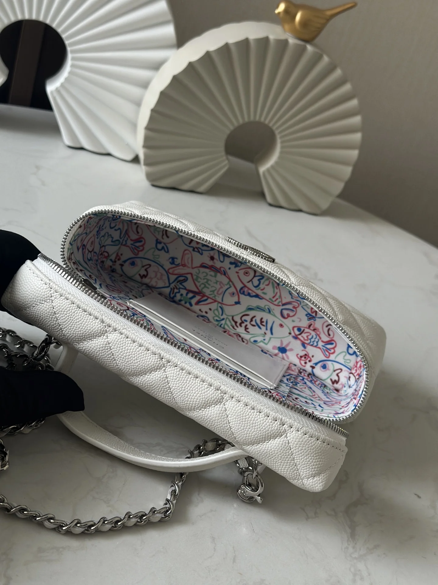 Chip version Chane 25c lunch box bag with classic graffiti silver chain logo, handbag, crossbody bag in calfskin grain, exuding a fresh and refined sense of fashion at first glance! With its classic design, every detail reveals sophistication and elegance. Whether it s the iconic diamond quilting or the double C logo, it s irresistible. Perfect for both formal occasions and casual outings. Those who like it, go for it! Size: 14x18x3cm. Number: 66011. White with packaging.