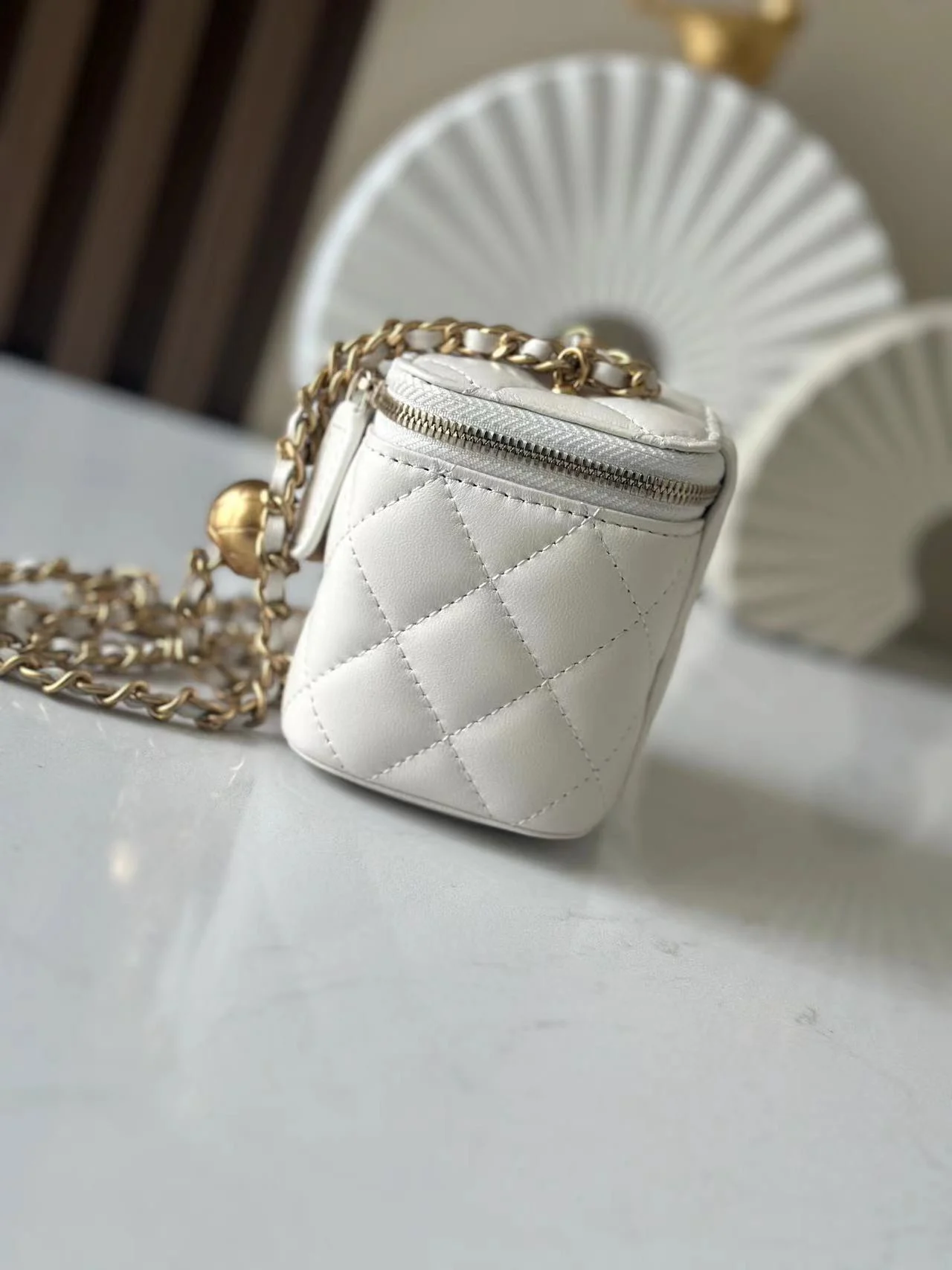 Chip version, boutique synchronization, latest version, correct hardware and leather, small Chane mini classic chain box handbag. I was instantly drawn to it upon seeing it! This style is very popular online! The actual product is indeed super cute and looks very chic when worn! It also has a magical little golden ball that can control the length of the shoulder strap! This little cutie has enough capacity to hold lipstick, car keys, and tissues for daily outings. It can t fit a phone, but being cute is enough. Size: 10.5 8.5 7cm. Number: 66014. White, gold chain with packaging.
