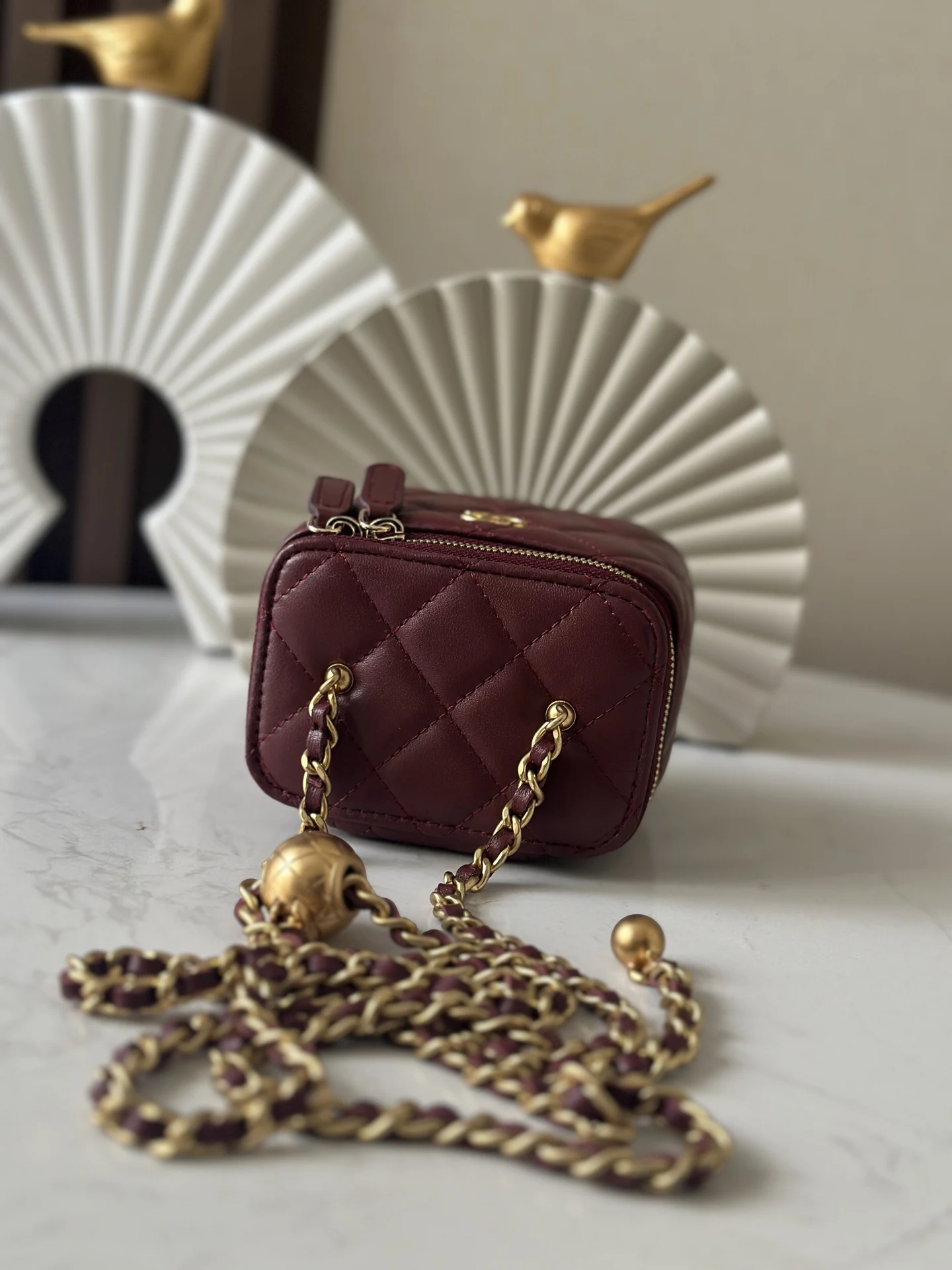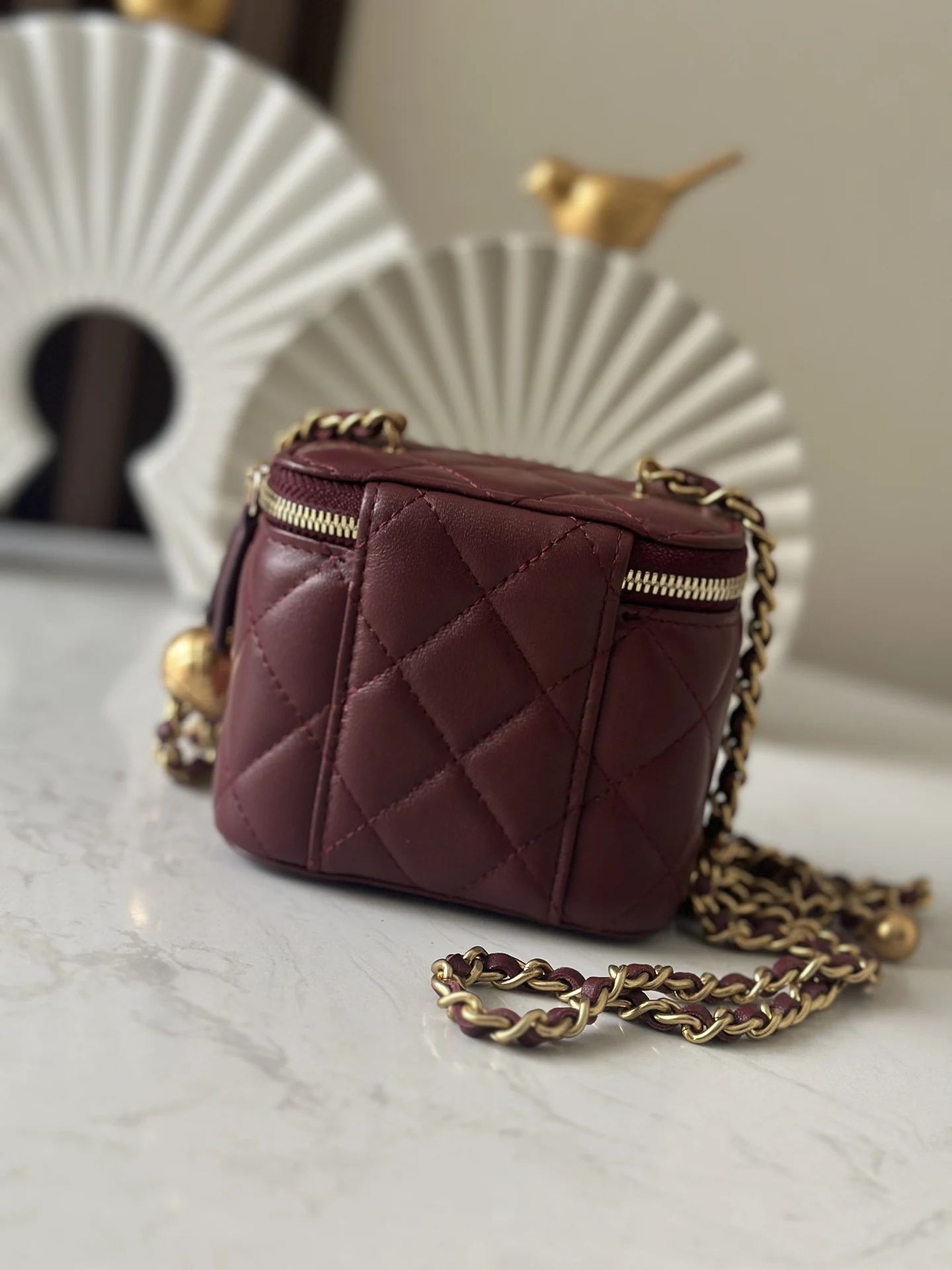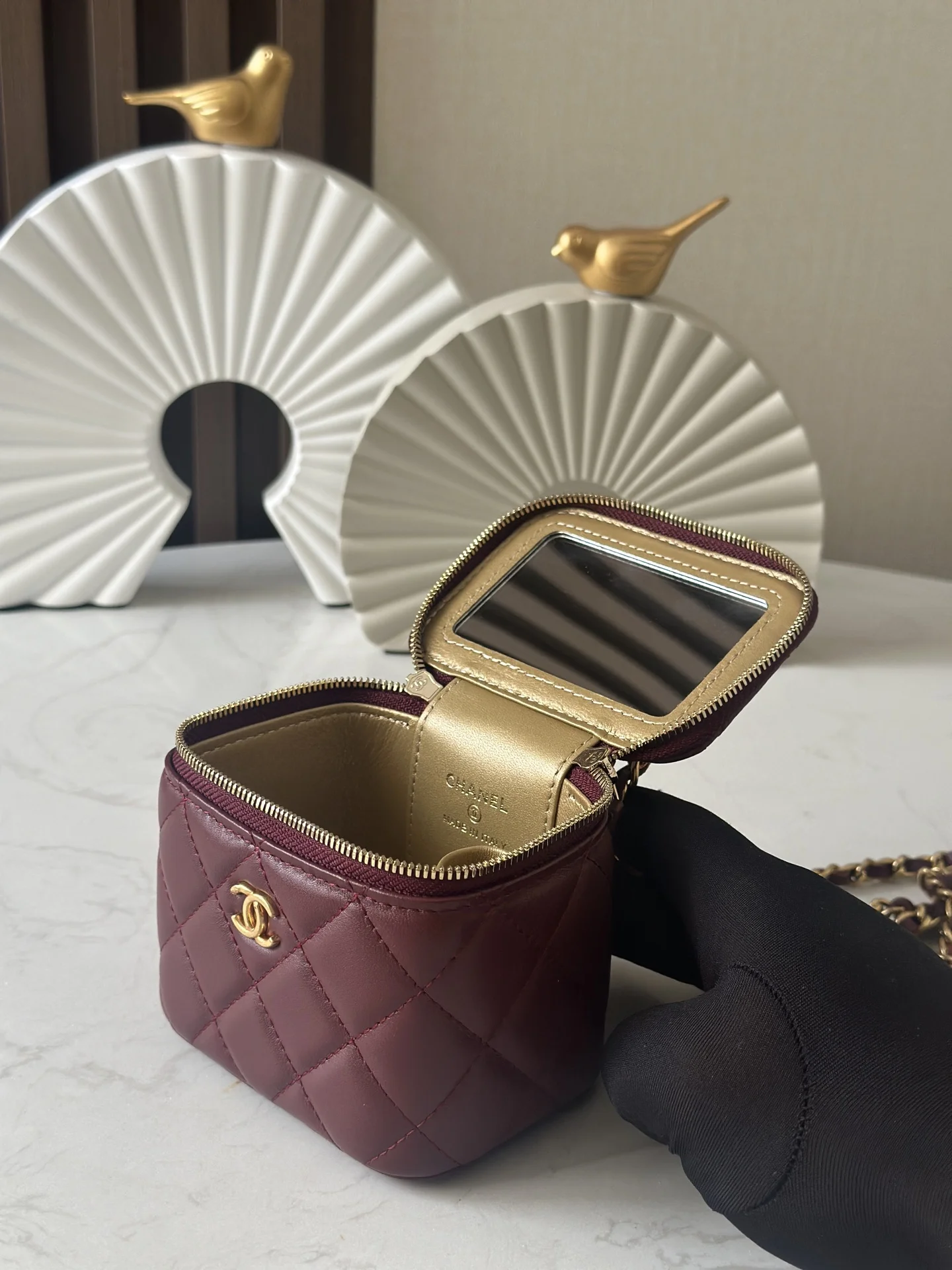 Chip version, latest version synchronized with the counter, hardware and leather are correct. Small Chane mini classic chain box handbag. I was instantly attracted to it when I saw it! This one is very popular online! The real thing is really super cute and it s also quite refreshing to wear! It also has a magical small gold ball that can control the length of the shoulder strap! This little cute has enough capacity to hold lipstick, car keys, and tissues for daily outings. It can t hold a mobile phone, but it s cute enough. Size: 10.5 8.5 7cm Number: 66014 Jujube Red, Wine Red, Gold Chain with packaging