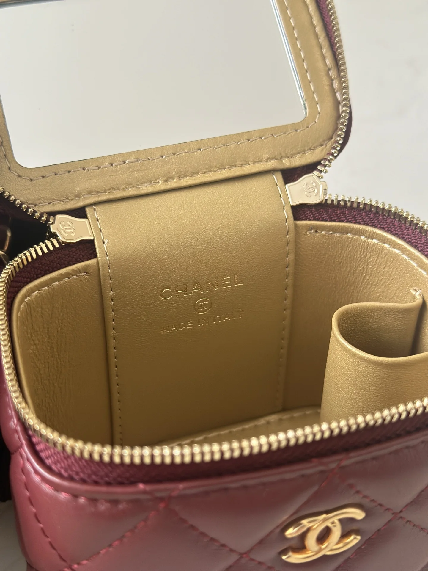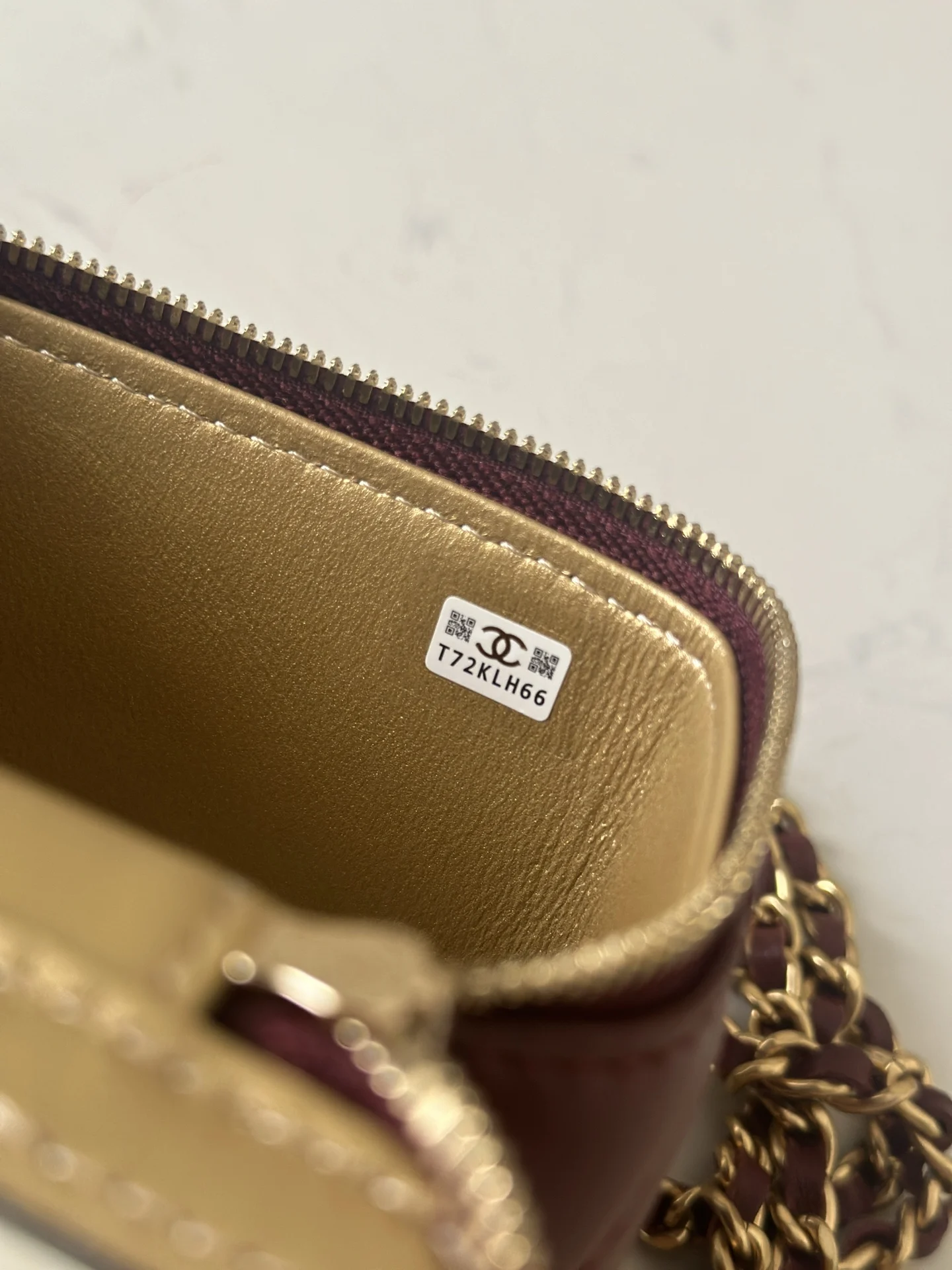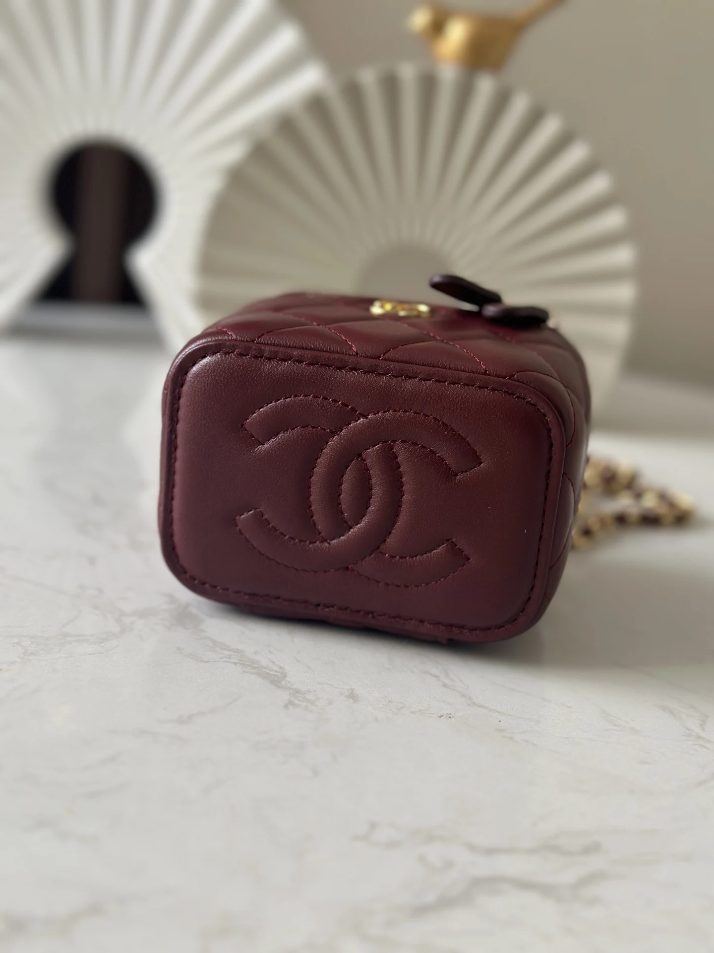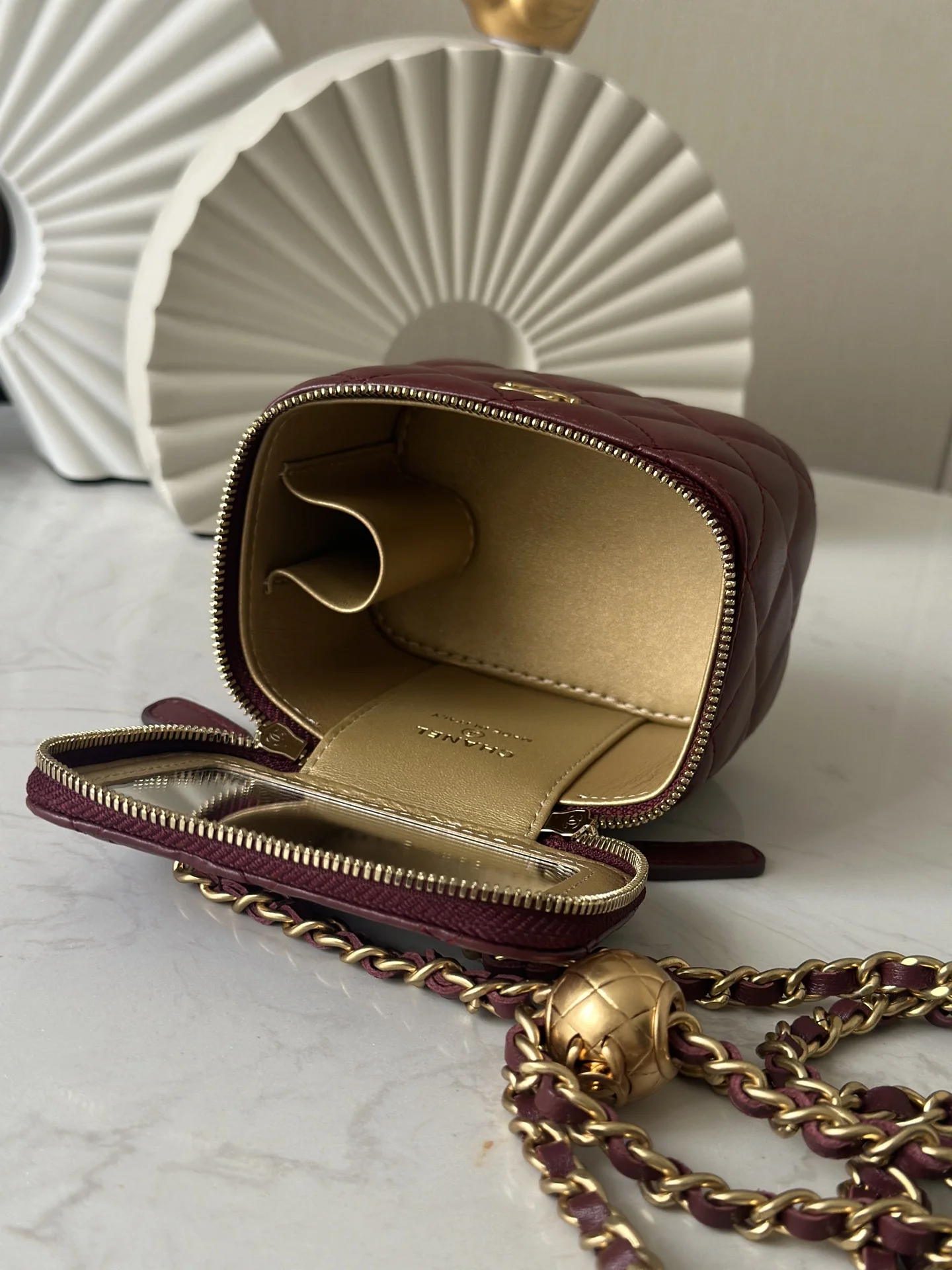 Chip version, latest version synchronized with the counter, hardware and leather are correct. Small Chane mini classic chain box handbag. I was instantly attracted to it when I saw it! This one is very popular online! The real thing is really super cute and it s also quite refreshing to wear! It also has a magical small gold ball that can control the length of the shoulder strap! This little cute has enough capacity to hold lipstick, car keys, and tissues for daily outings. It can t hold a mobile phone, but it s cute enough. Size: 10.5 8.5 7cm Number: 66014 Jujube Red, Wine Red, Gold Chain with packaging