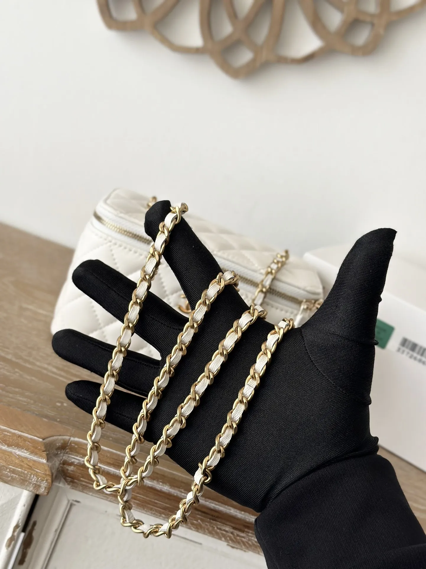 Chip version, authentic hardware and leather, large size in stock. Chane classic chain bead gold ball cosmetic bag, love at first sight! Looks great on! This large, cute bag has great capacity and can hold small items such as lipstick, car keys, and tissues. It can also fit a large mobile phone! It also has a magical small gold ball that can adjust the length of the shoulder strap, making it long or short. Size: 16 9.5 8cm. Number: 66015 White.