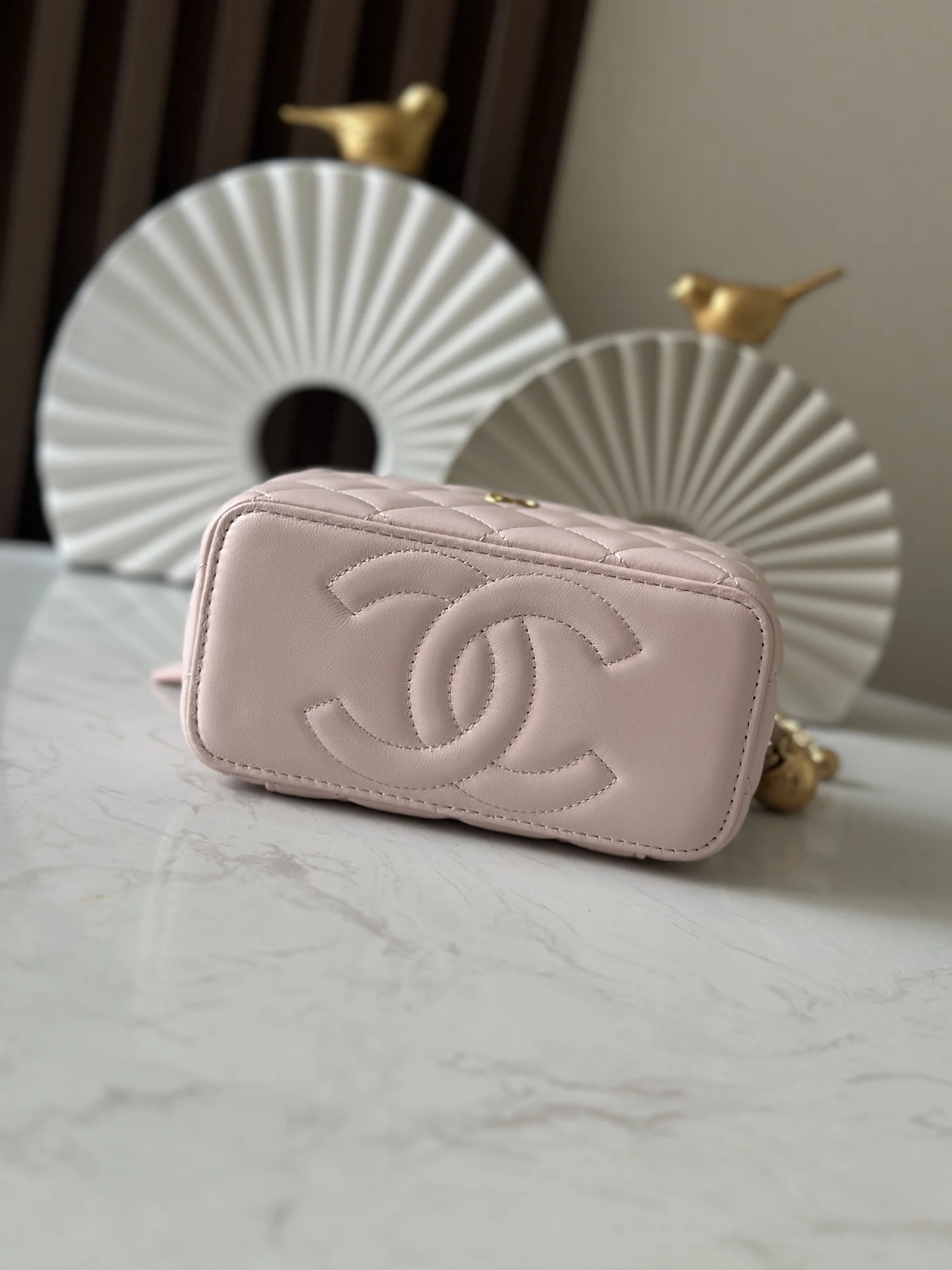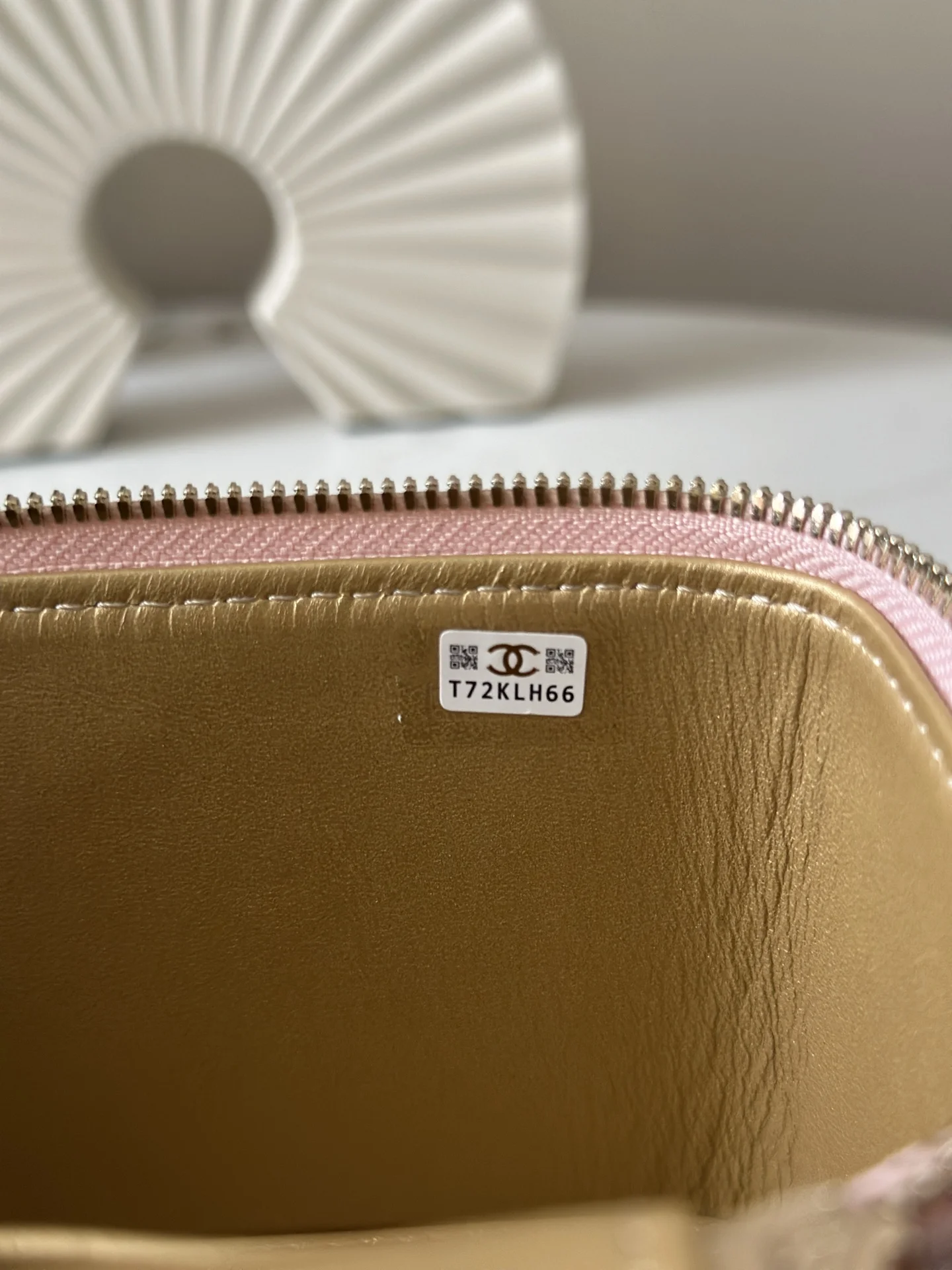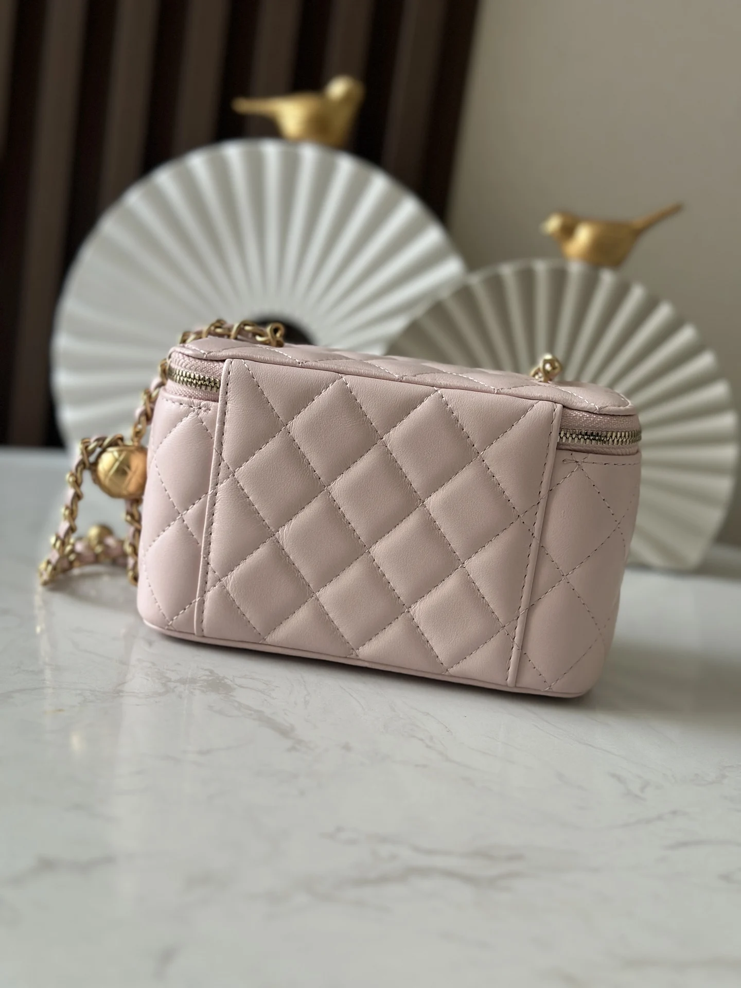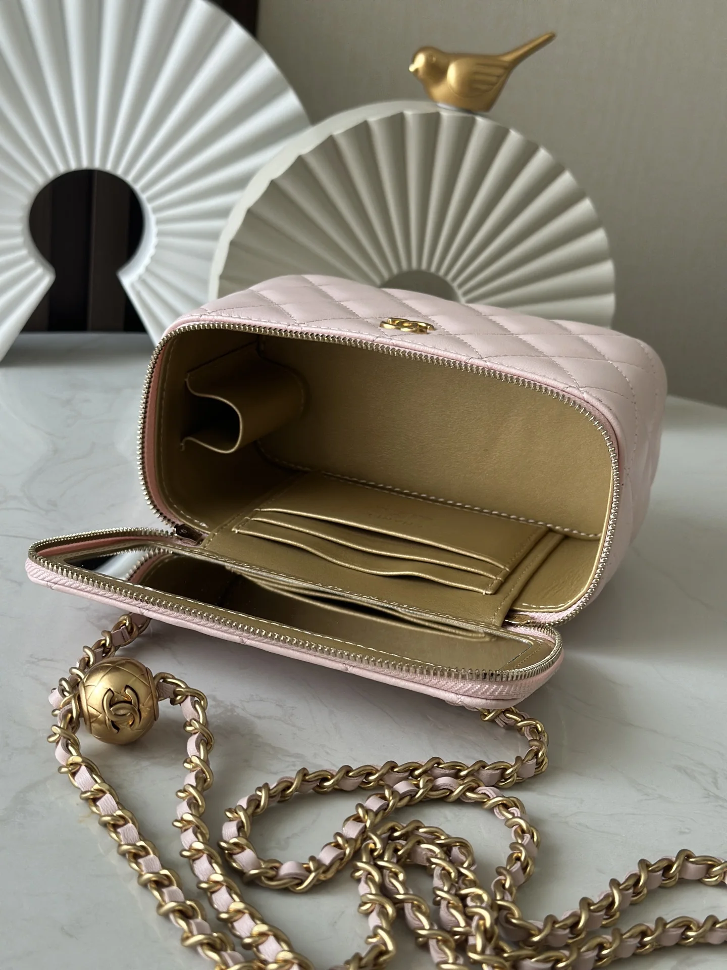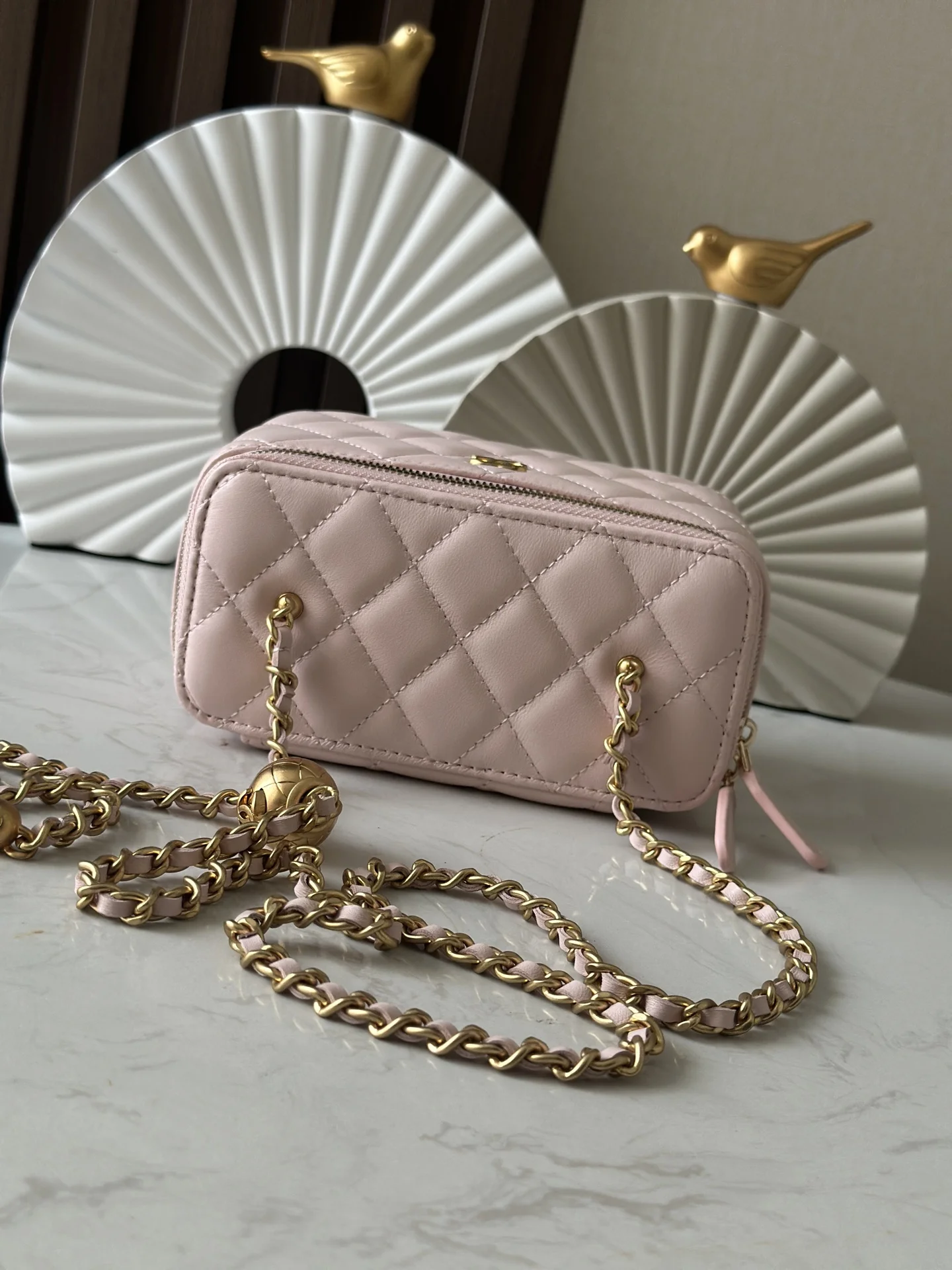 Chip version, authentic hardware and leather, large size in stock. Chane classic chain bead gold ball cosmetic bag, love it at first sight! It s also quite refreshing on the body! This large and cute bag has a very good capacity. It can hold small items such as lipstick, car keys, and tissues that you usually take out. It can also hold a large mobile phone! There is also a magical small gold ball that can adjust the length of the shoulder strap, which can be long or short. Size 16 9.5 8cm. Number: 66015 Pink