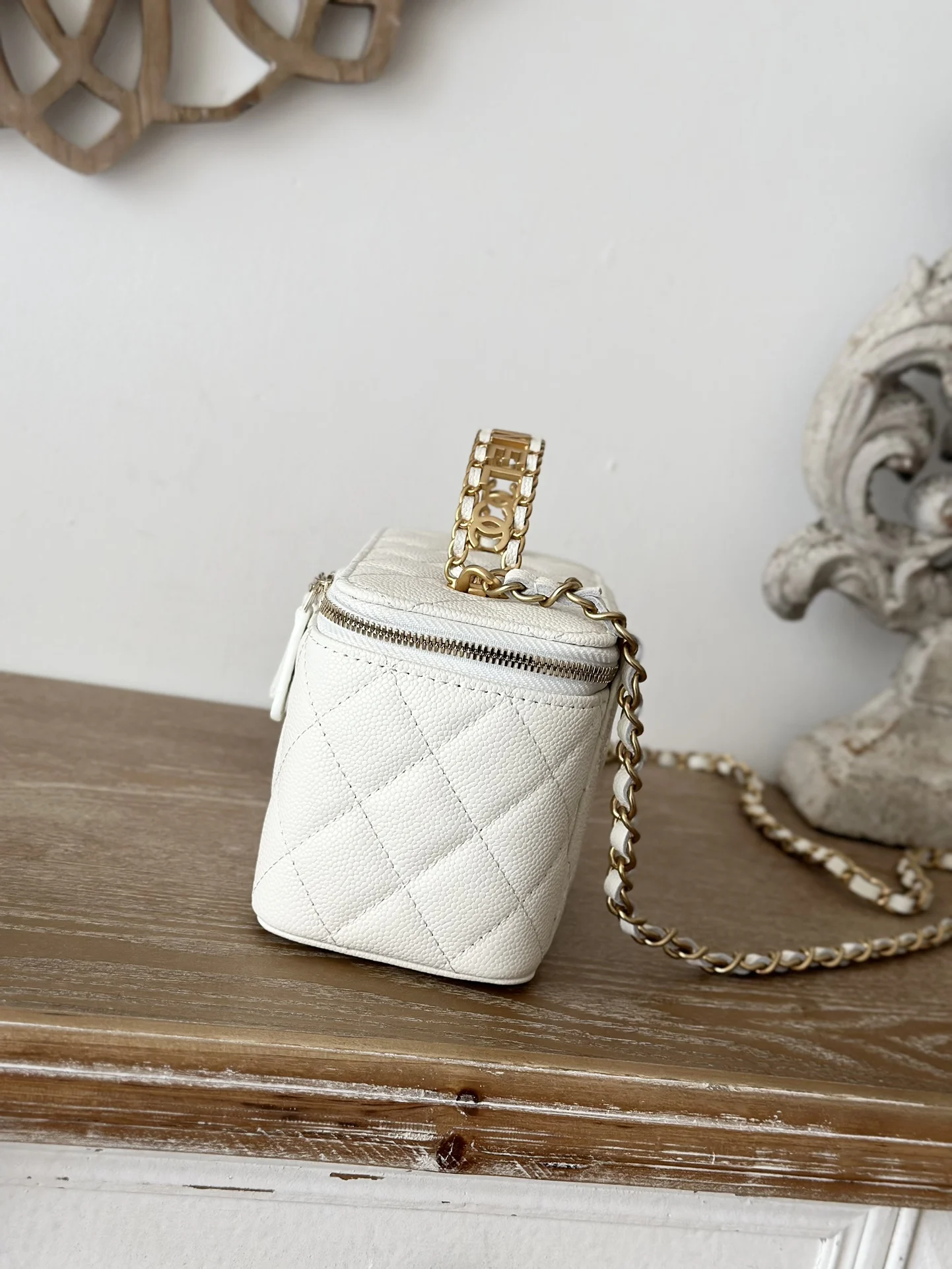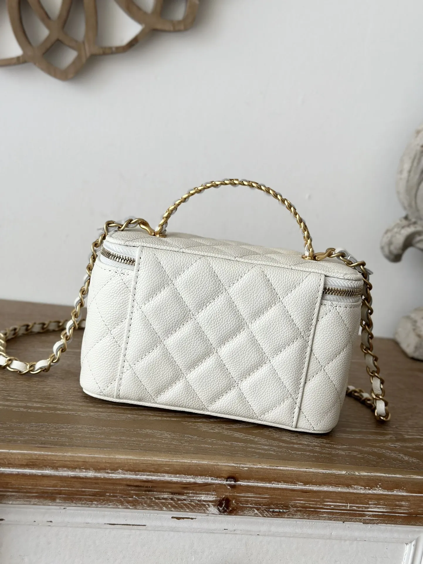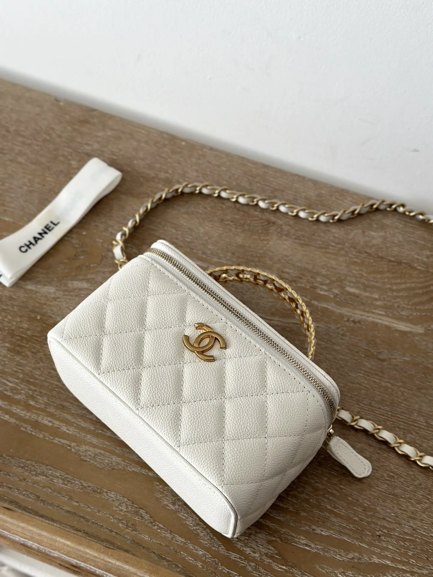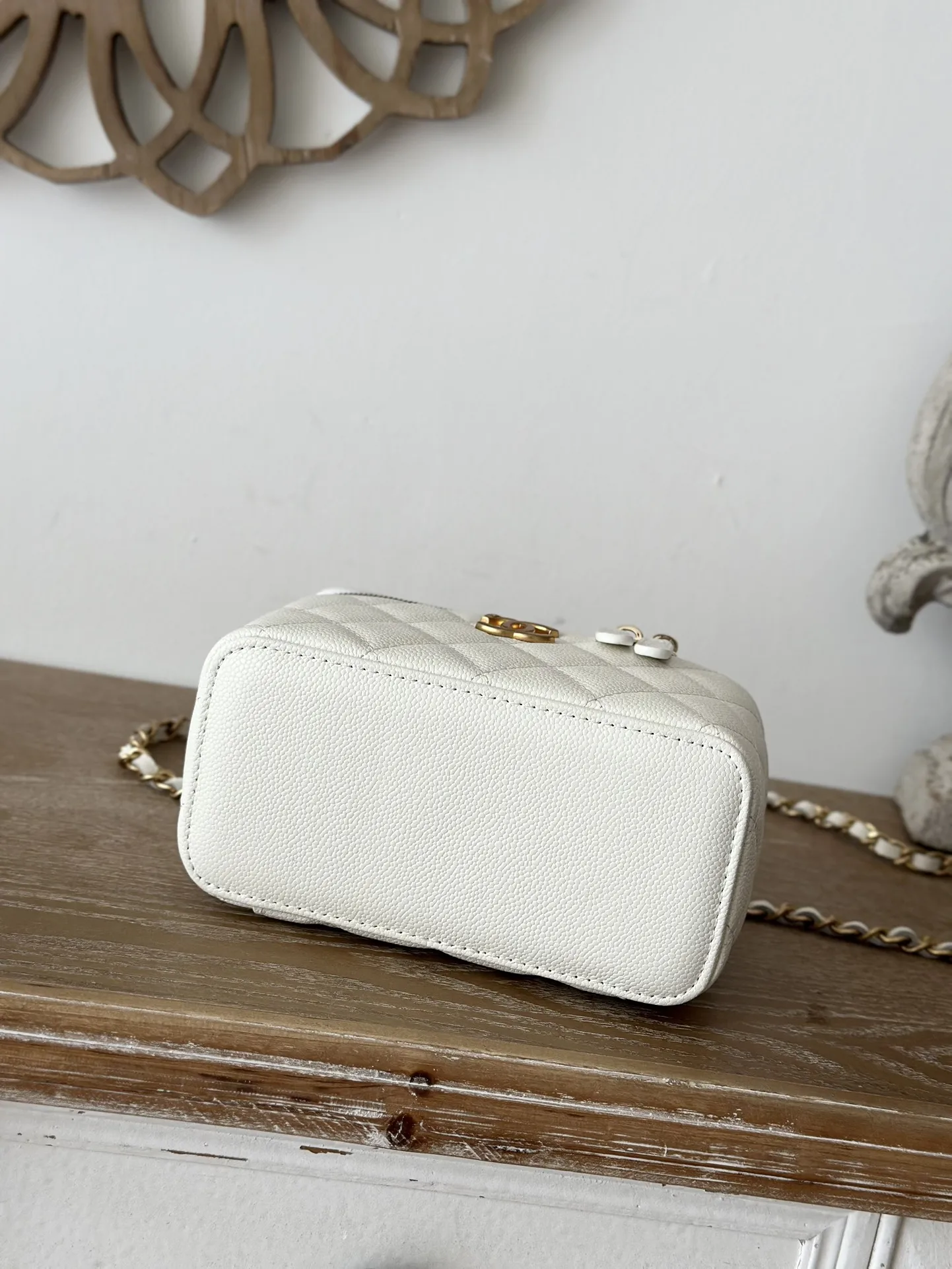 Chip version Chanel 2022p new cosmetic box bag, new Chanel lambskin handle letter box bag. The lambskin is here! The new handle with CC logo 58 is very delicate and the capacity is excellent. Size: 16*9.5*8, Style number: 66017. Color: White, grained leather. Comes with packaging.