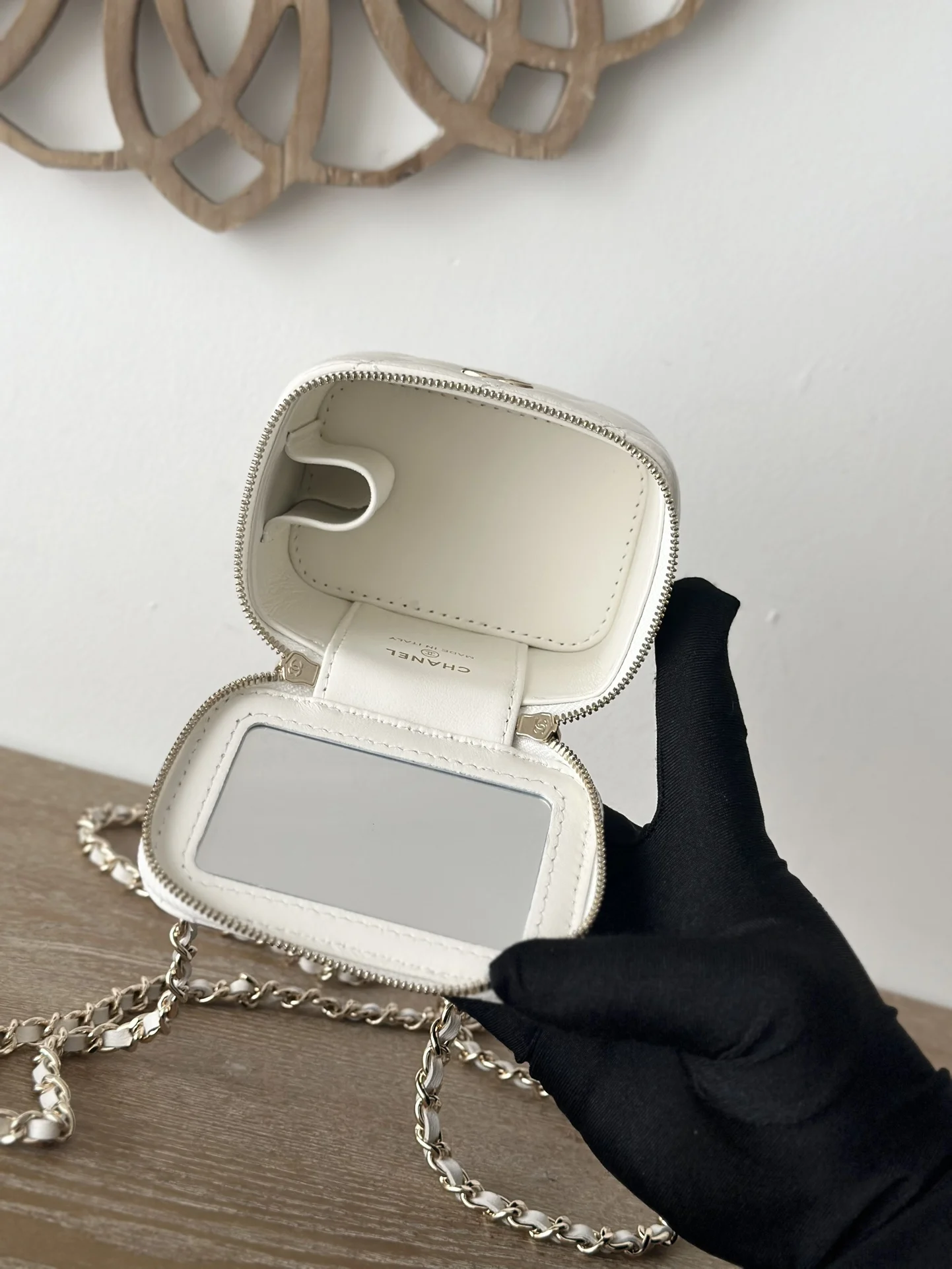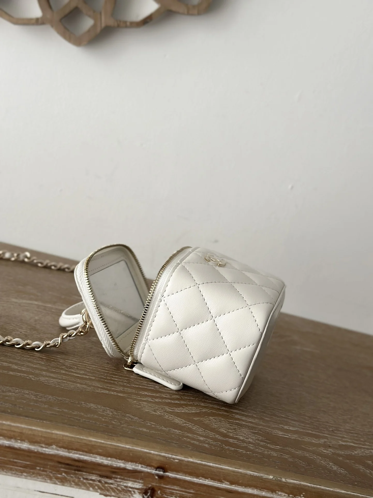 Chip version of the new small chain vanity case from Chane, with a built-in makeup mirror. This new box bag even has a handle! I was completely obsessed when I got the real thing..