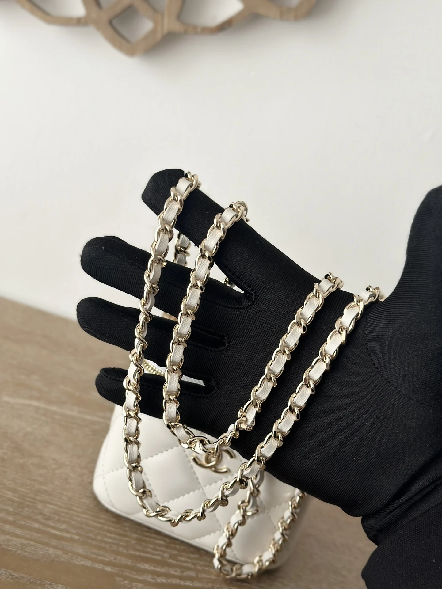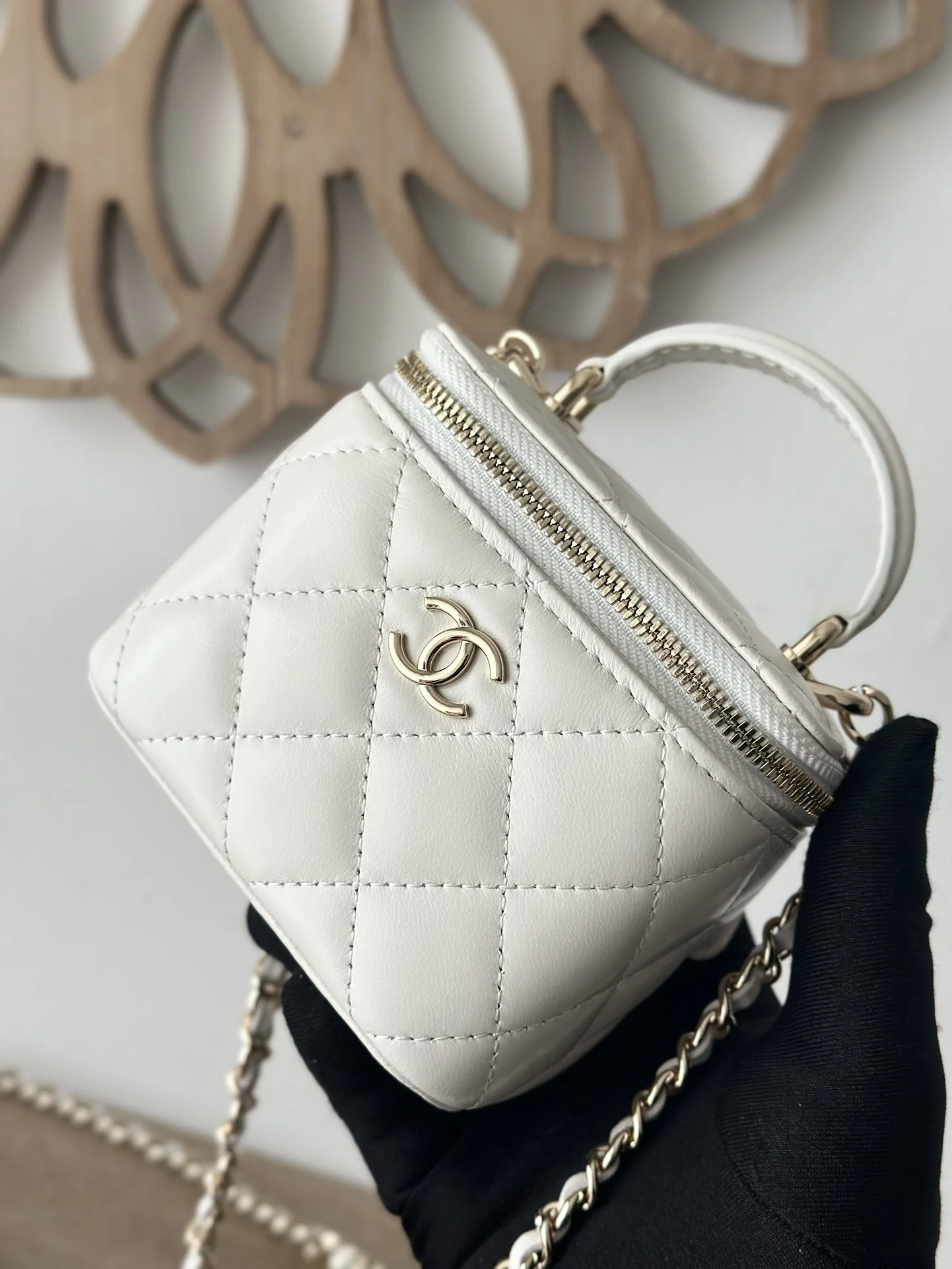 Chip version of the new small chain vanity case from Chane, with a built-in makeup mirror. This new box bag even has a handle! I was completely obsessed when I got the real thing, it has a completely different temperament, a surprise! Can be worn on the shoulder, crossbody, or carried by hand! Can hold small items such as lipstick, powder compact, keys, etc. for going out. The main point is that a large mobile phone can also fit inside. Size: 10 7 9cm. Number: 66020. White with packaging.