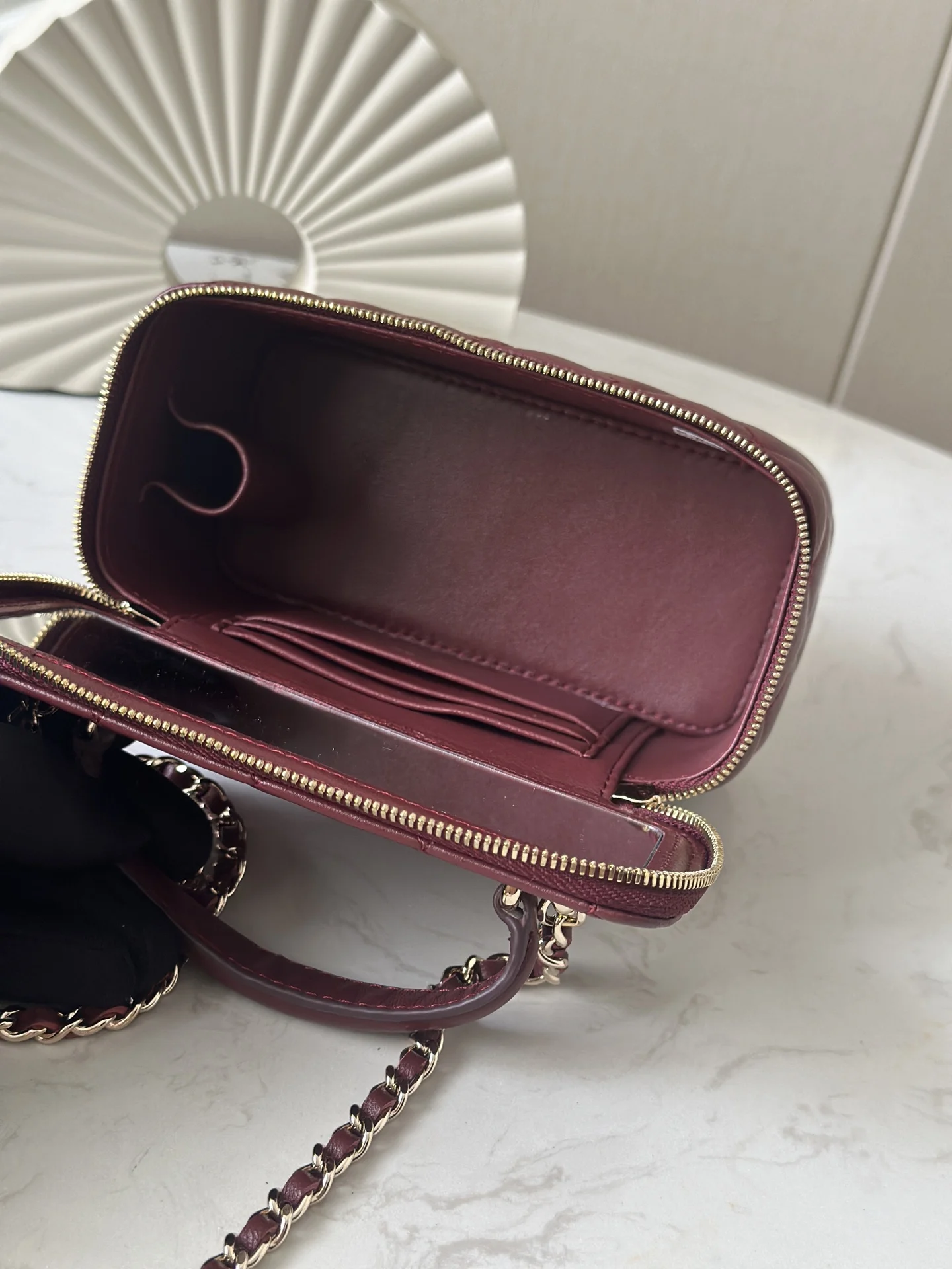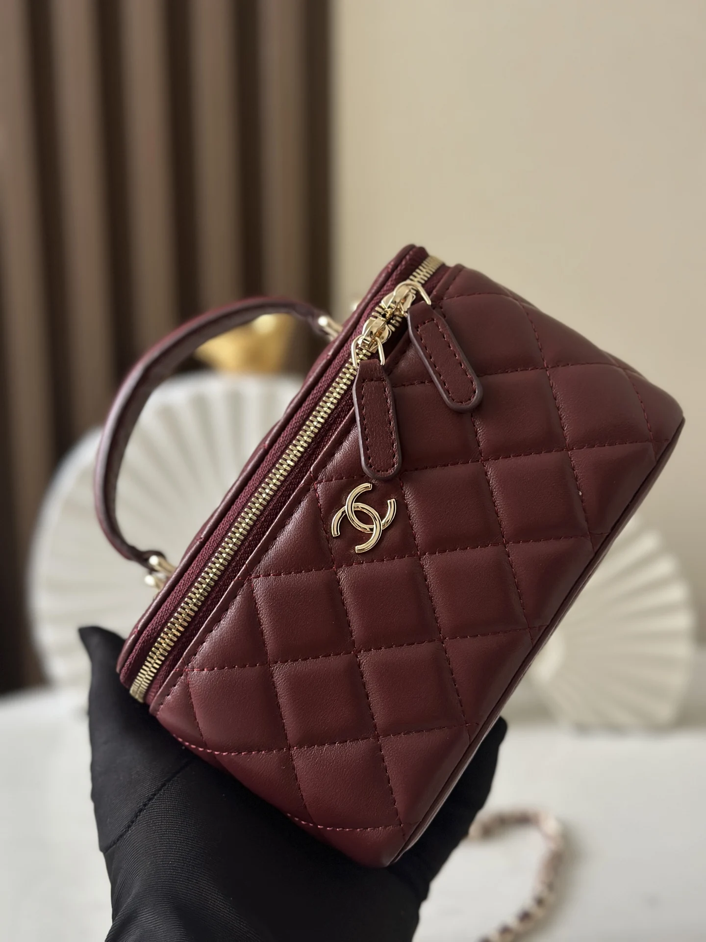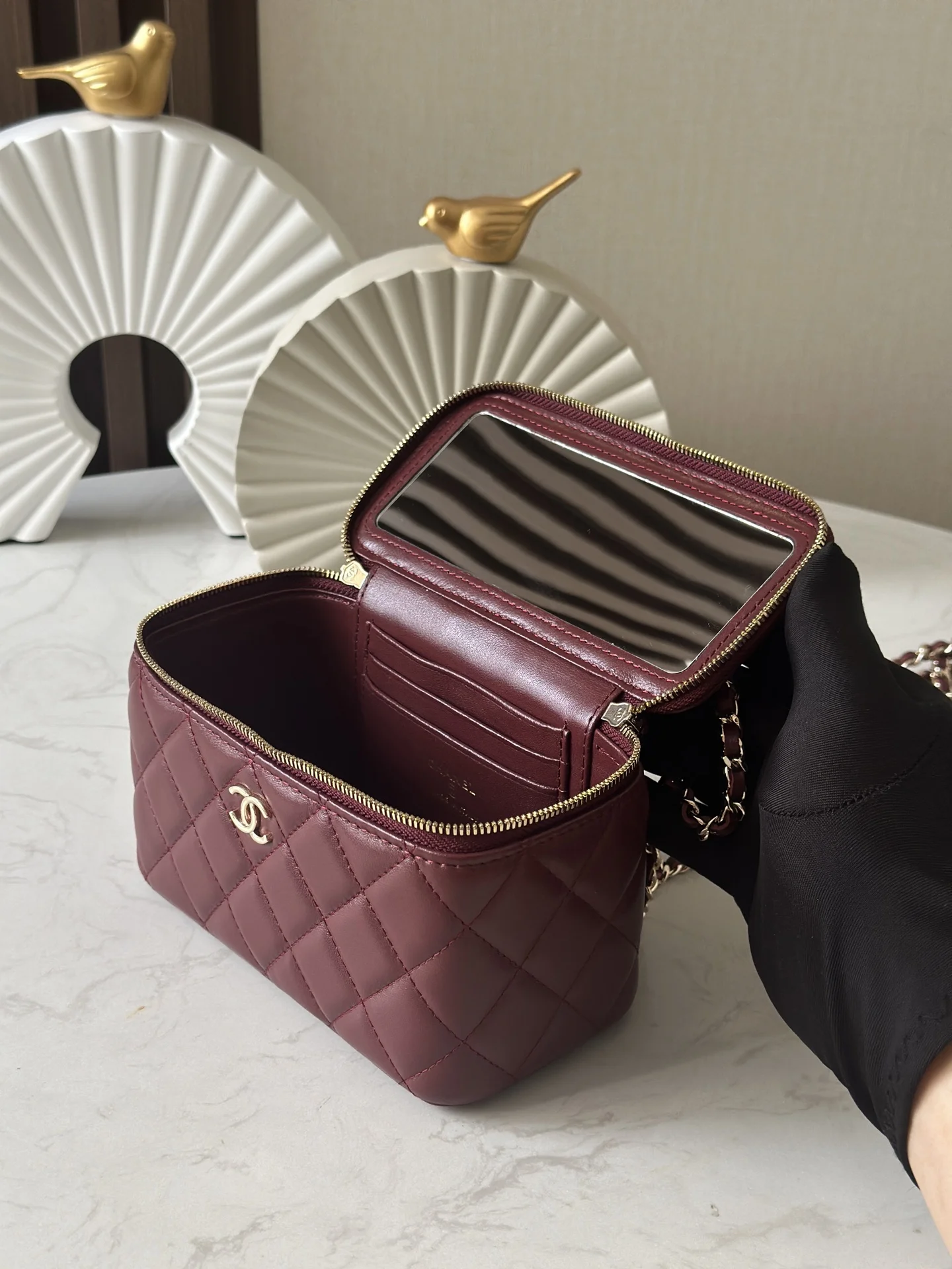 The new large chain cosmetic bag from Chanel s chip series features a built-in makeup mirror. This new box bag even has a handle! The actual product is completely captivating, offering a completely different temperament and a surprising and stunning look! It can be worn on the shoulder, crossbody, or carried by hand! It can hold small items such as powder compacts and keys for going out. Most importantly, it can also fit a large mobile phone. Dimensions: 9.5 17 8cm. Code: 66021. Date Red, Wine Red. Comes with packaging.