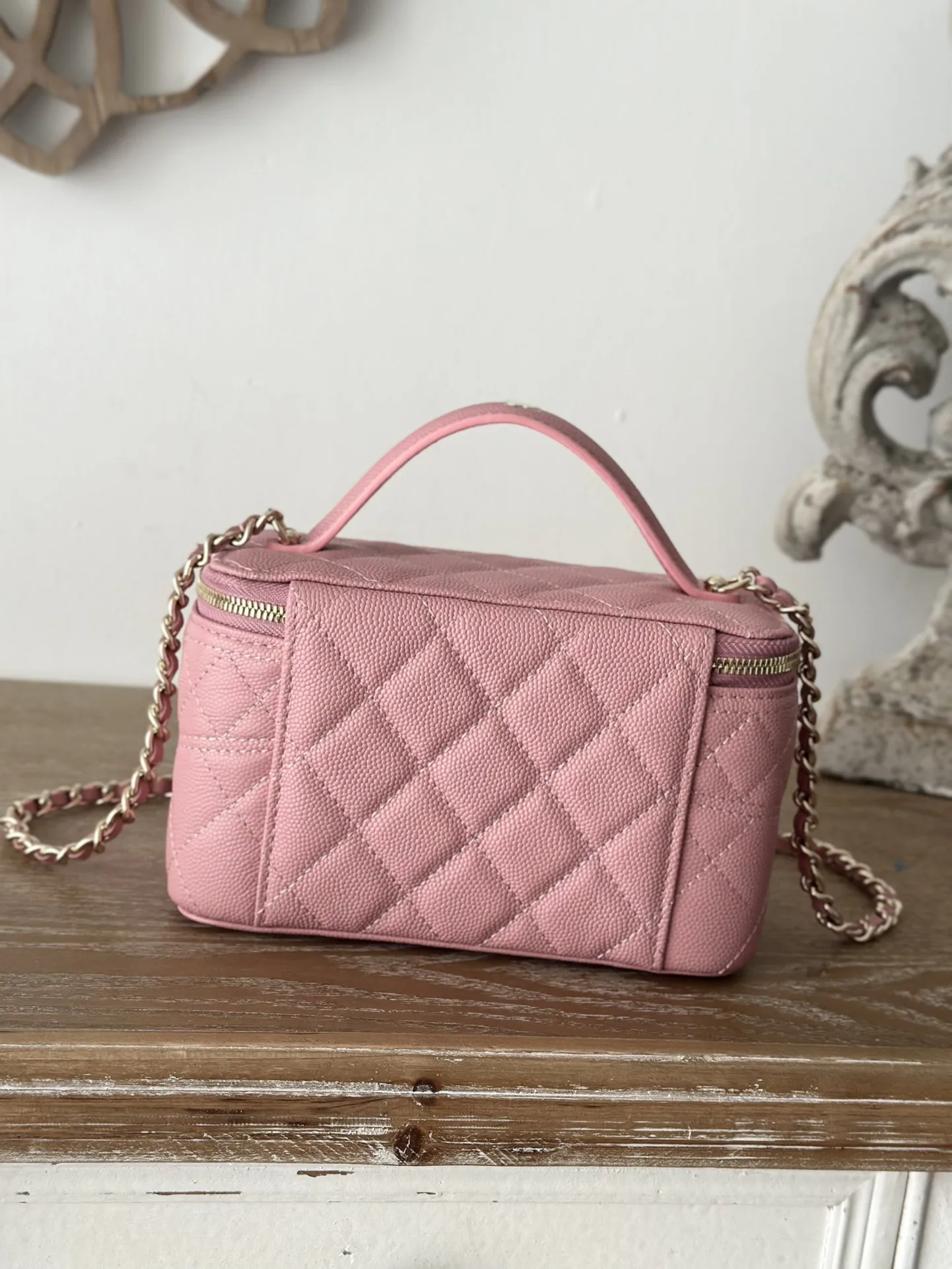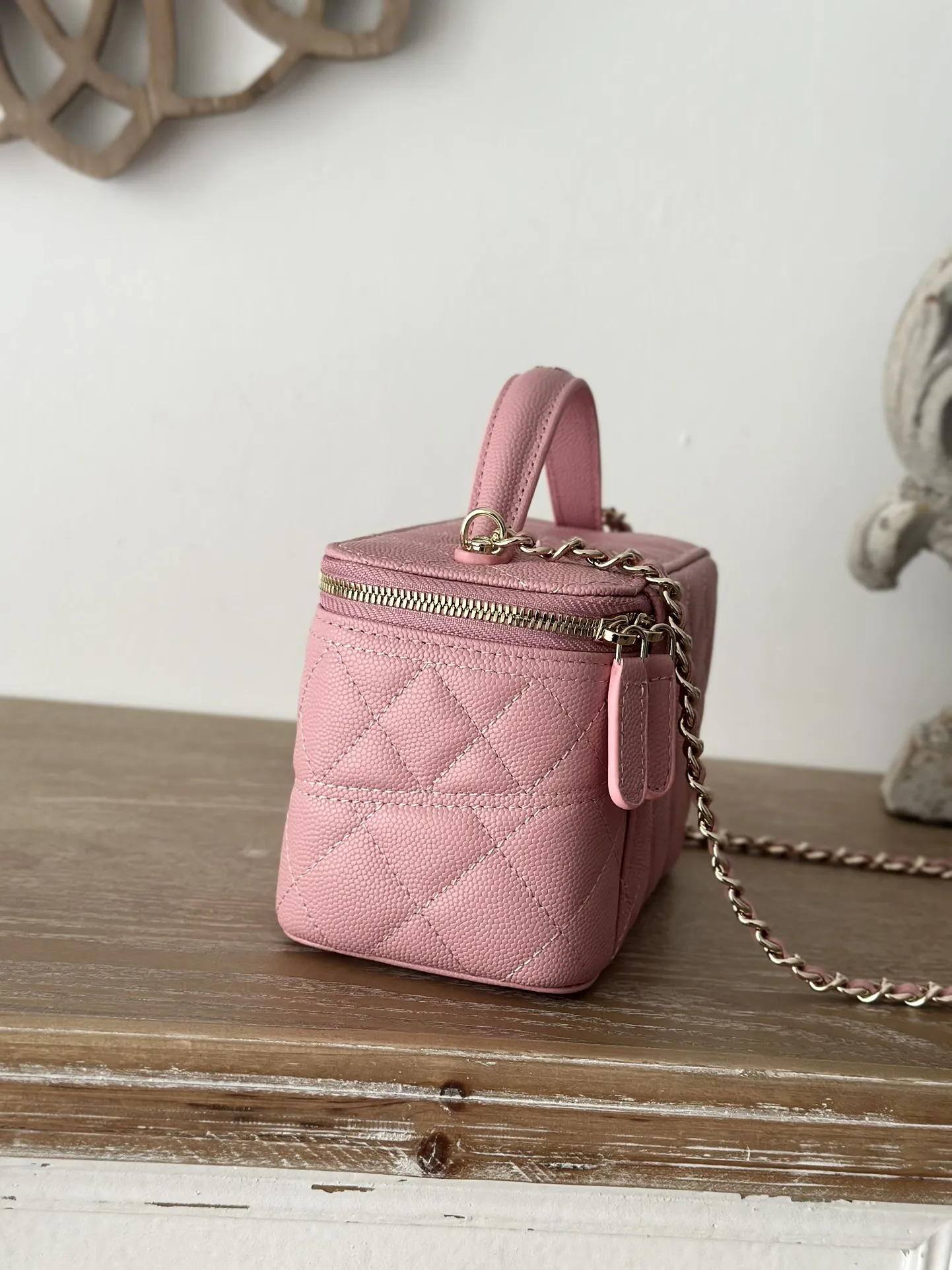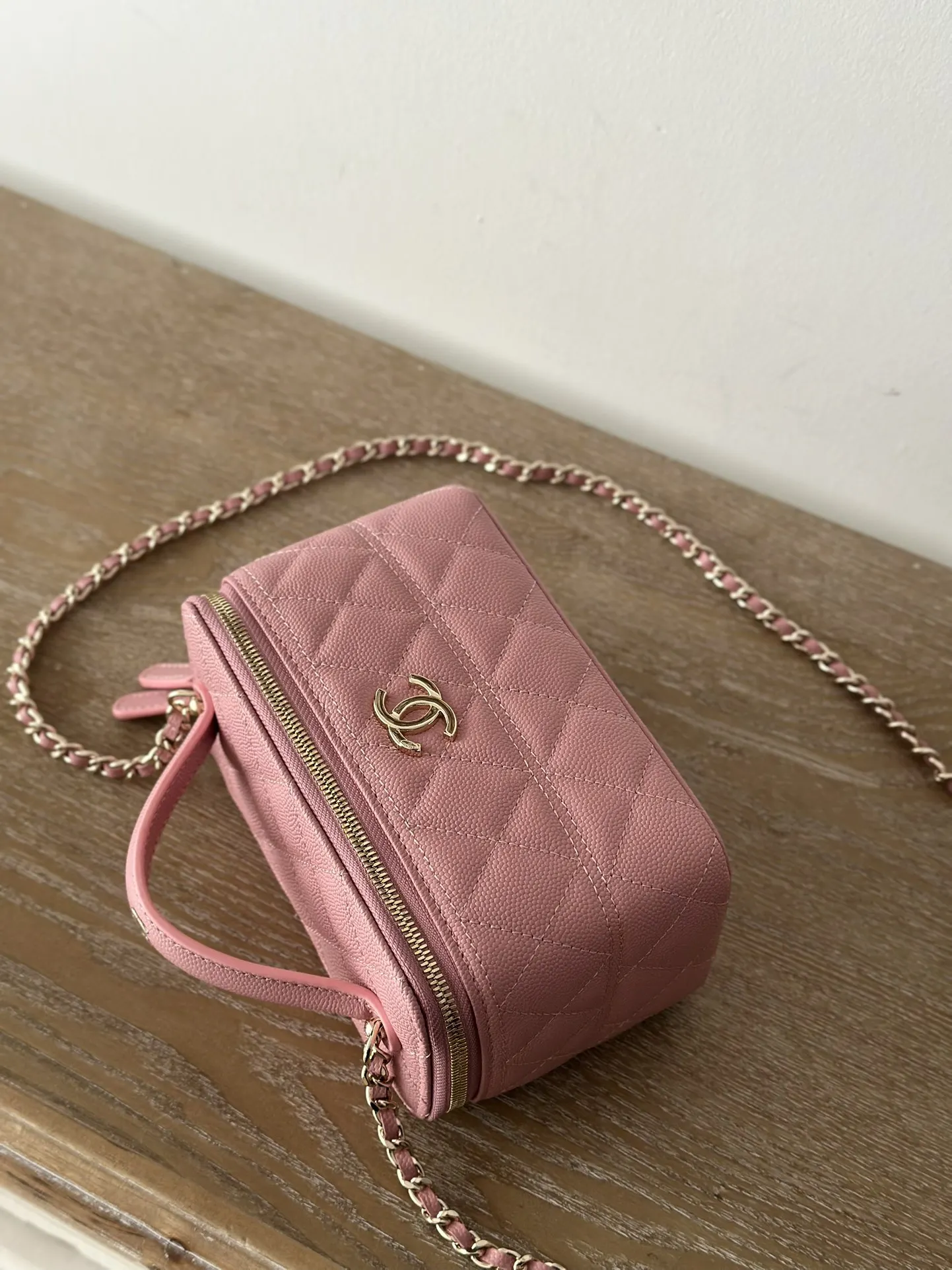 CHANEL 25c Lunch Box Bag. New crossbody lipstick bag with chain, suitable for shoulder, crossbody, or hand carry. A fashionable runway-inspired shopping bag in durable grained calfskin, exuding high-end elegance and sophistication. This classic and timeless design complements any seasonal outfit. A must-have. Dimensions: 9.5 17 8cm. Style code: 66022, Pink.