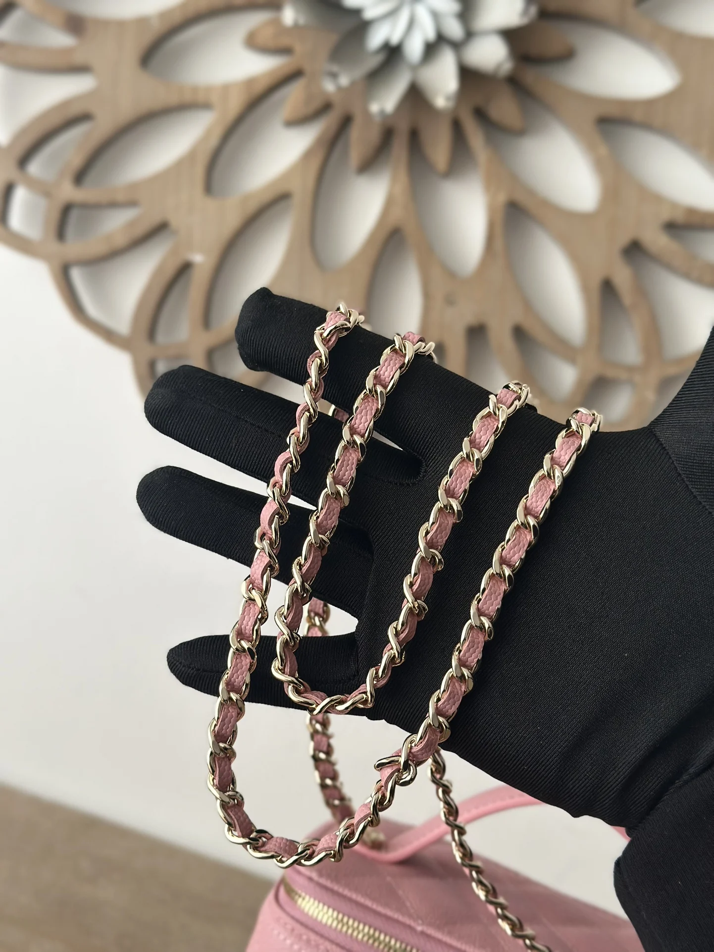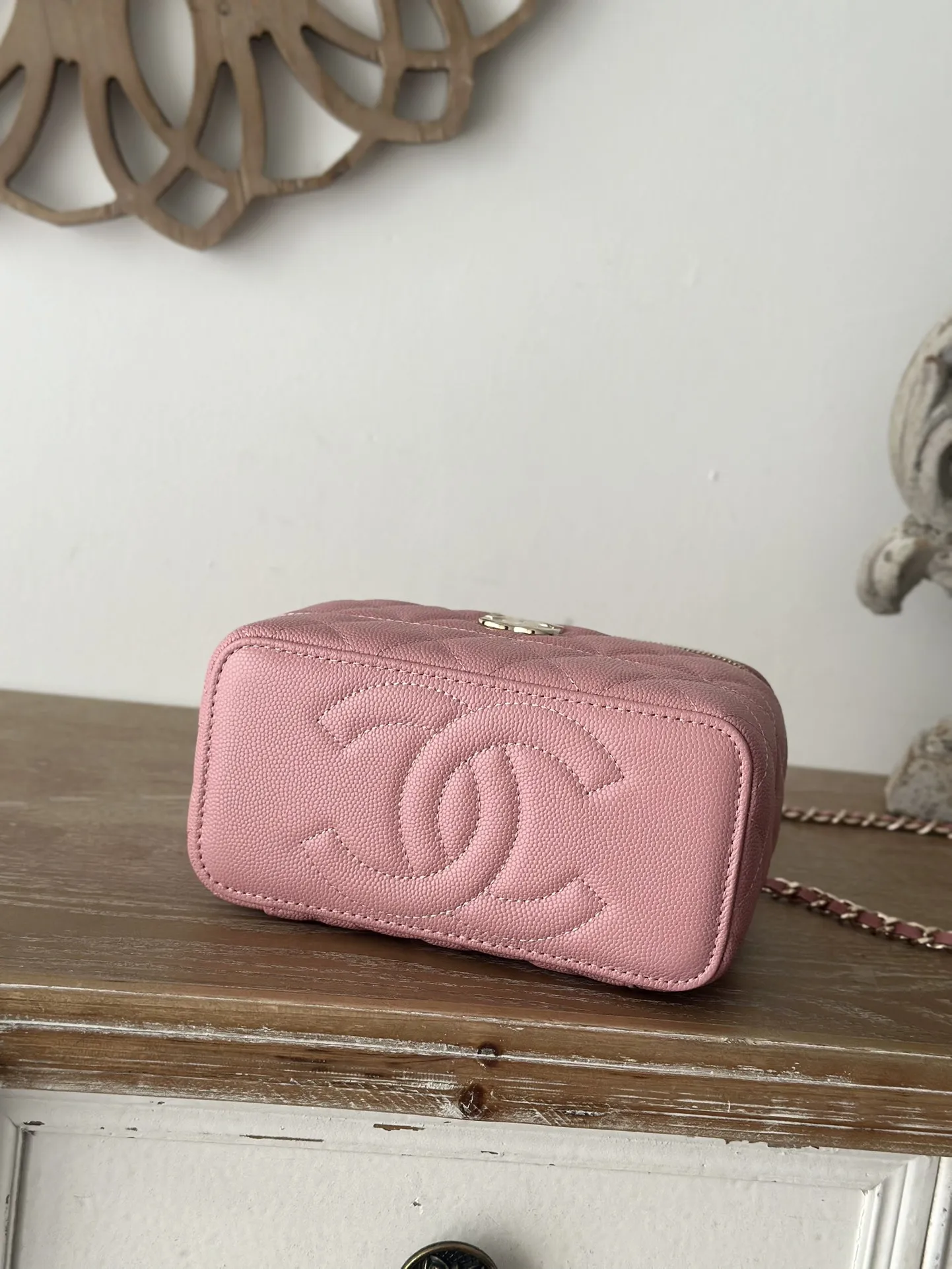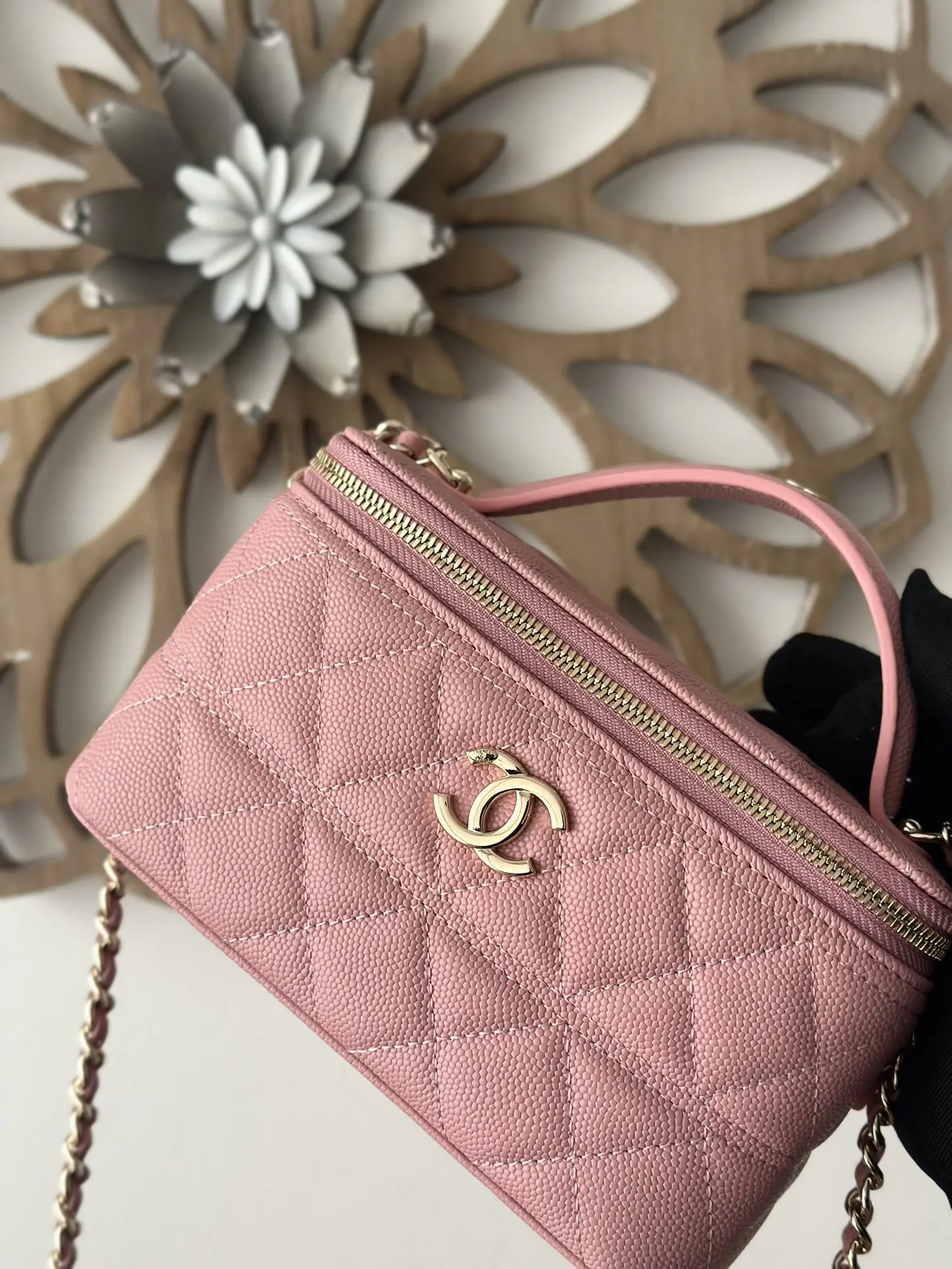 CHANEL 25c Lunch Box Bag. New crossbody lipstick bag with chain, suitable for shoulder, crossbody, or hand carry. A fashionable runway-inspired shopping bag in durable grained calfskin, exuding high-end elegance and sophistication. This classic and timeless design complements any seasonal outfit. A must-have. Dimensions: 9.5 17 8cm. Style code: 66022, Pink.