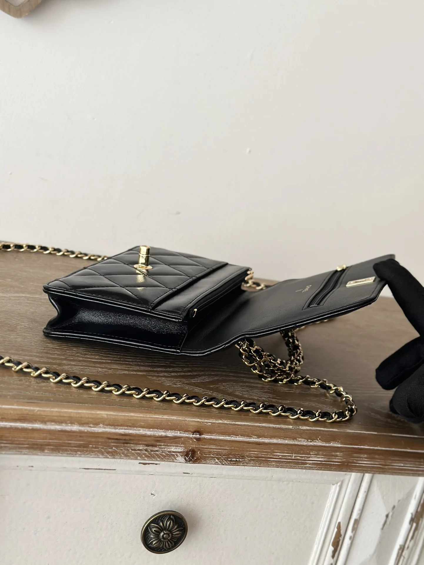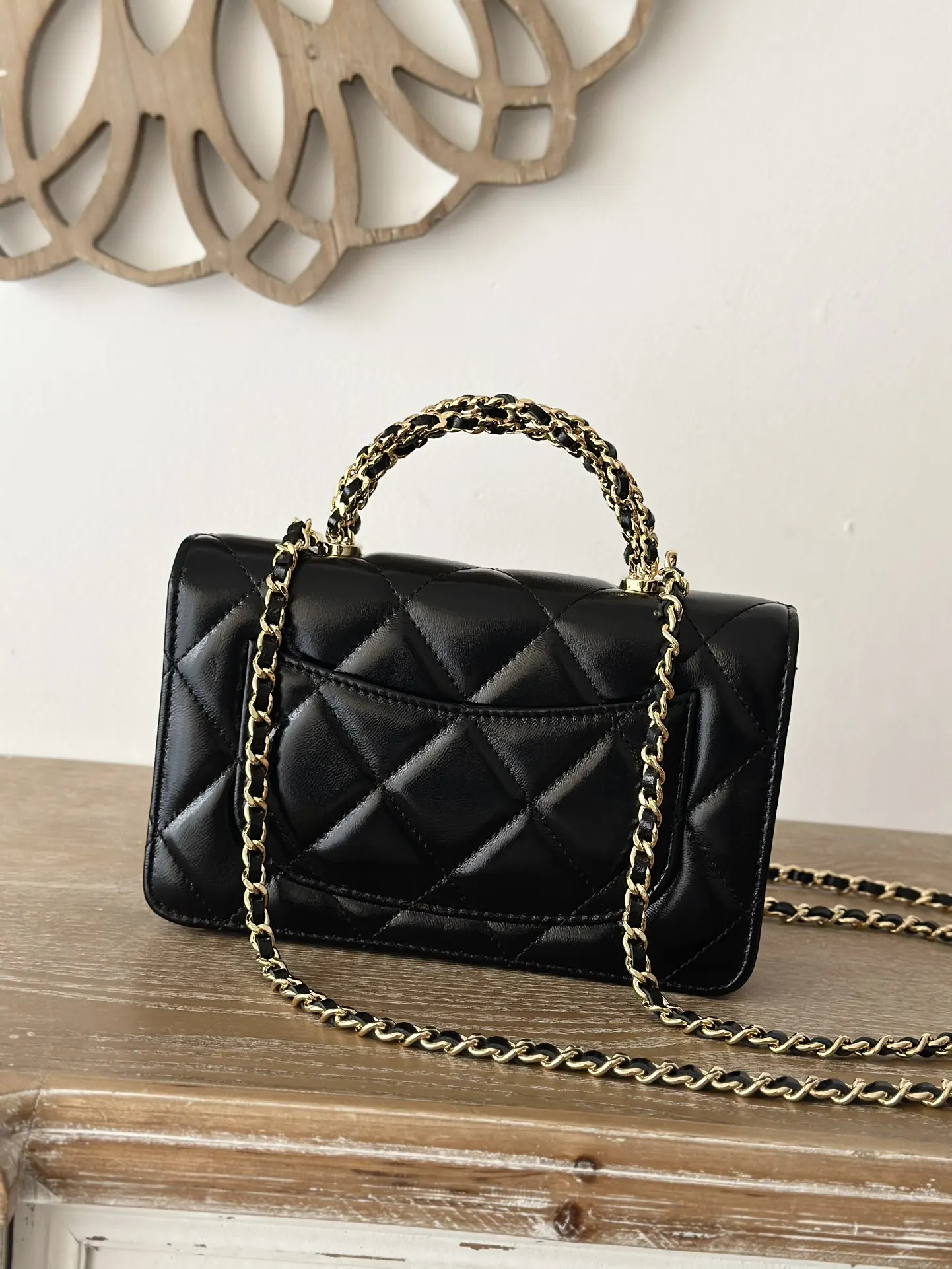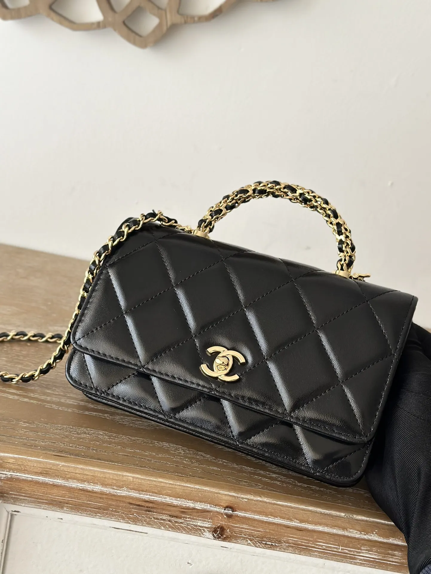 CHANEL 24B WOC with braided handle, chip version, made of waxed sheepskin with a strong, glossy, and durable finish. The twisted handle is composed of multiple leather-woven chains, offering both design and texture. The capacity meets daily needs. Small and exquisite, suitable for all commuting outfits. Dimensions: 12*19*3.5cm. Style number: 66024. Black, with packaging.