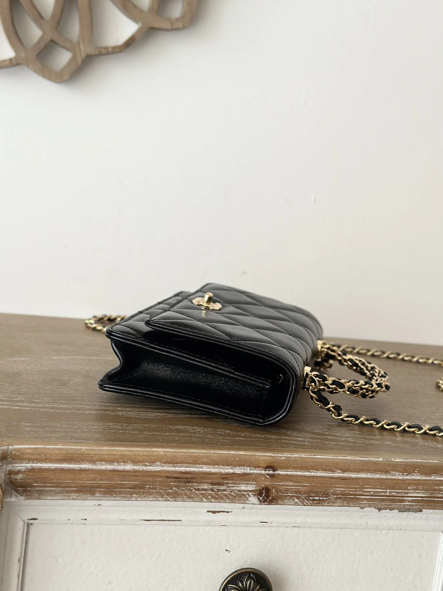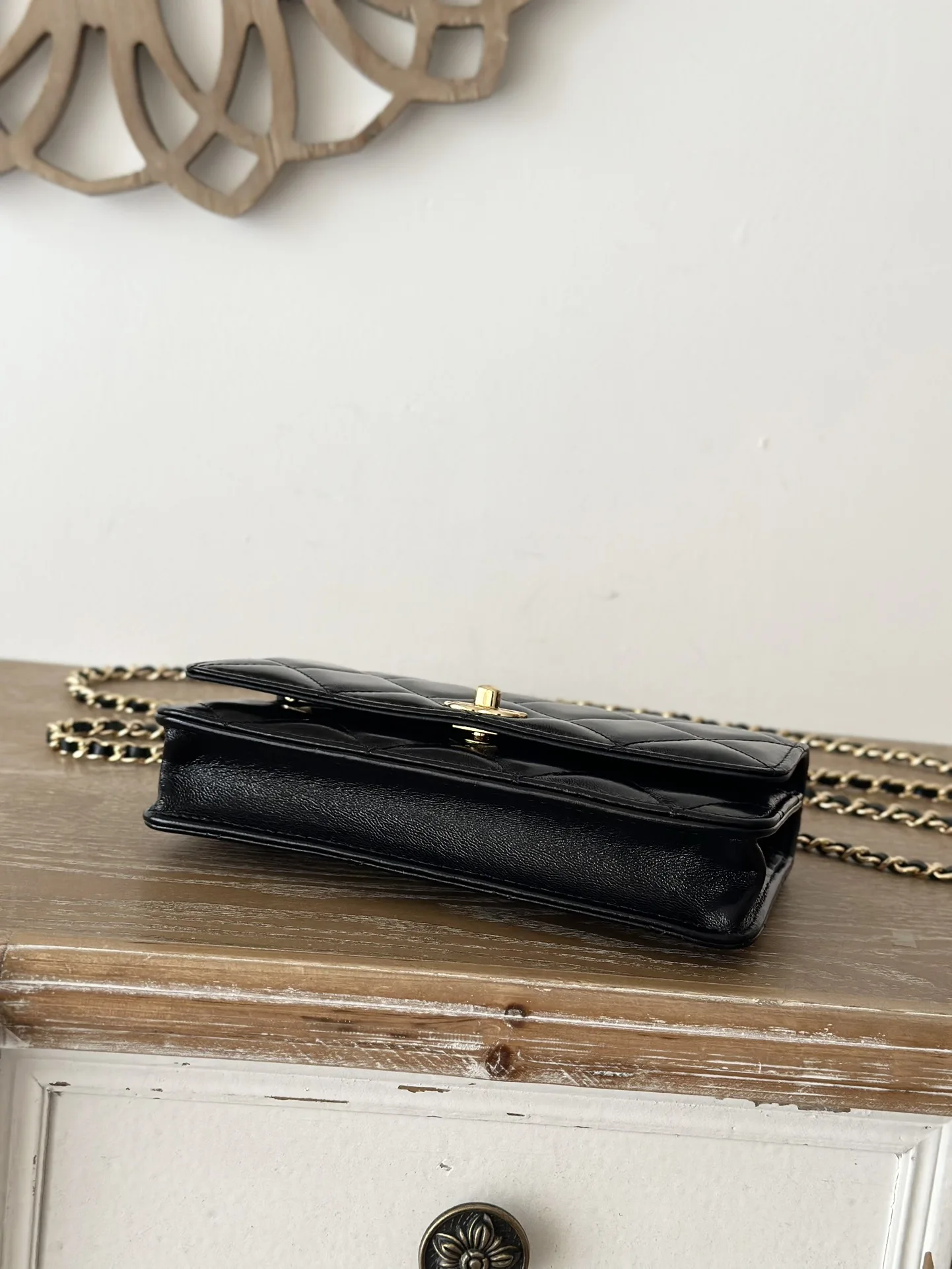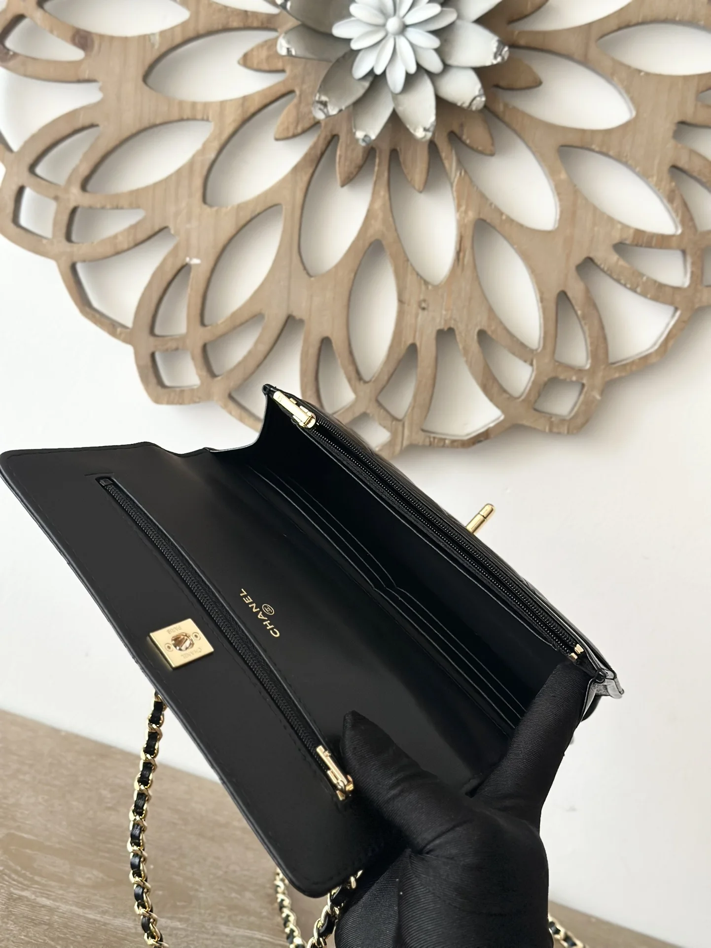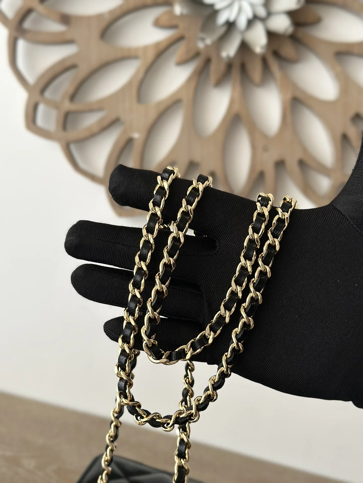 CHANEL 24B WOC with braided handle, chip version, made of waxed sheepskin with a strong, glossy, and durable finish. The twisted handle is composed of multiple leather-woven chains, offering both design and texture. The capacity meets daily needs. Small and exquisite, suitable for all commuting outfits. Dimensions: 12*19*3.5cm. Style number: 66024. Black, with packaging.