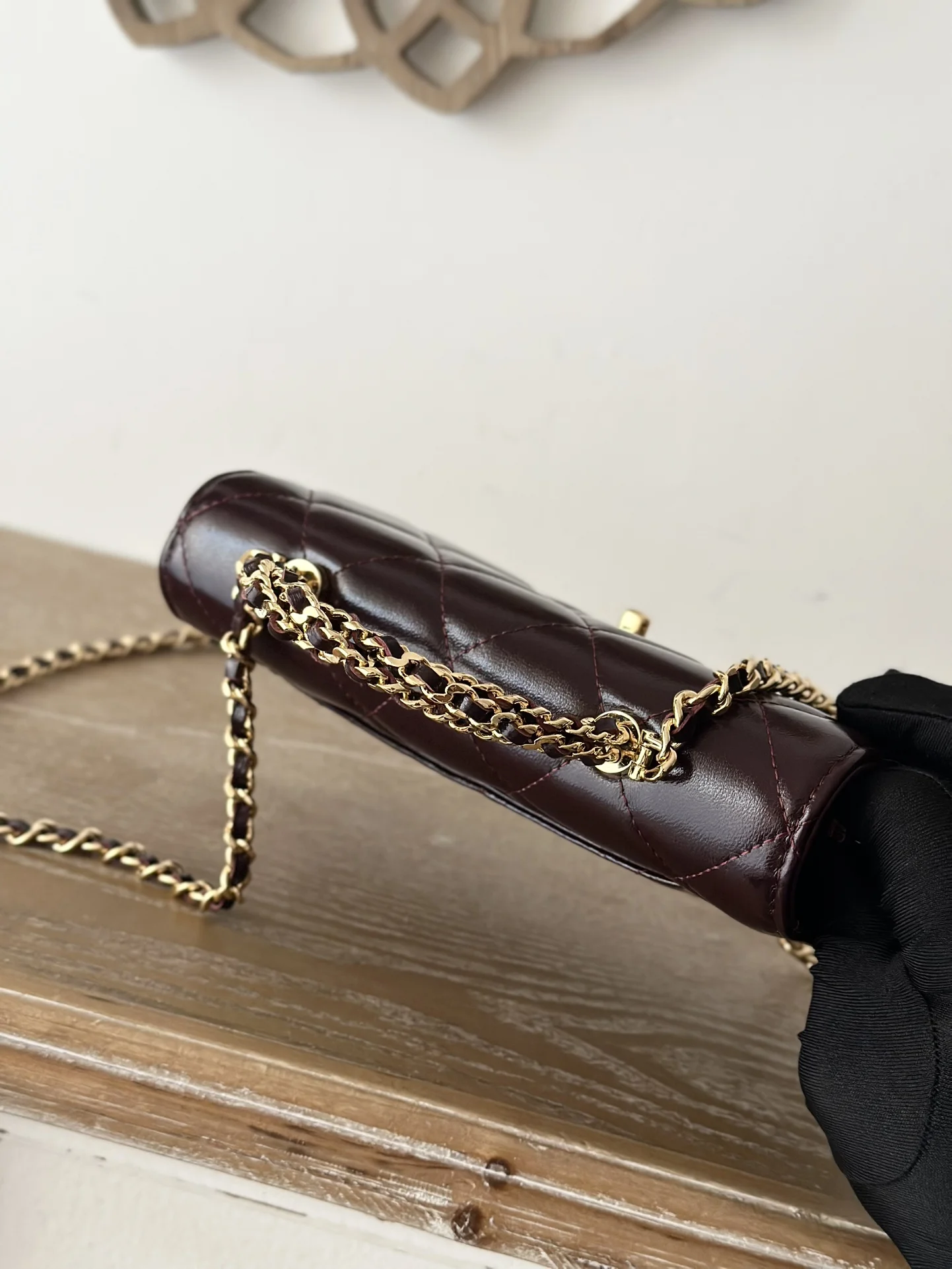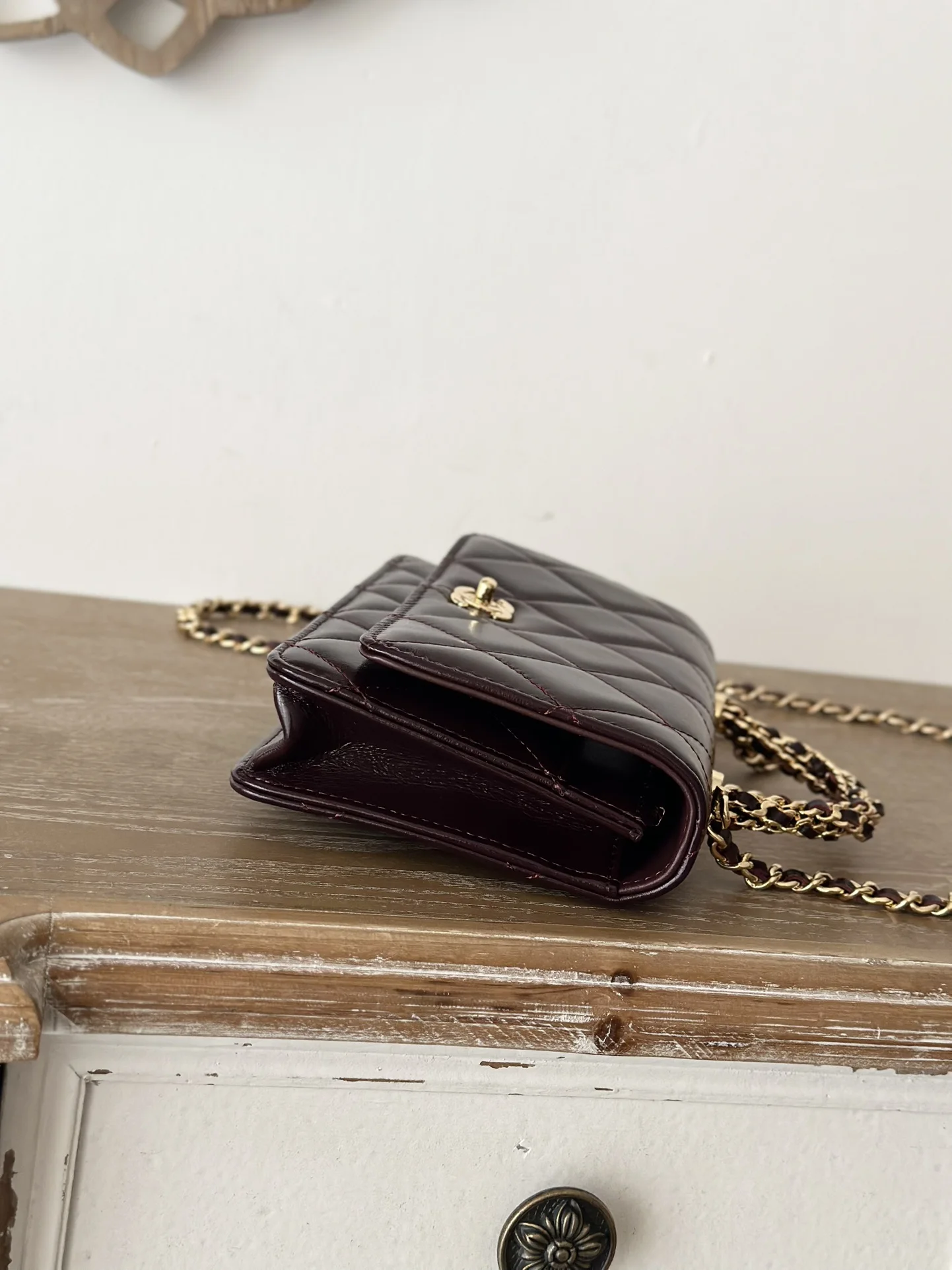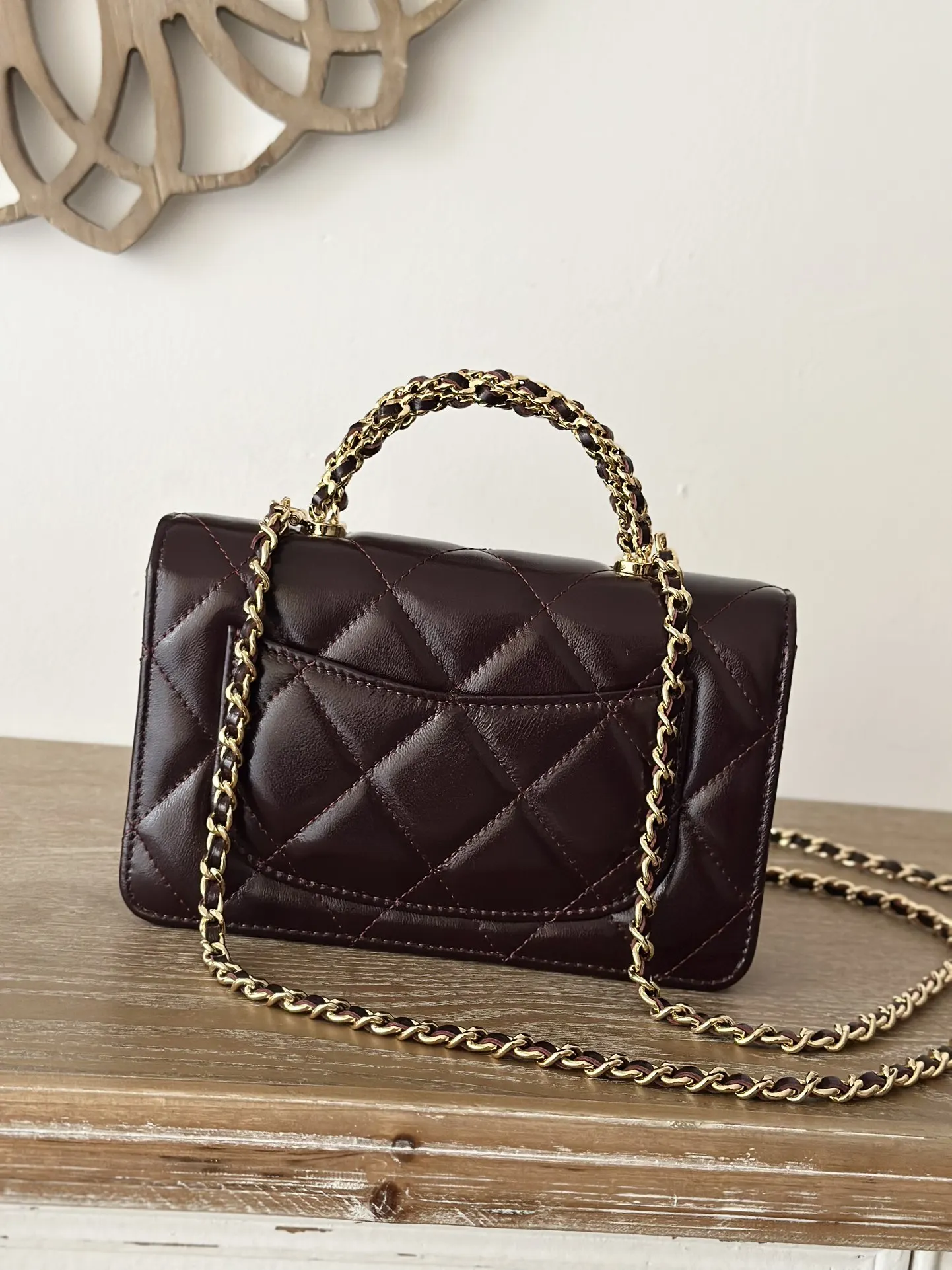 CHANEL 24B WOC with braided handle, featuring a chip, crafted in waxed lambskin with a high-gloss finish, offering a vibrant and durable texture. The twisted handle is composed of multiple leather-threaded chains, providing both design and quality. The capacity meets daily needs, making it a small, exquisite choice suitable for all commuting styles. Dimensions: 12*19*3.5cm. Style number: 66024. Color: Date Red Burgundy, comes with packaging.