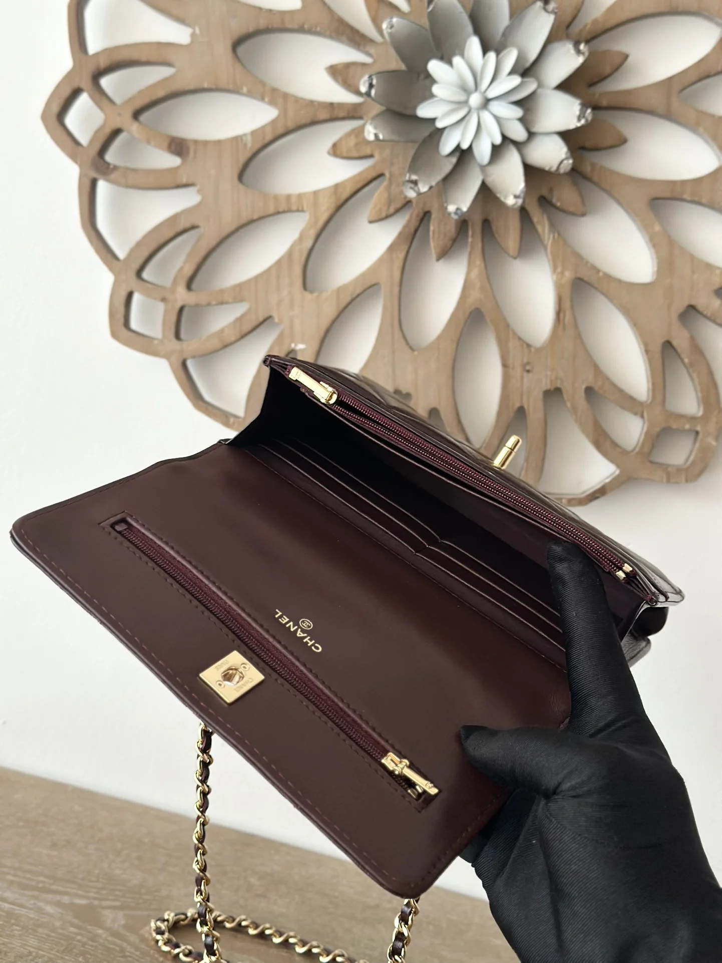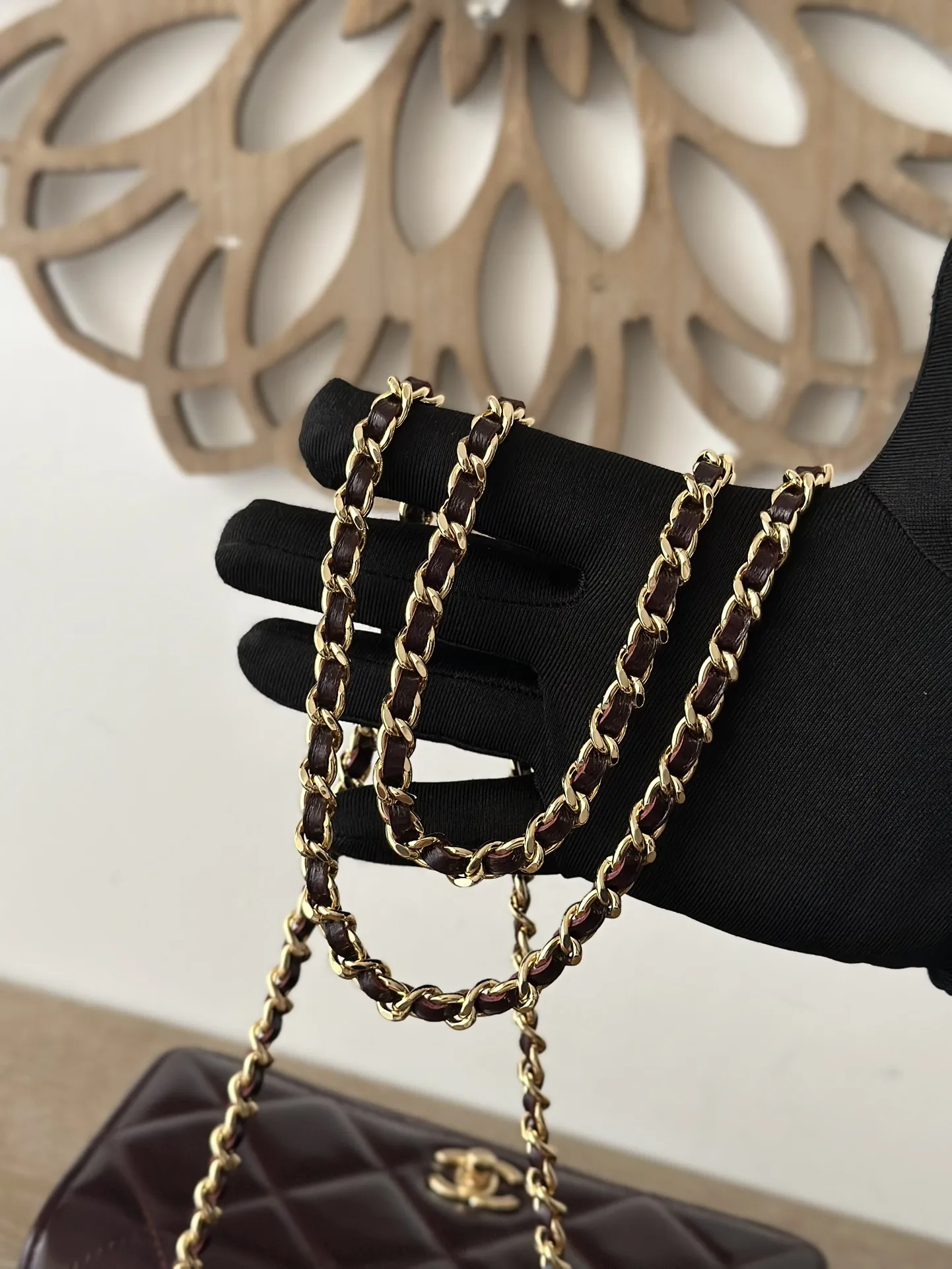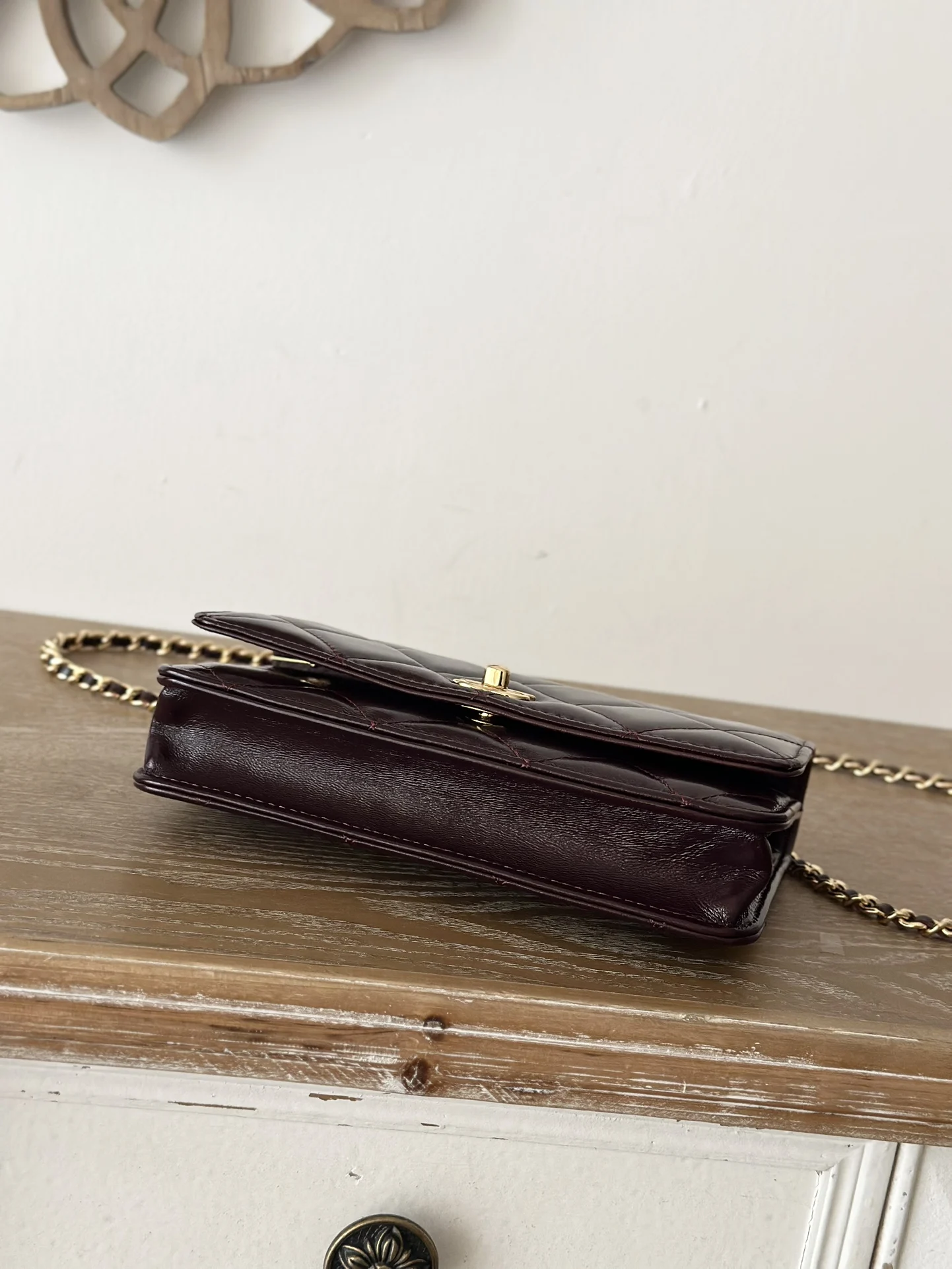 CHANEL 24B WOC with braided handle, featuring a chip, crafted in waxed lambskin with a high-gloss finish, offering a vibrant and durable texture. The twisted handle is composed of multiple leather-threaded chains, providing both design and quality. The capacity meets daily needs, making it a small, exquisite choice suitable for all commuting styles. Dimensions: 12*19*3.5cm. Style number: 66024. Color: Date Red Burgundy, comes with packaging.