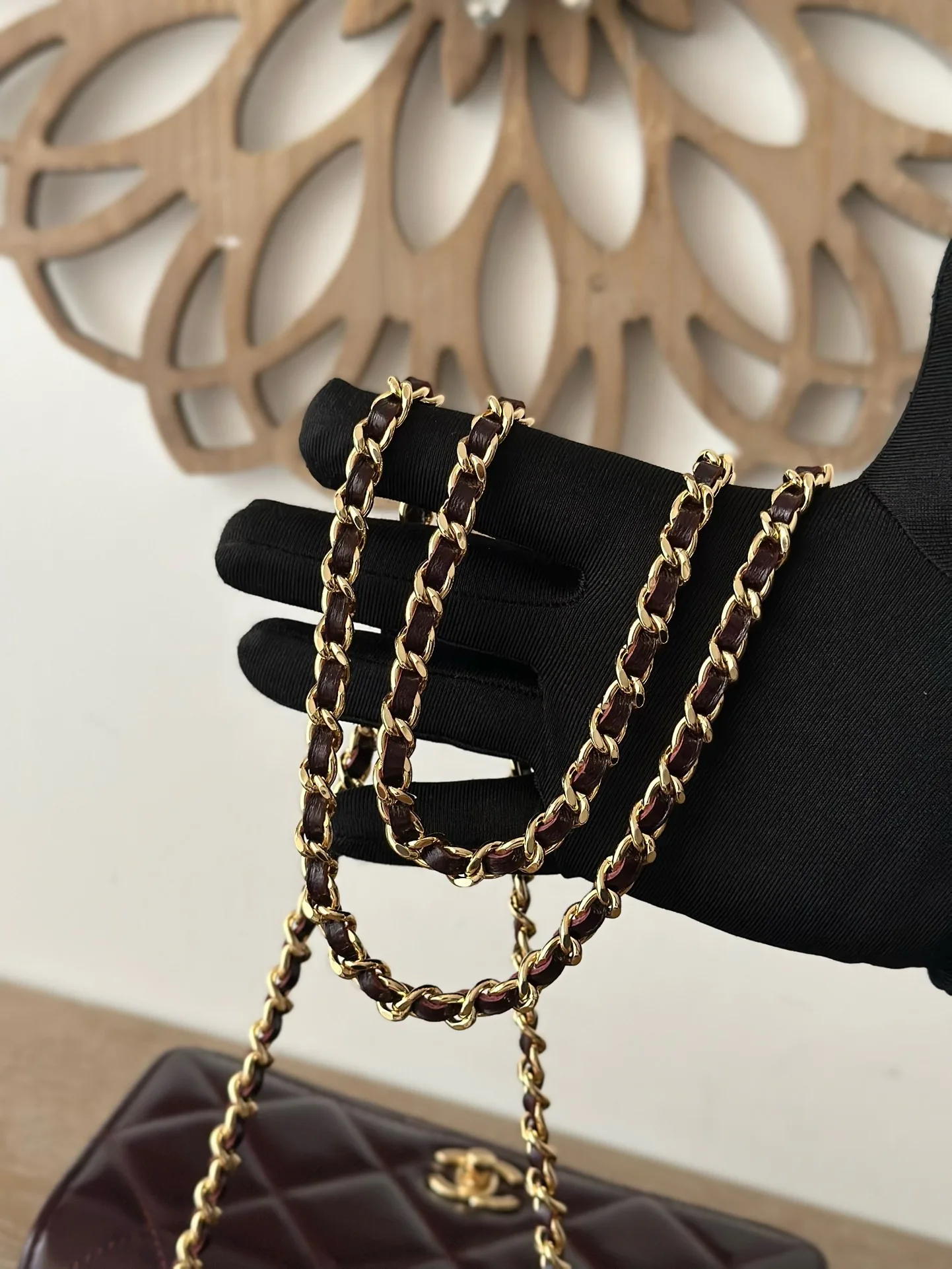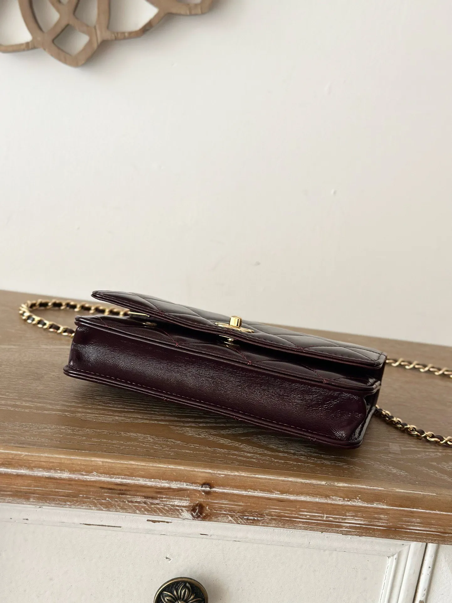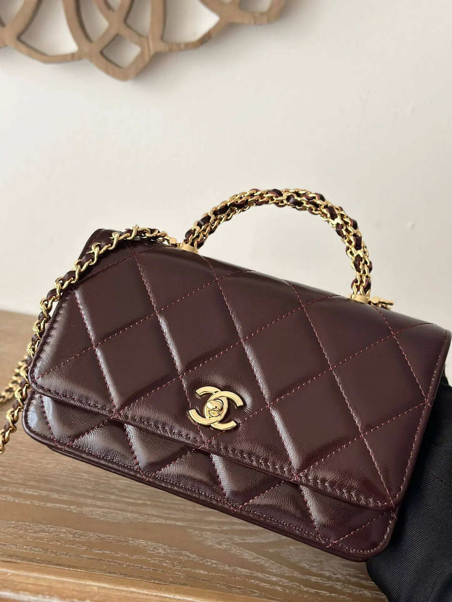 CHANEL 24B WOC with braided handle, chip version, oil wax lambskin, super glossy, supple and durable. The twisted handle is composed of multiple leather-woven chains, with both des..