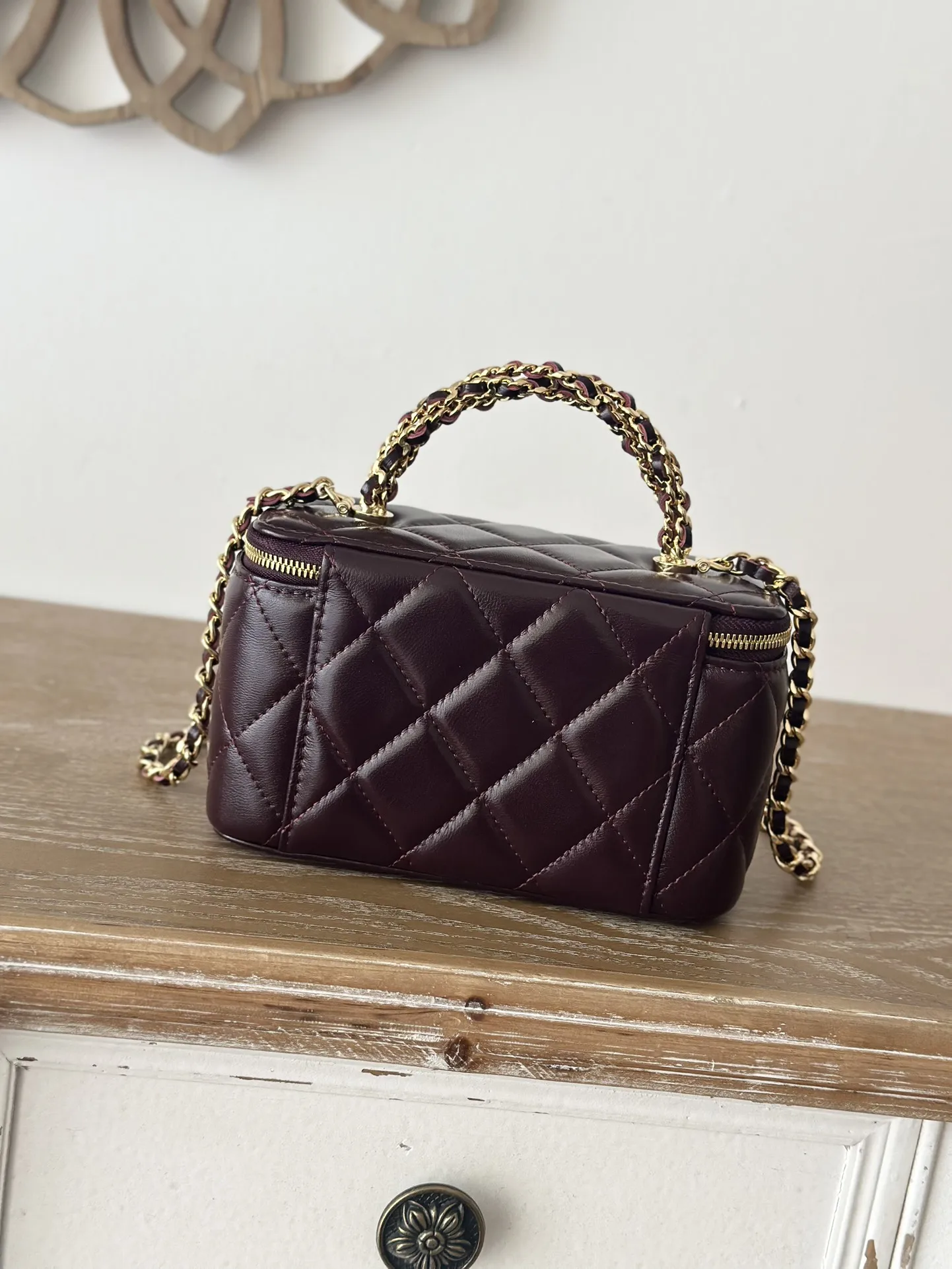 Chane1 24B Makeup Bag with Braided Handle and Metal Chain featuring a braided handle design and a flap with a small mirror. Exquisite and adorable with a soft and supple feel. ..