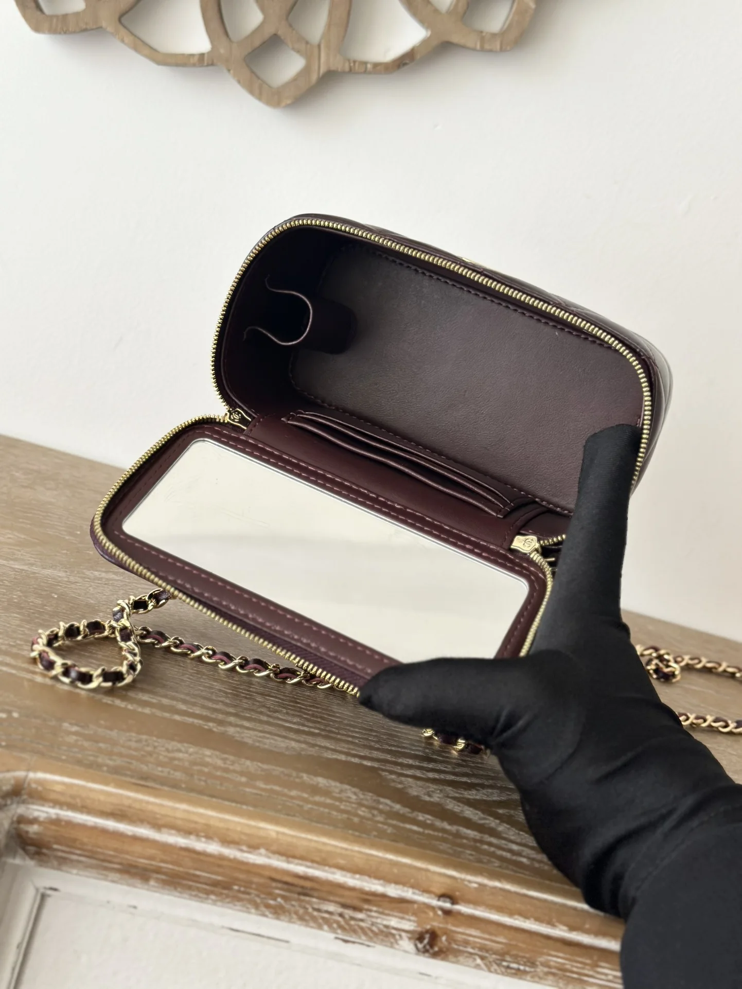 French Chip Version Chane124B Makeup Bag with Braided Handle and Metal Chain. Braided handle design, flap with small mirror, super exquisite and cute, soft to the touch. Enhances temperament, nobility, and elegance for everyday wear. Sisters, go for it! Model: 66025, Date Red, Size: 17*9.5*8, with packaging.