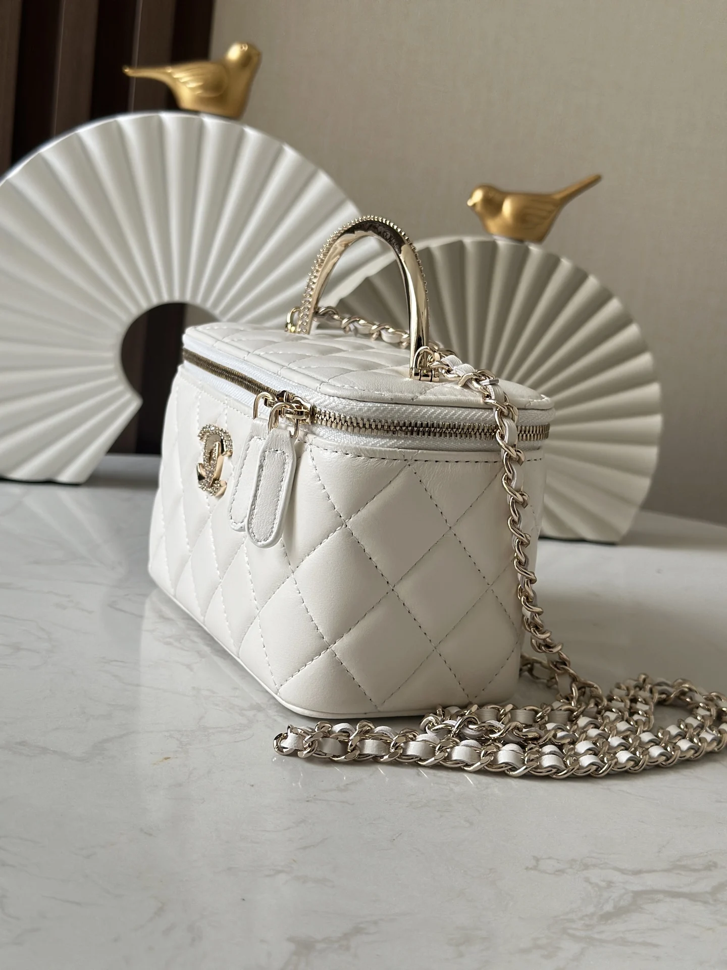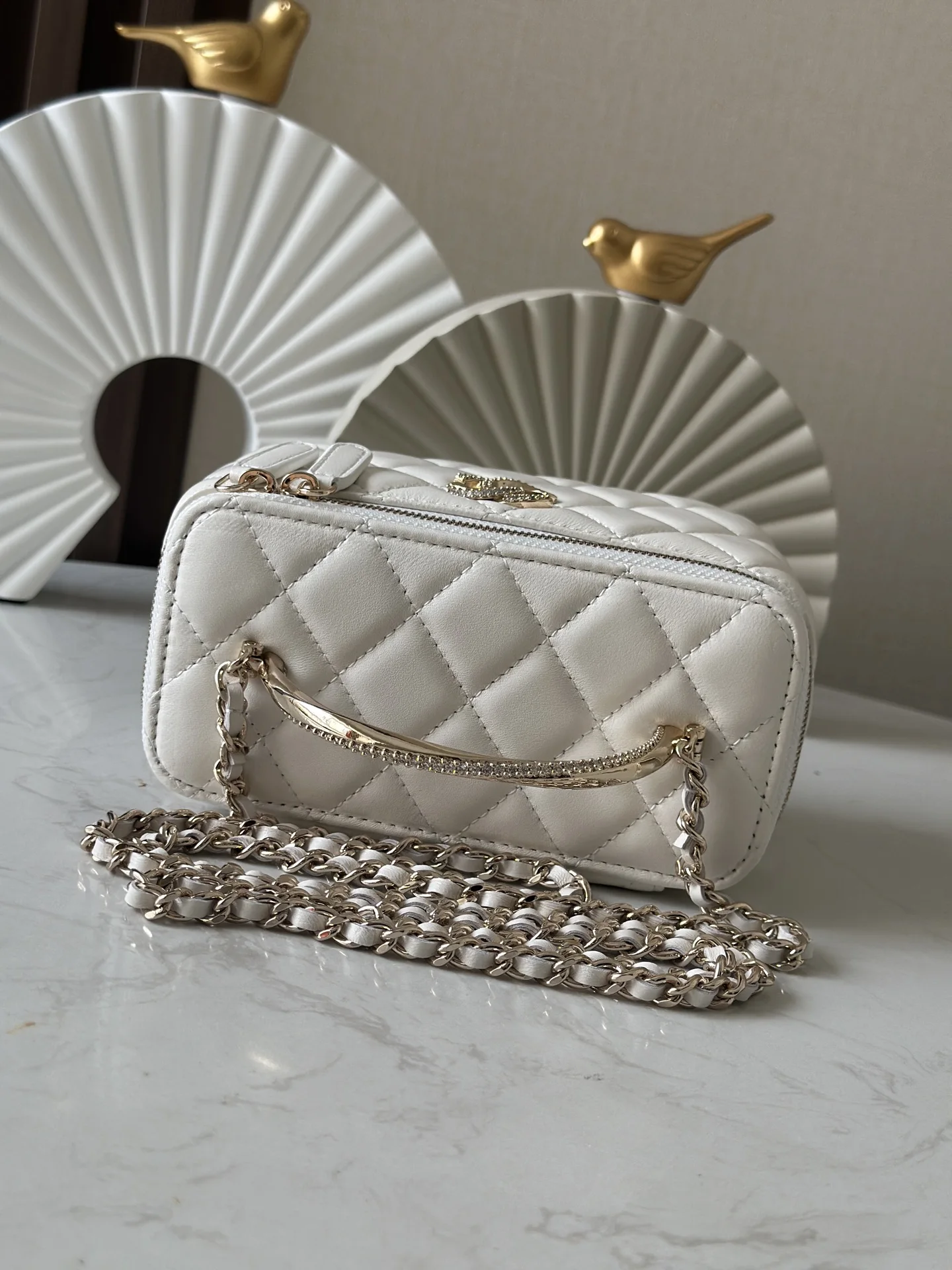 Chip version box bag with 24K burst flash diamonds, CHANE1 pearl handle, and rhinestone logo design! The handle is absolutely stunning! Retro and gorgeous, as exquisite as a work of art. The box bag is truly the best, and the lid also has a small mirror . The capacity is also large enough to hold two phones, making it a very practical bag. The double C buckle design is also very special, with a blingbling feel, so delicate and lovely The cake lambskin is very unique! Feels very durable! It can enhance your sophistication with any outfit . Size: 10*17*8cm. Code: 66057