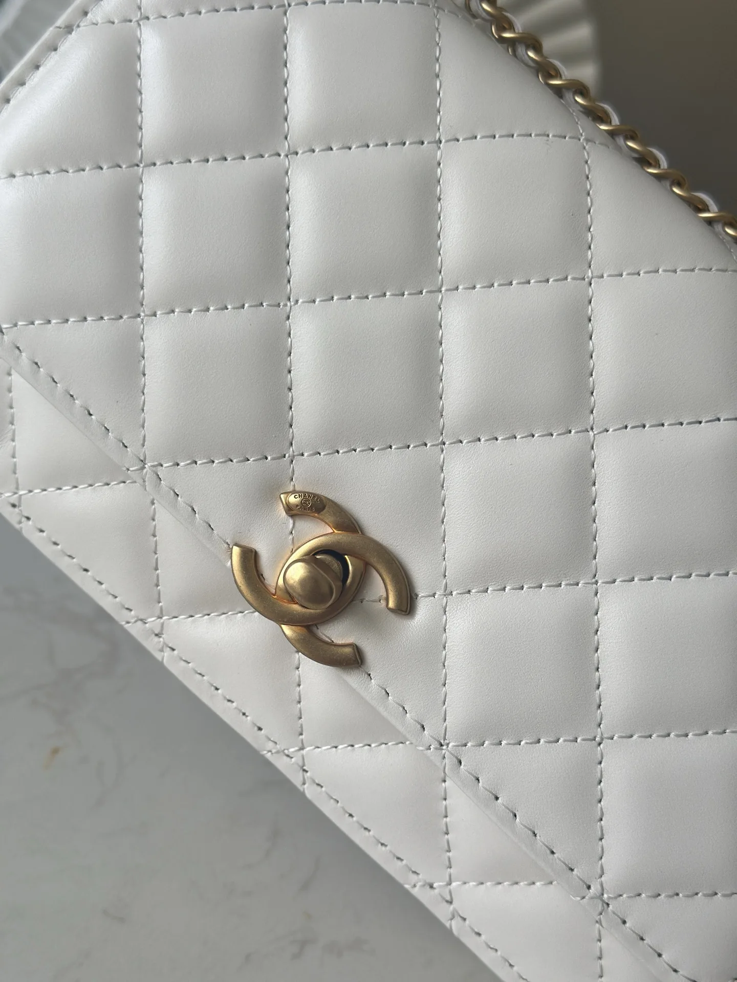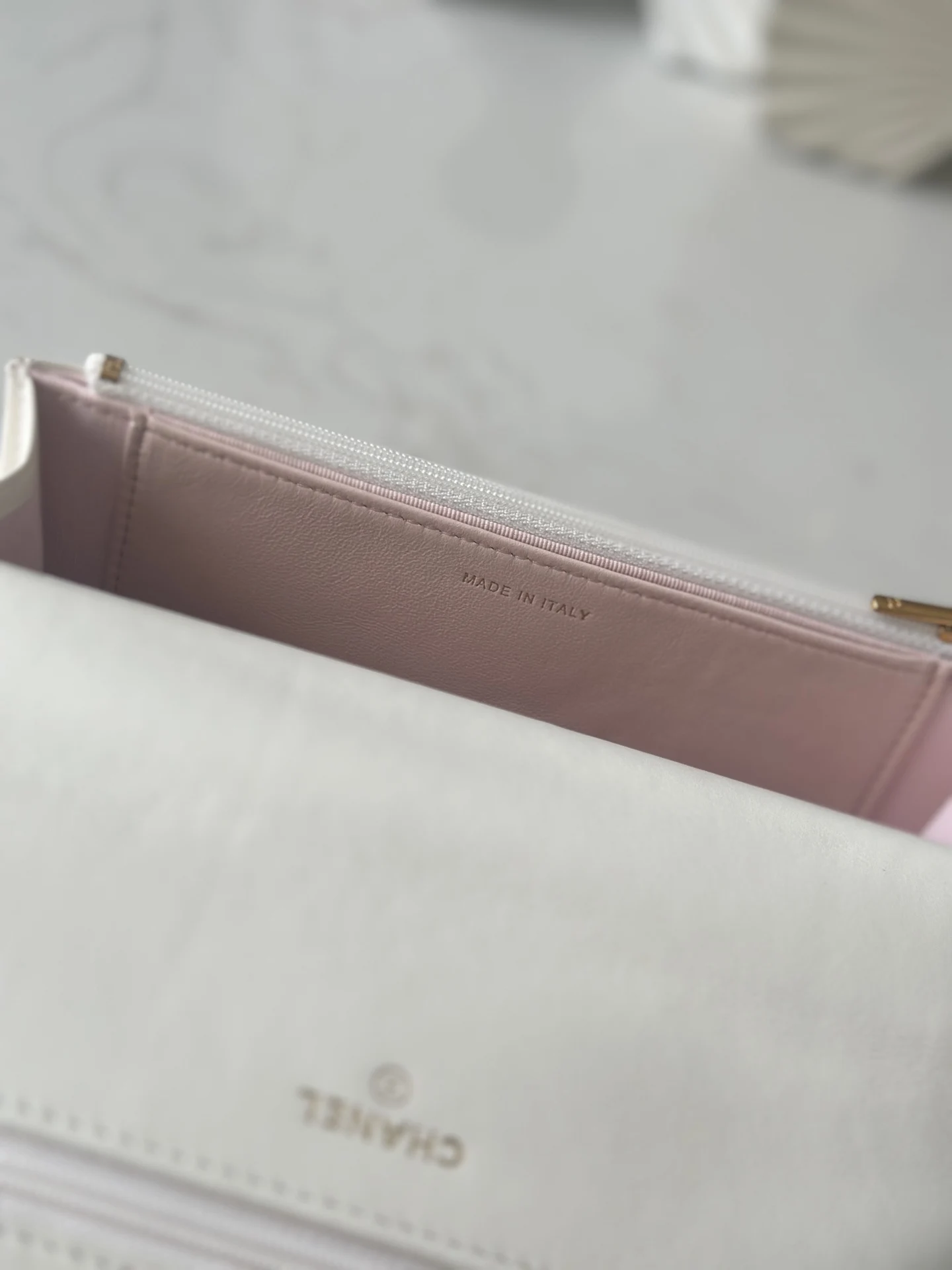 Chip version new arrival: NEW Chane1 24C new version small gold ball double pearl chain WOC returns with double small gold pearl chain design, absolutely beautiful Drawstring adjustment design for the chain, repeatedly tested to avoid wear and tear on the leather cord. Various styles and shapes as you wish, easily handle various carrying methods, simply amazing! Leather: Exclusive Antiba zp glossy calfskin. Number: 66059 White. Size: 12.3*19.2*3.5cm
