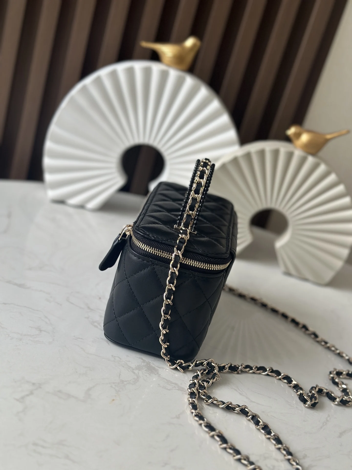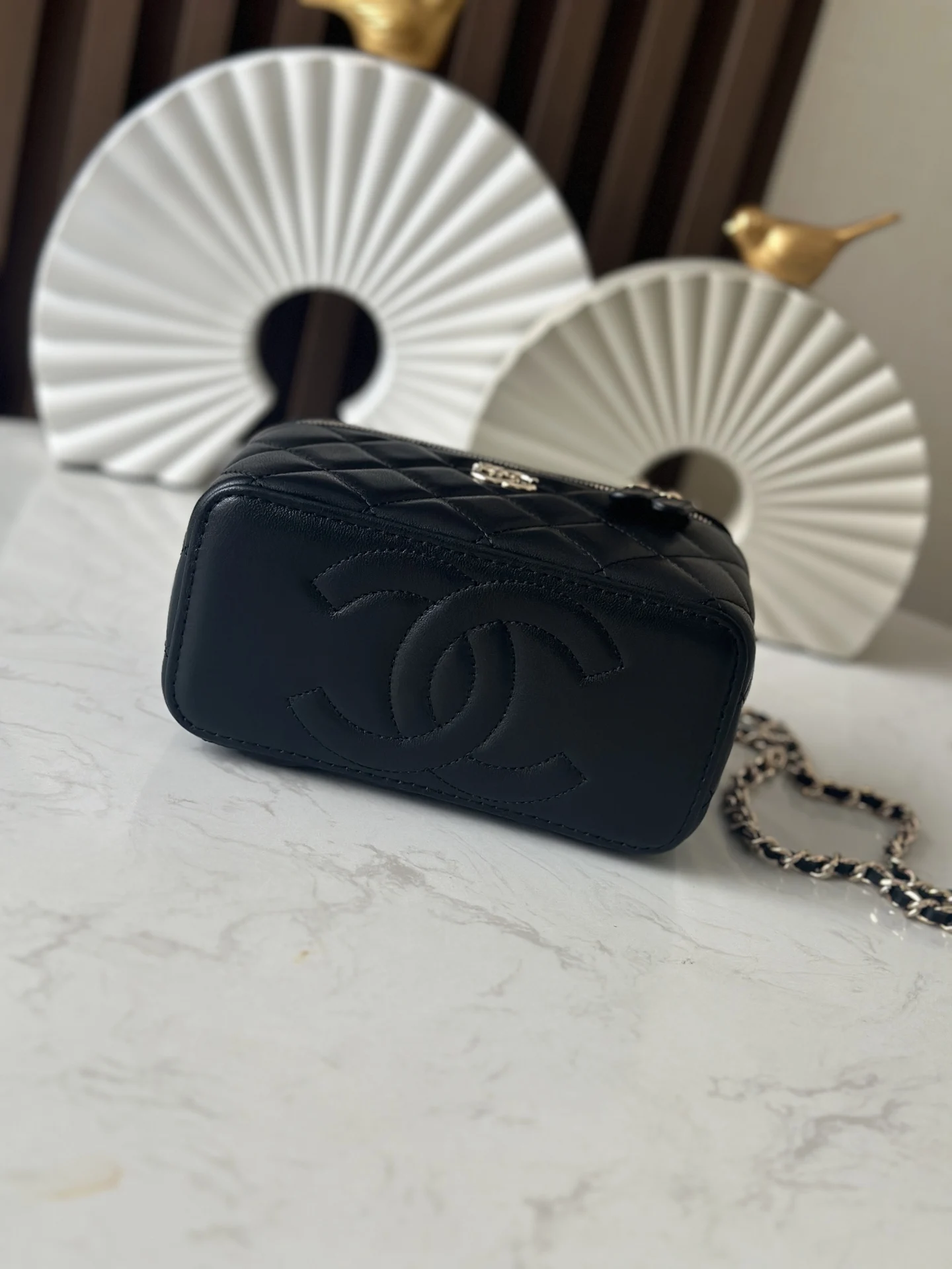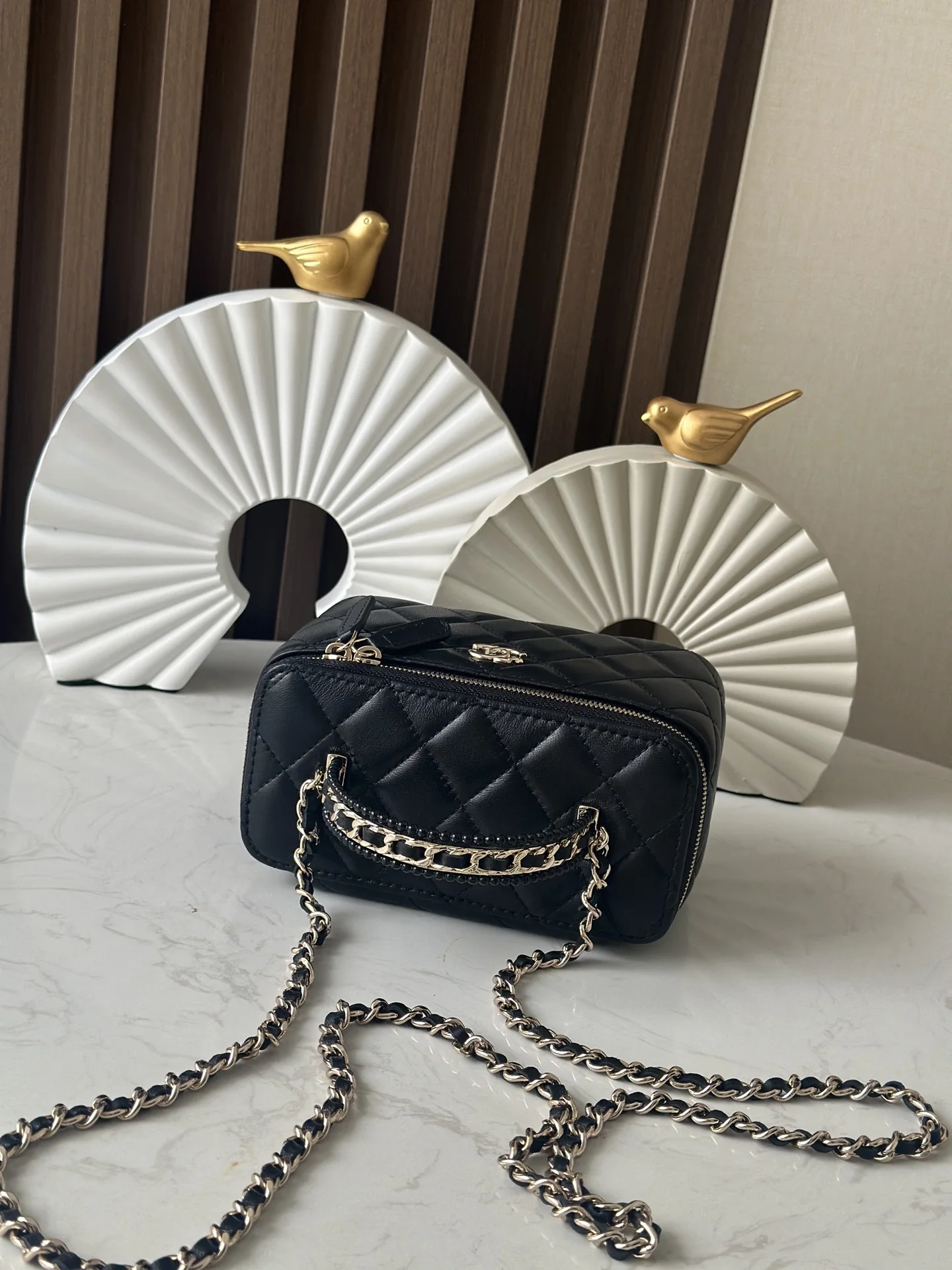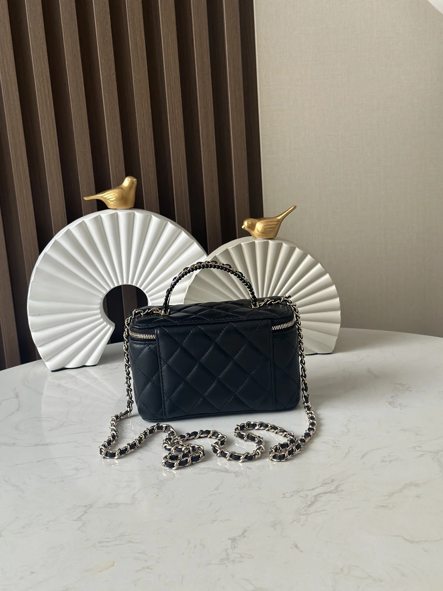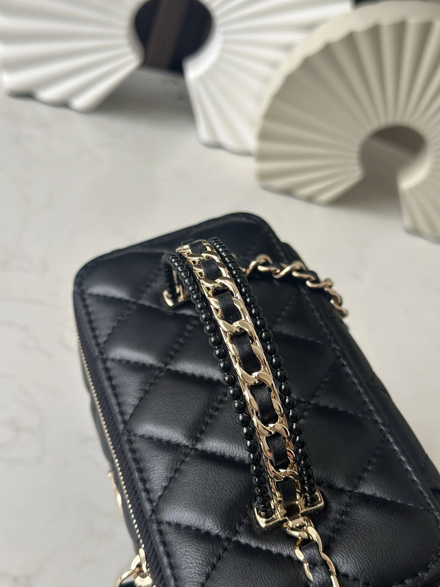 New Chip Version NEChane1 Hot-selling 25s Pearl Cosmetic Long Box Black, Chane1 Forever. Chane1 25s Makeup Bag with Mirror, Touch Up Anytime, Anywhere. Low-key and Elegant Handle Inlaid with Small Diamonds, Exquisite Up Close. Be Beautiful Wherever You Go Number: 66060 Black Size: 9.5*17*7.8cm with Packaging
