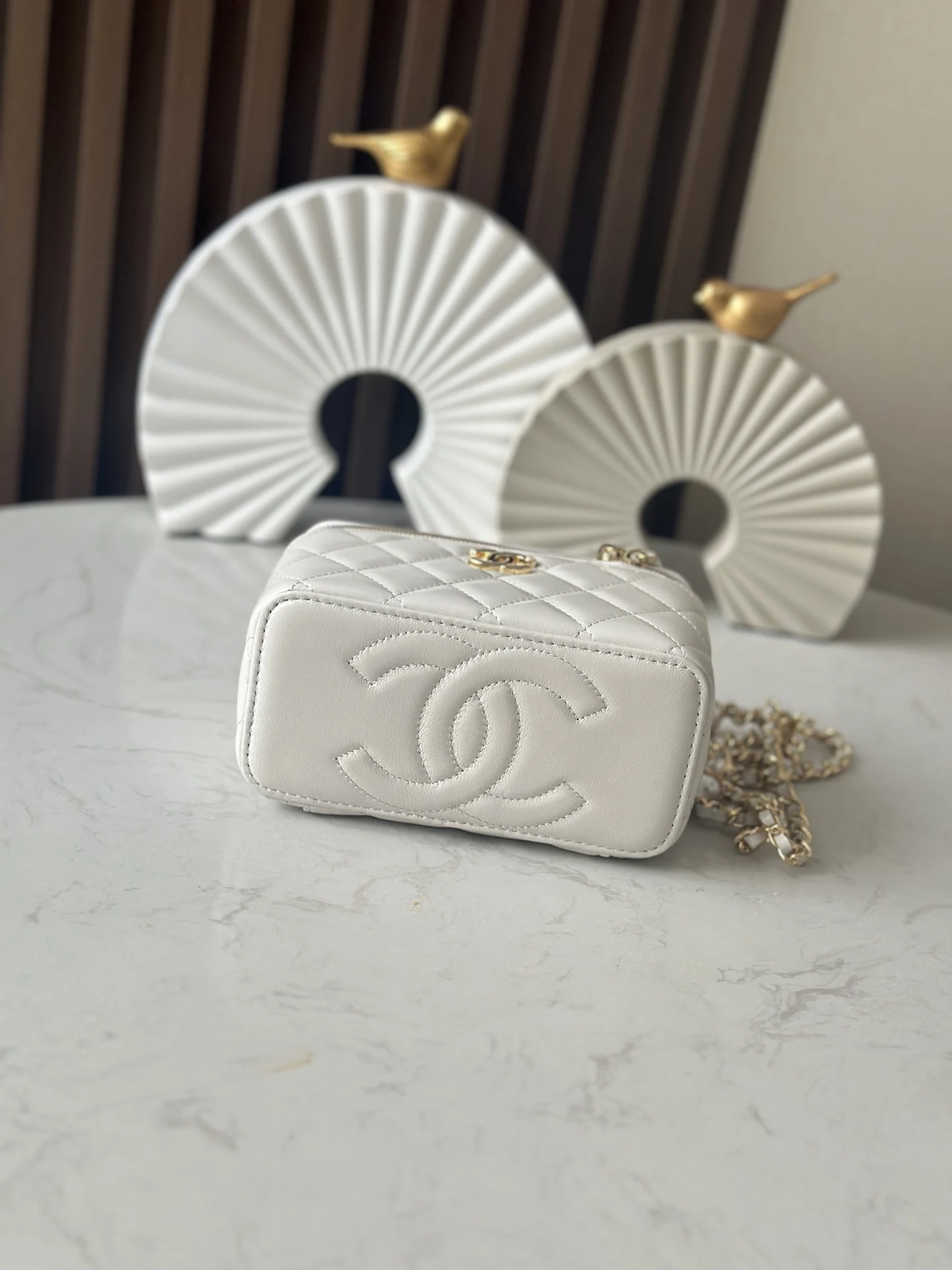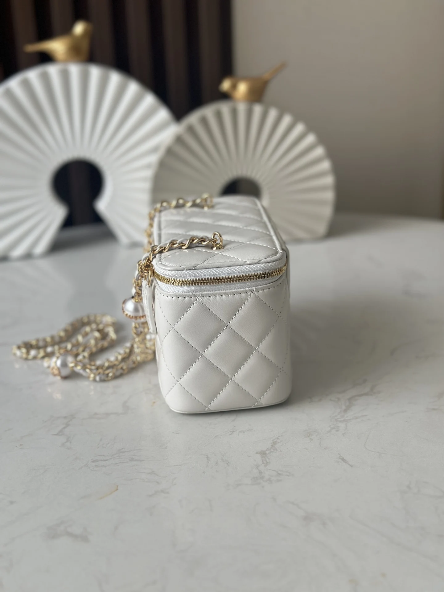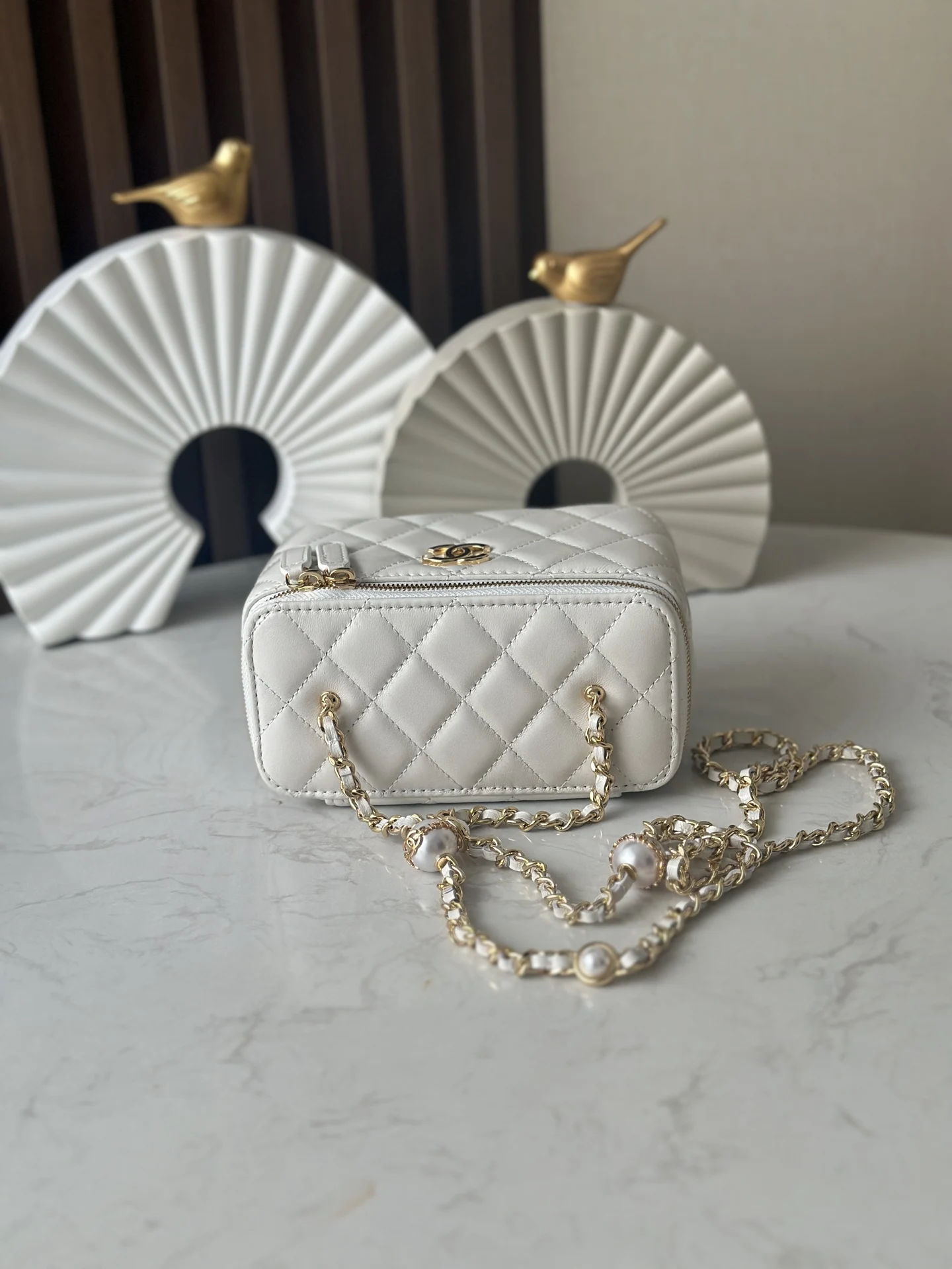 Chanel 24K Chain with Pearl Vanity Case (Chip Version). Extremely luxurious. Made with high-quality lambskin material, the luster is superb and the feel is excellent. What s even m..