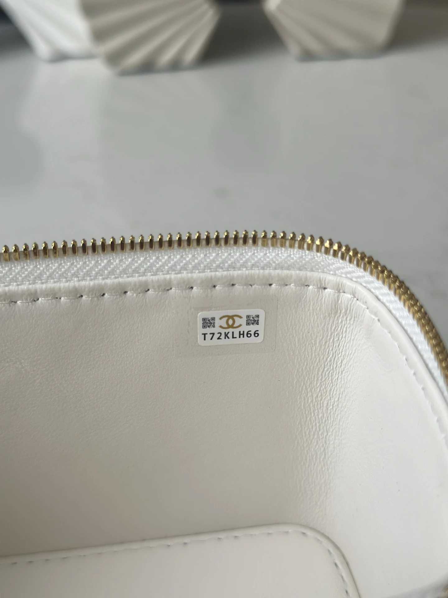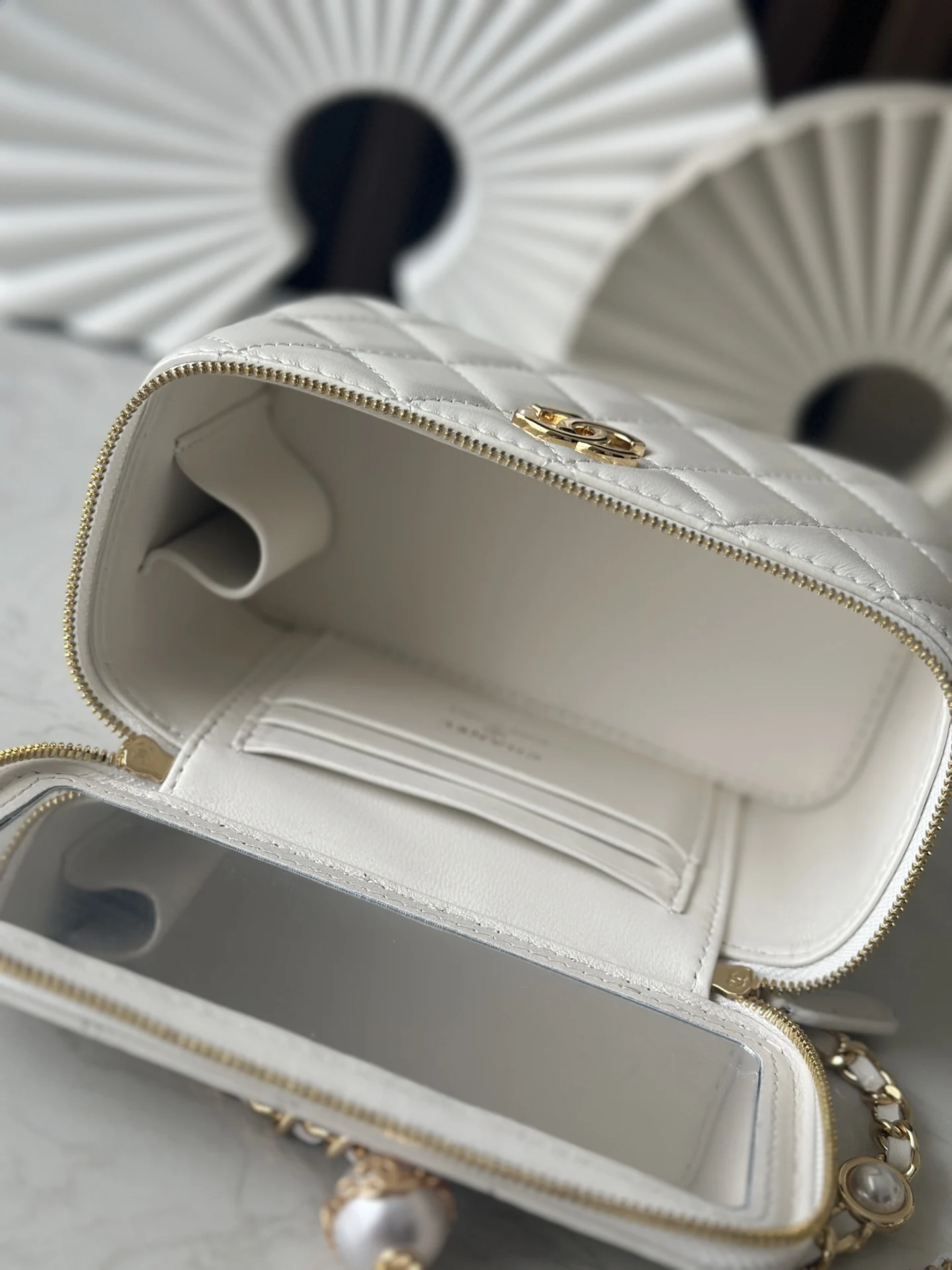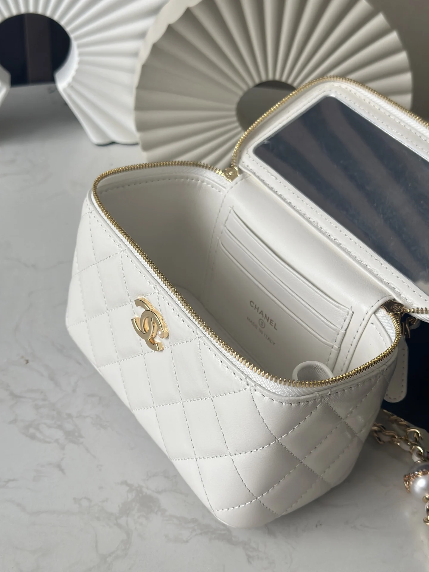 Chanel 24K Chain with Pearl Vanity Case (Chip Version). Extremely luxurious. Made with high-quality lambskin material, the luster is superb and the feel is excellent. What s even more attractive is the chain paired with pearl letters, the exquisite detail is absolutely stunning. The actual product is simply too appealing. Style number: 66062. White. Size: 17cm.