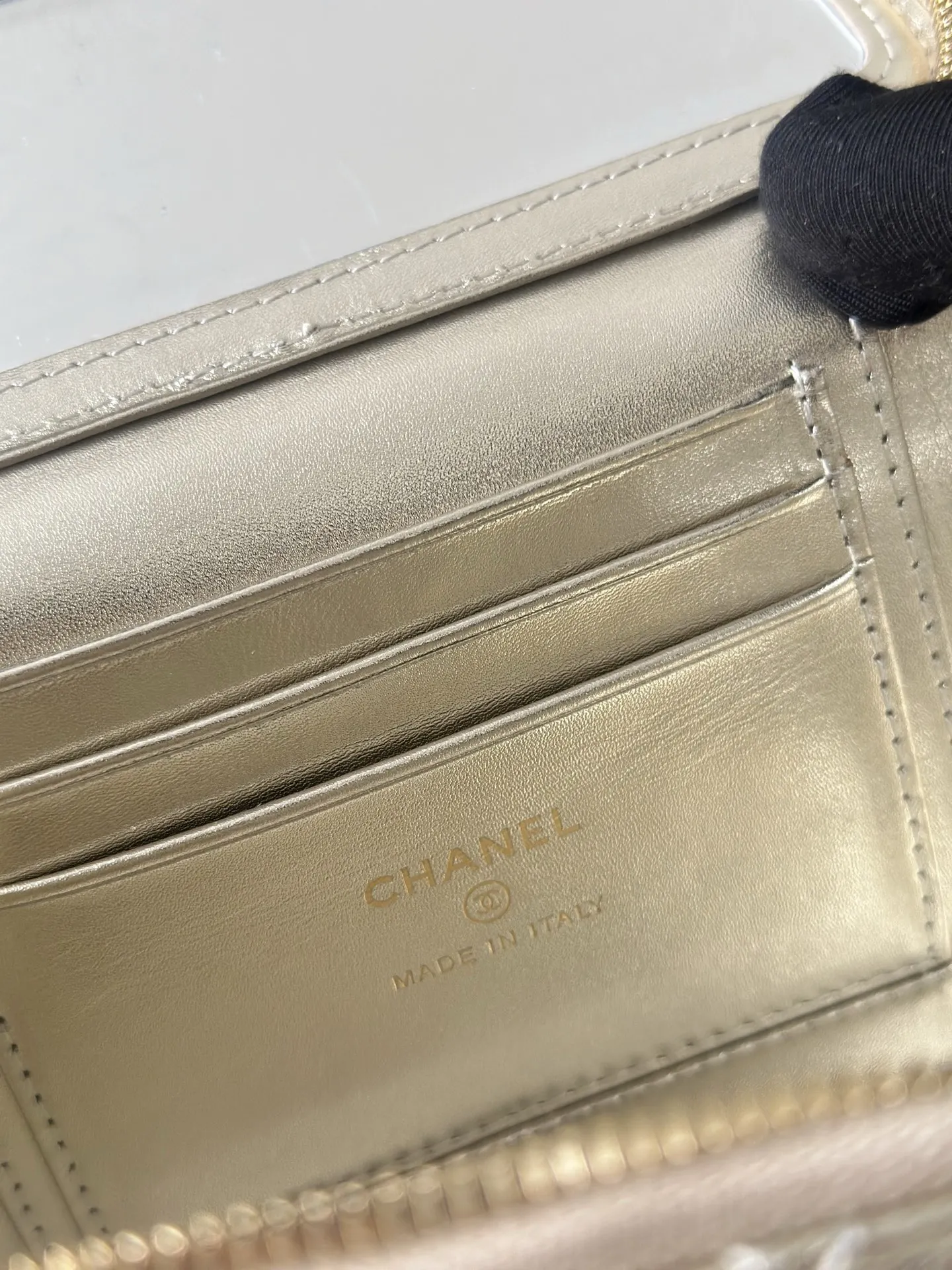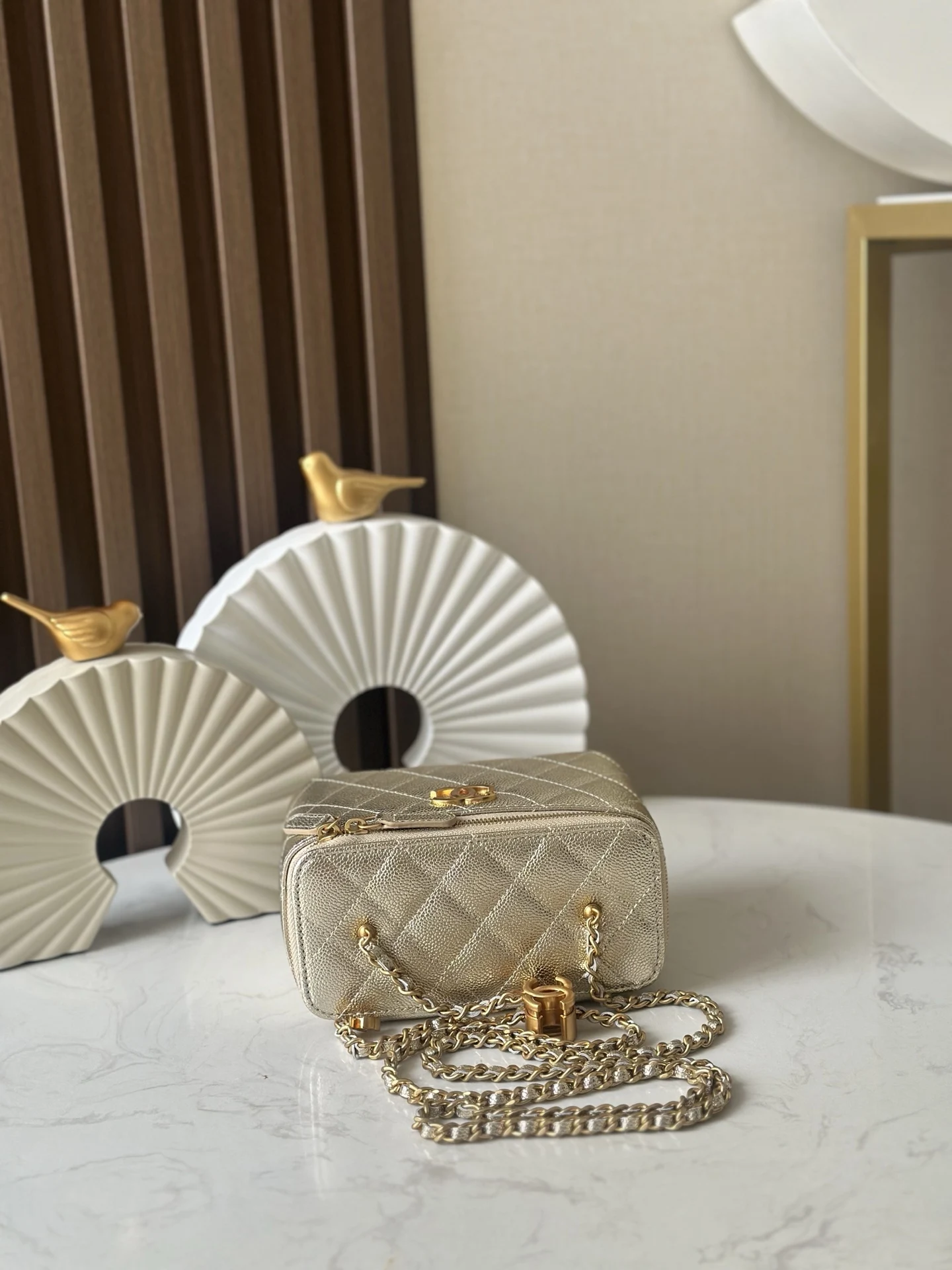The latest 25B chip version features the classic double C buckle, adjustable chain like the golden ball for length adjustment, and a pendant cosmetic box. Crafted from lambskin wit..
