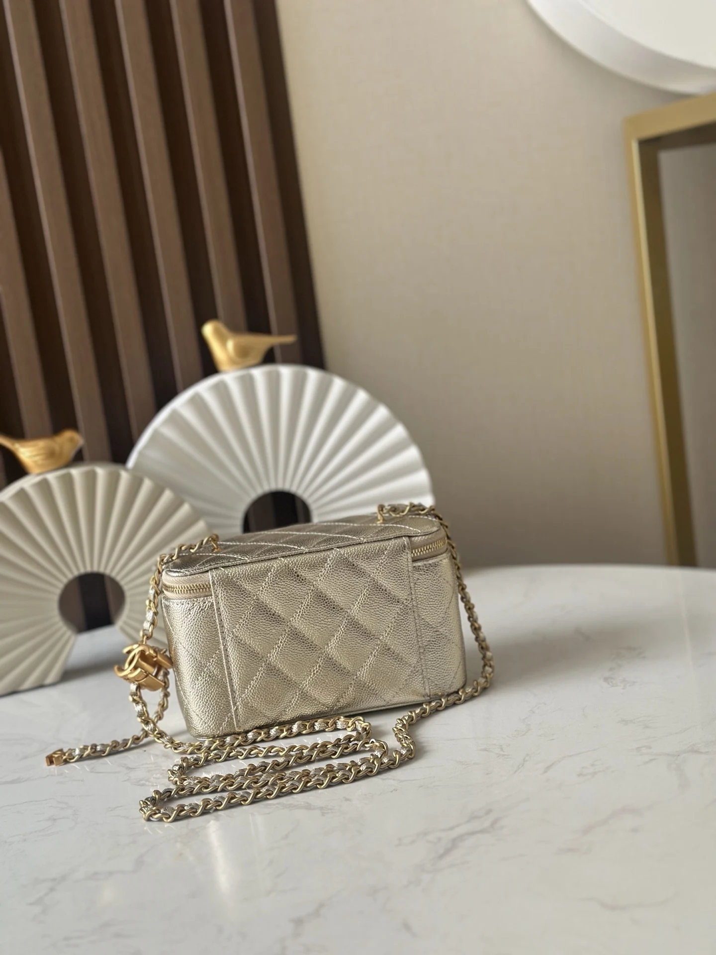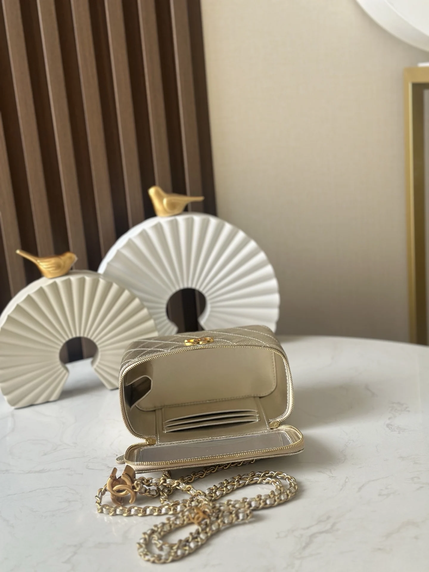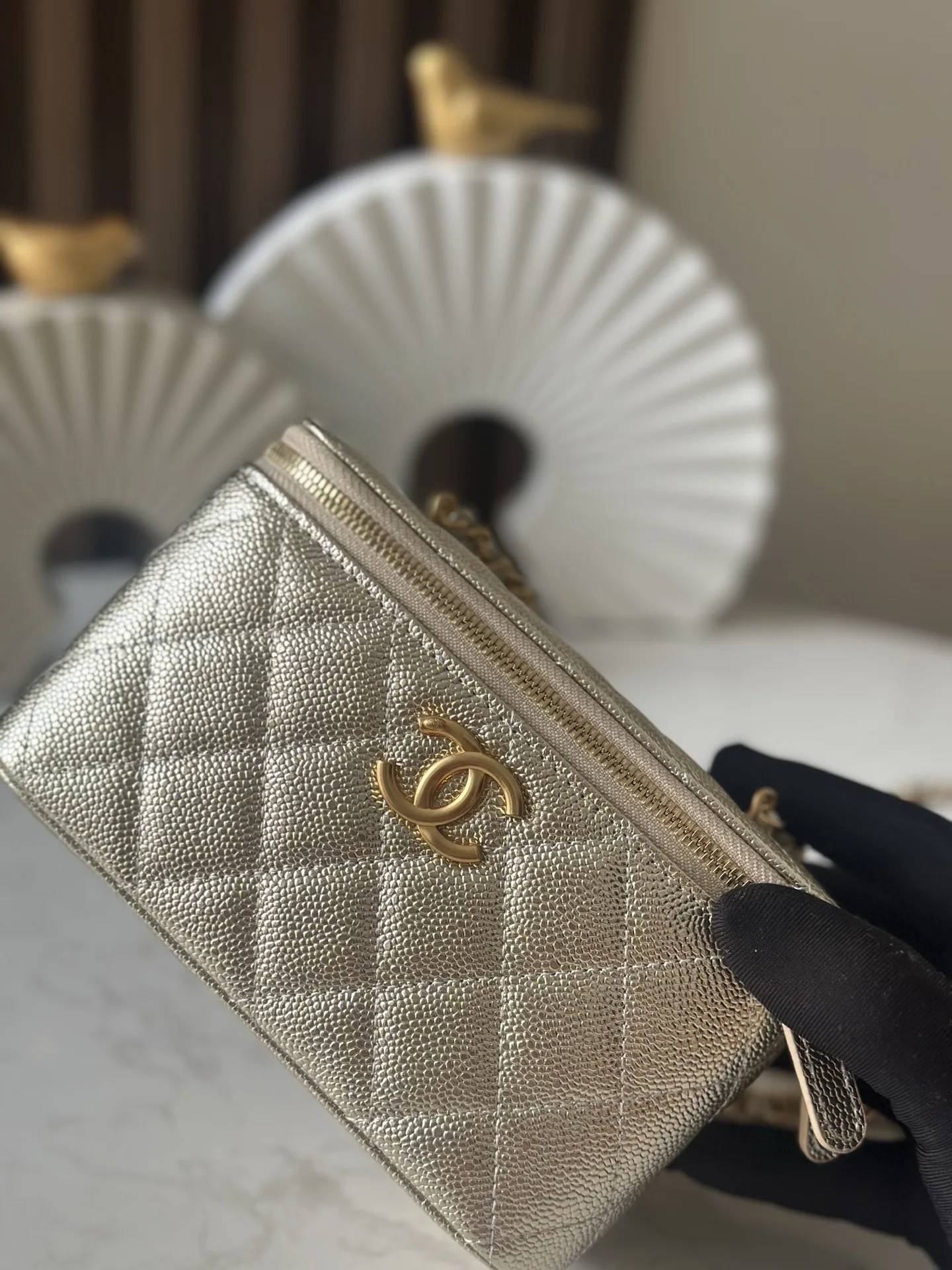 The latest 25B chip version features the classic double C buckle, adjustable chain like the golden ball for length adjustment, and a pendant cosmetic box. Crafted from lambskin with embroidered grids, this ohanel 25B new long cosmetic box with adjustable double C buckle and pendant chain is designed for shoulder and crossbody wear. Made with imported lambskin, reference number: 66071. Gold color. Dimensions: 17x9.5x8. Includes packaging.
