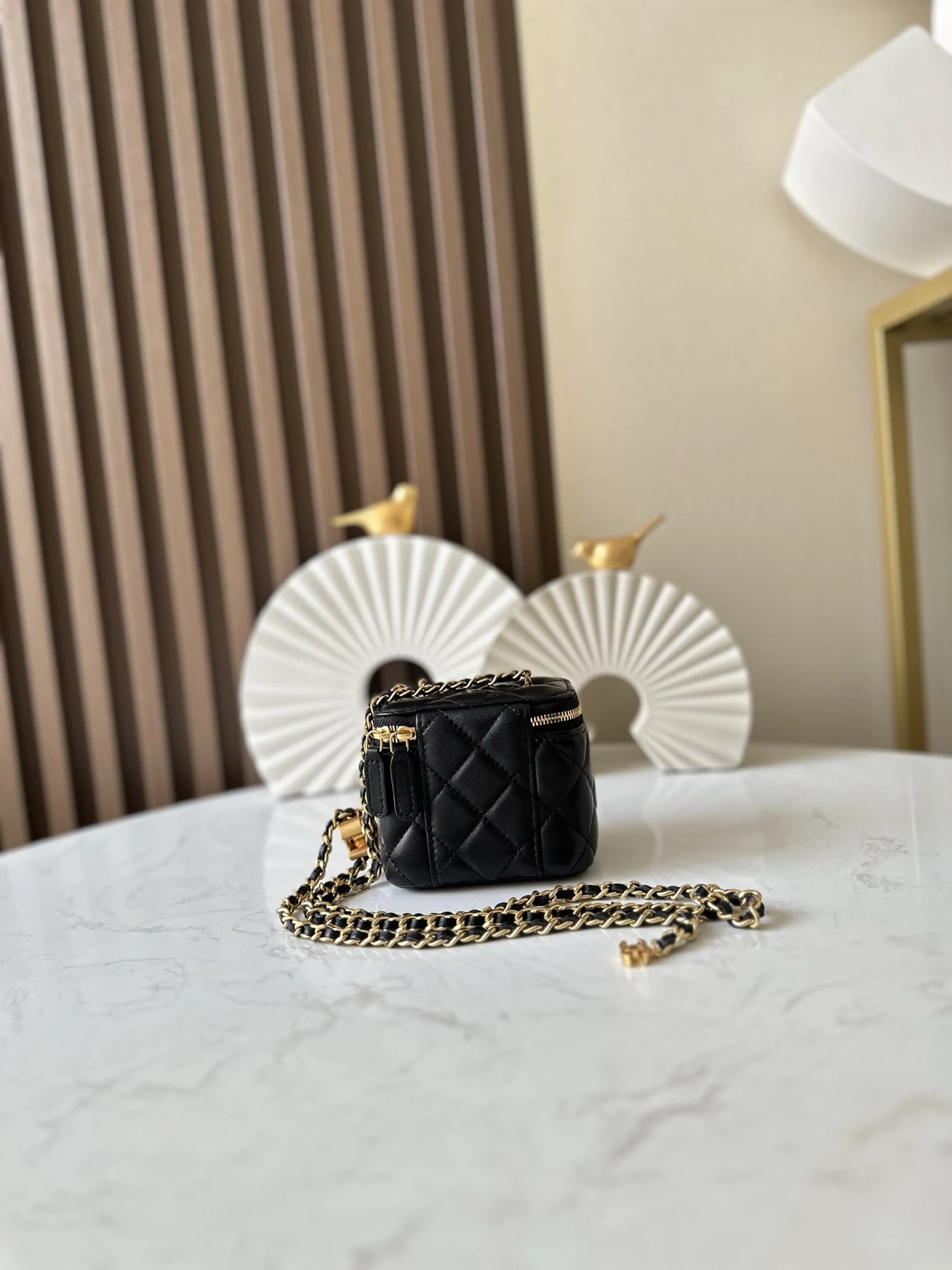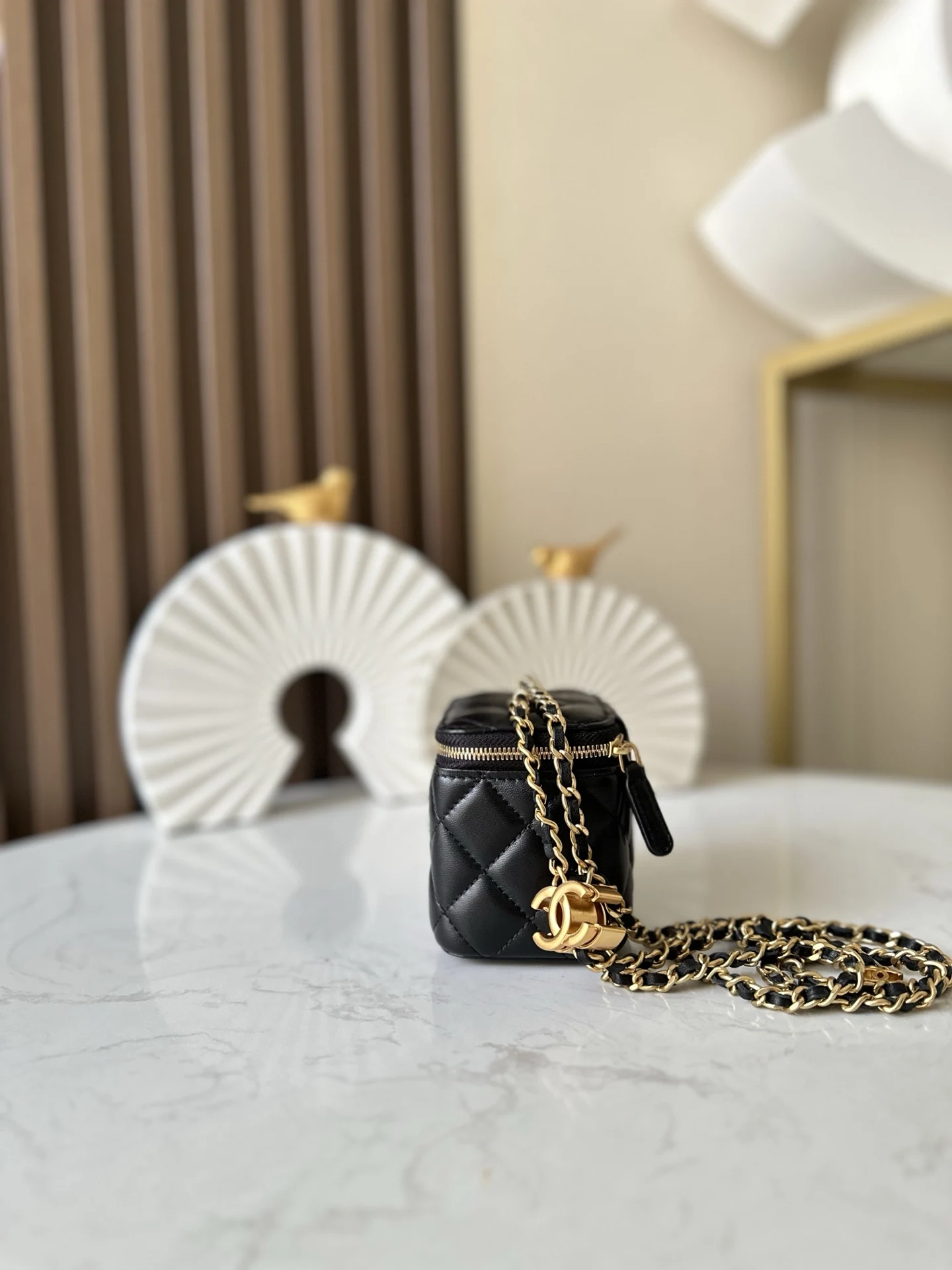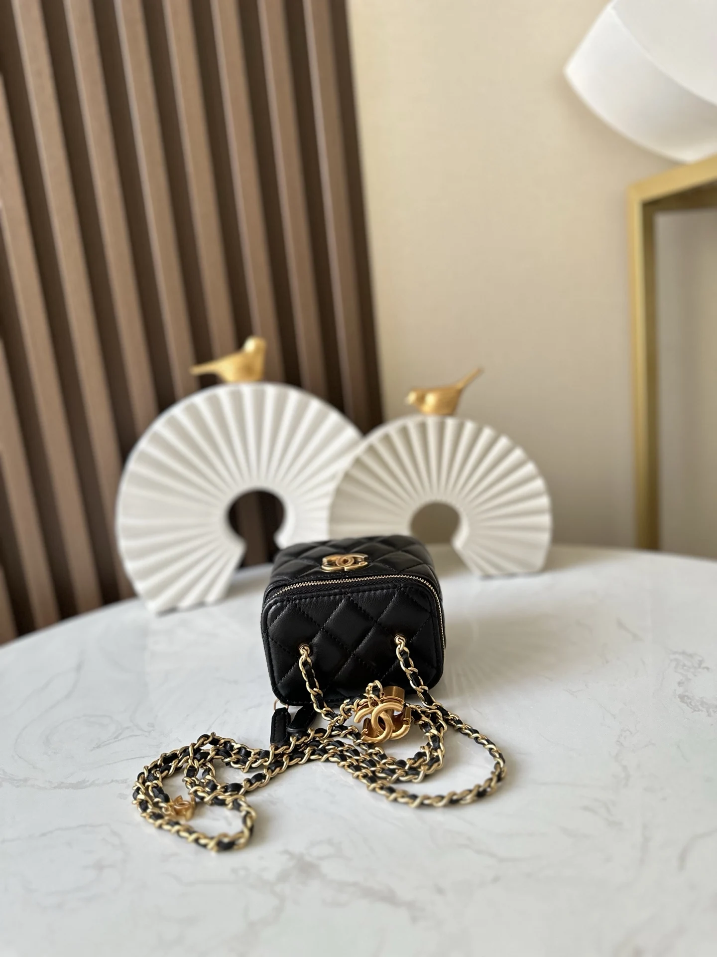 Chip version latest 25B new classic double C buckle adjustable chain, same as the golden ball, adjusts the length pendant makeup box lambskin embroidered grid shoulder crossbody makeup bag, ohanel 25B new long makeup box double C buckle adjustable length pendant chain imported lambskin No.: 66072 Black Size 11 9 with packaging