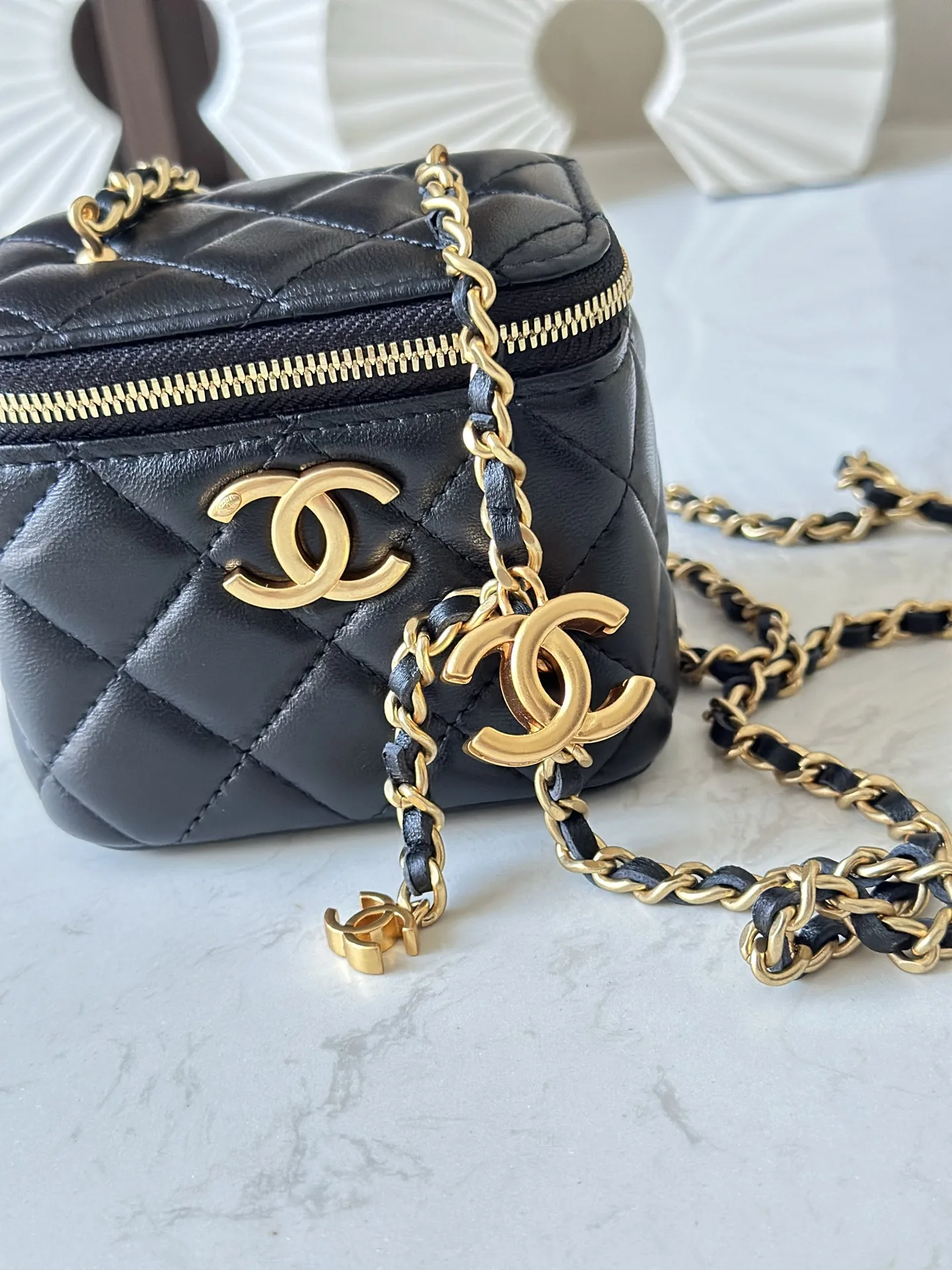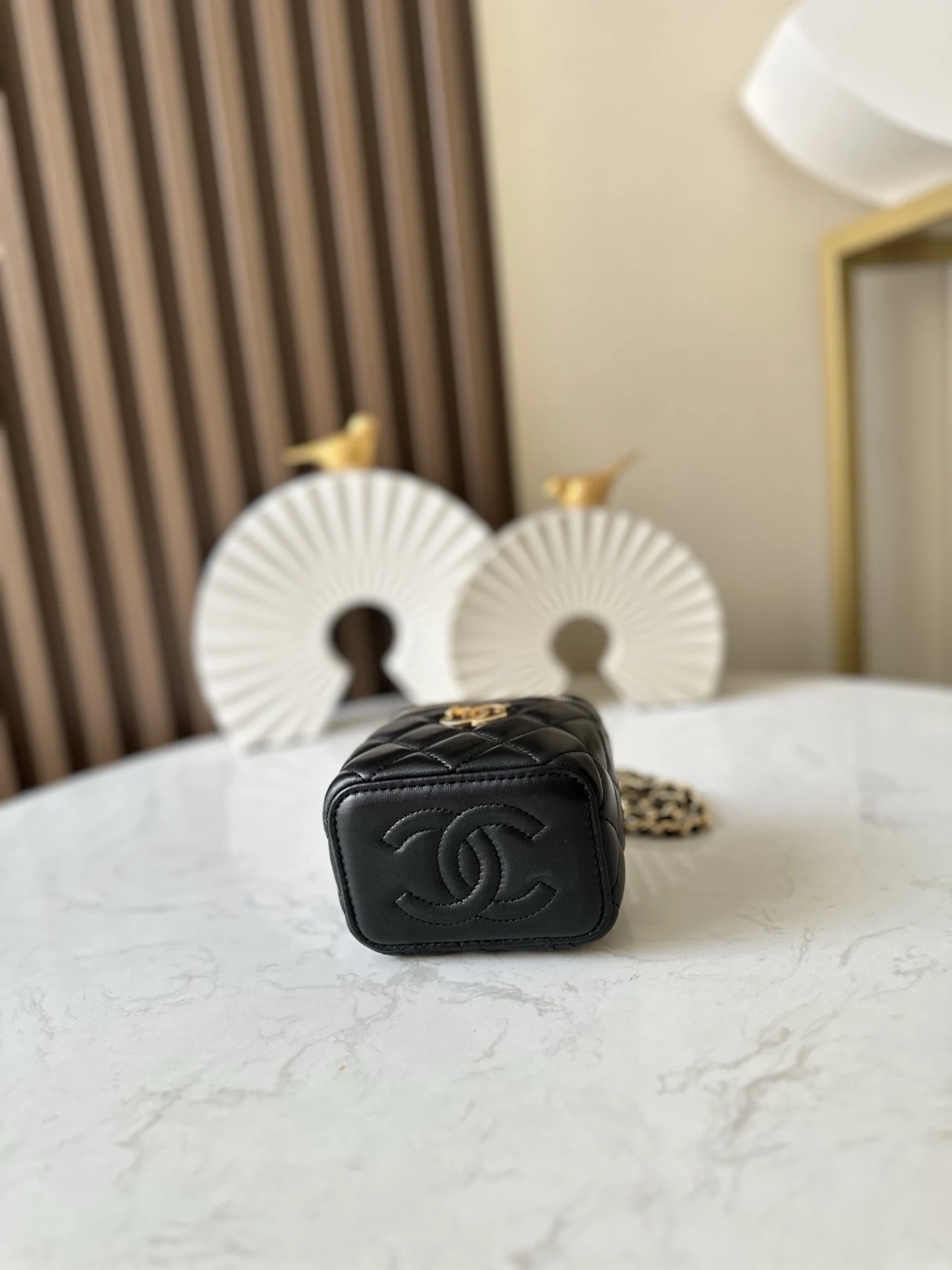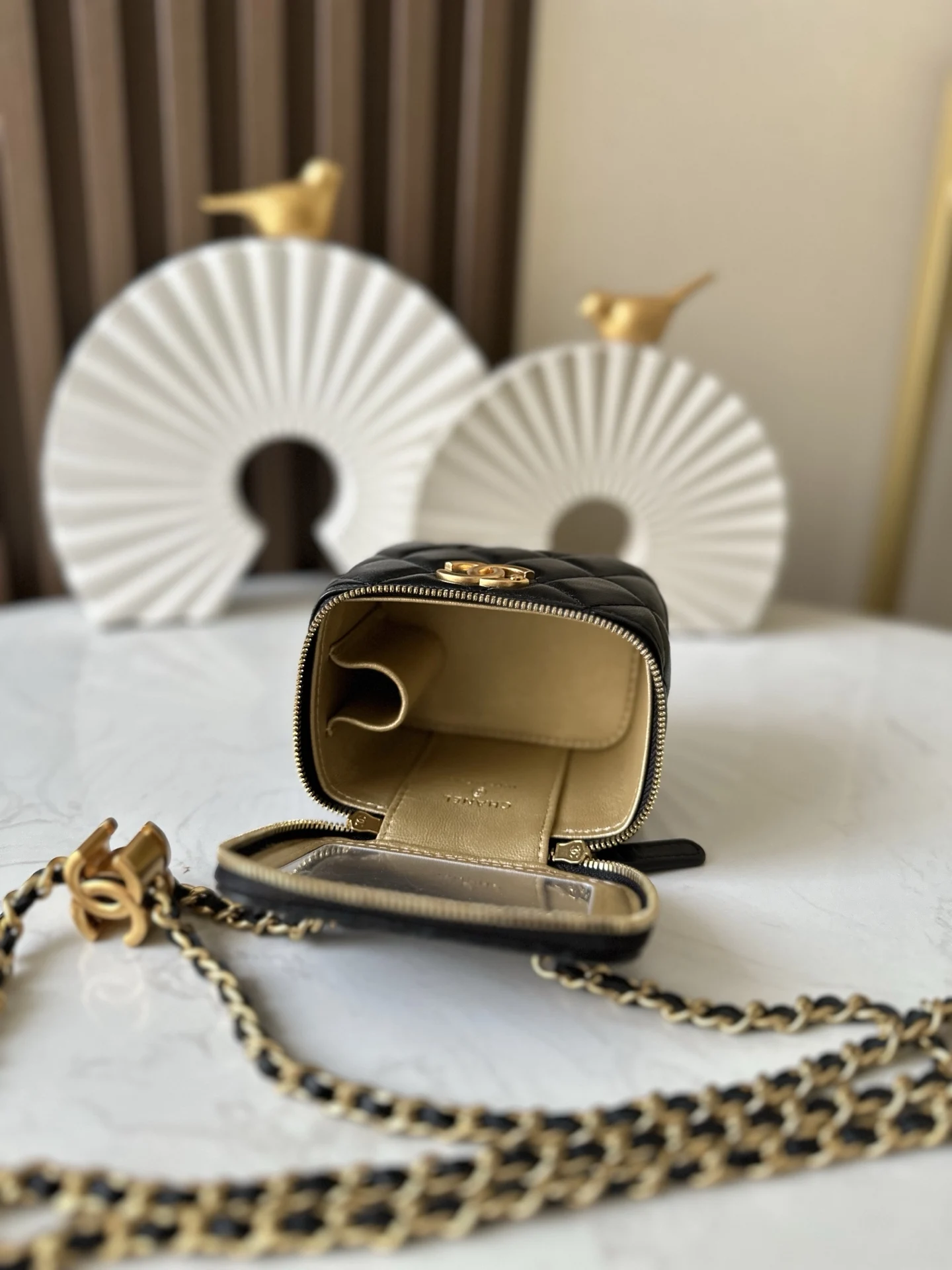 Chip version latest 25B new classic double C buckle adjustable chain, same as the golden ball, adjusts the length pendant makeup box lambskin embroidered grid shoulder crossbody makeup bag, ohanel 25B new long makeup box double C buckle adjustable length pendant chain imported lambskin No.: 66072 Black Size 11 9 with packaging