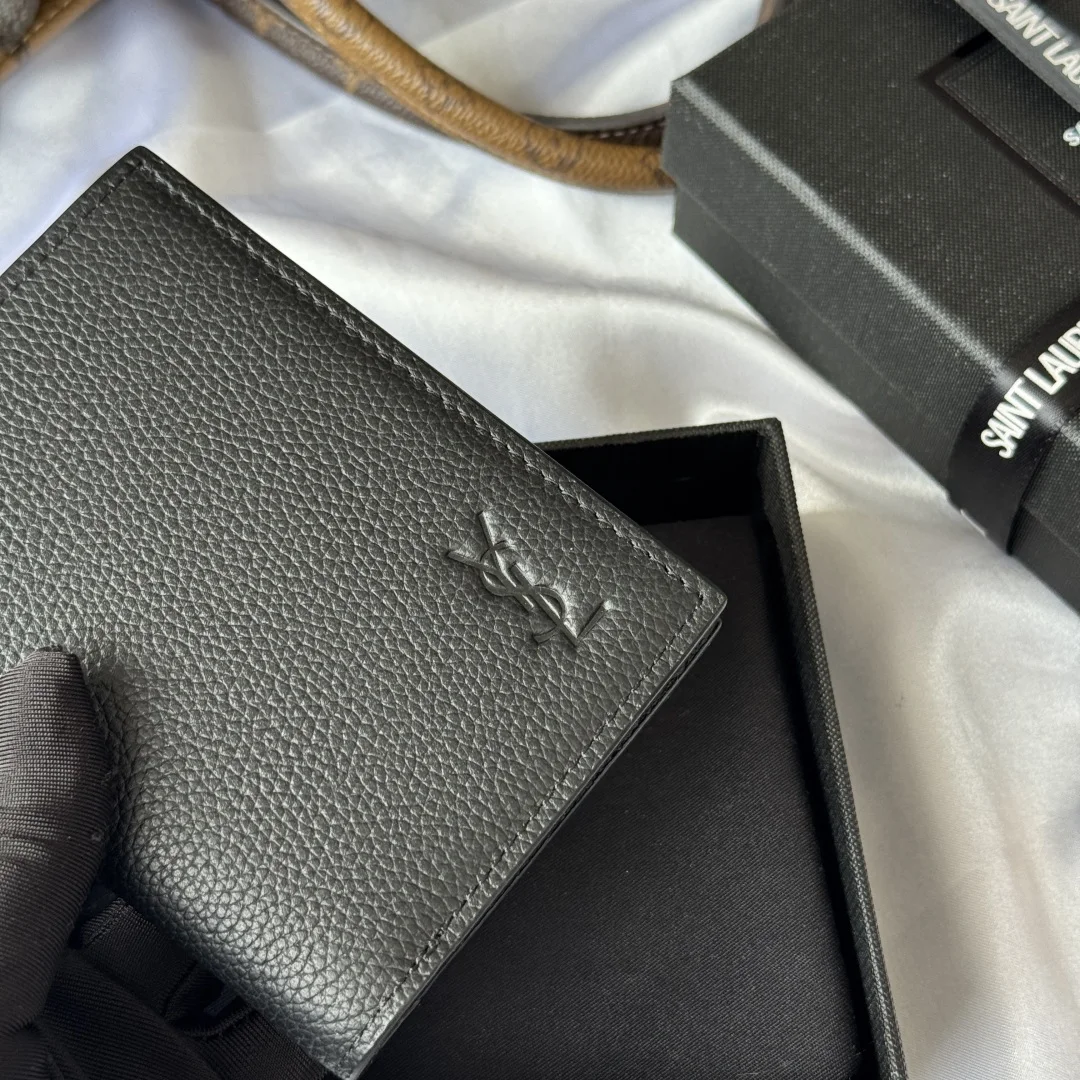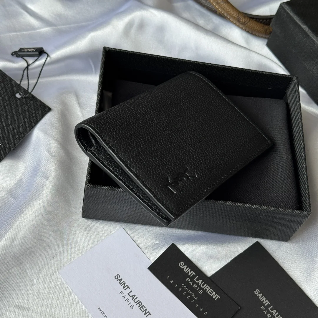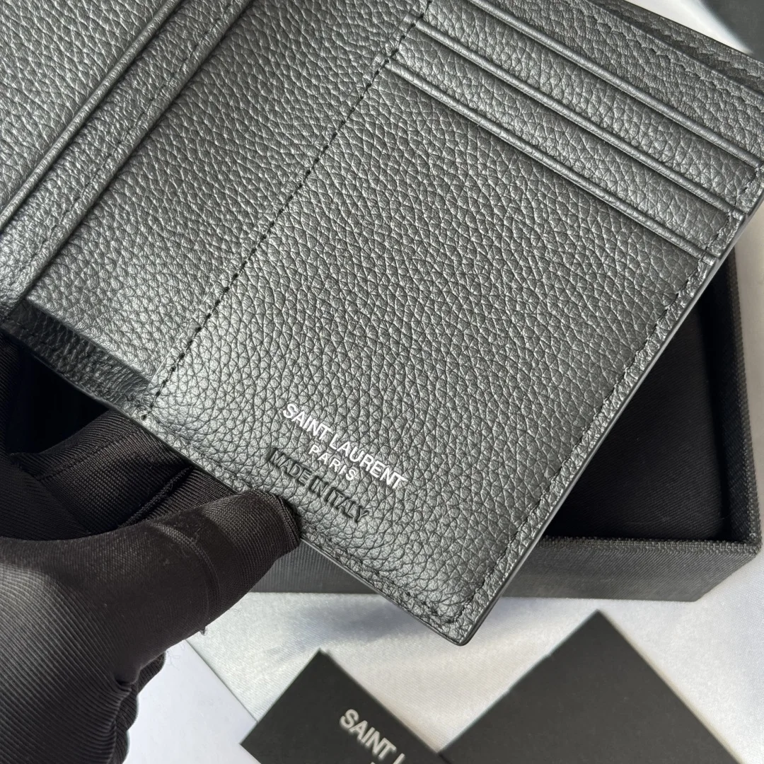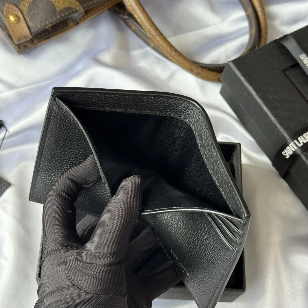 YSL Fall Winter 2025 new arrivals, single-fold wallet, adorned with small-grained calfskin and embossed with the LECASSANDRE logo. Dimensions: 9X11.5 X2 cm 3.5X4.5X0.8 inches. Features four credit card slots, two bill compartments, and one banknote compartment. Leather lining. Accommodates 100-denomination banknotes. Style number: 668736. Color as shown.