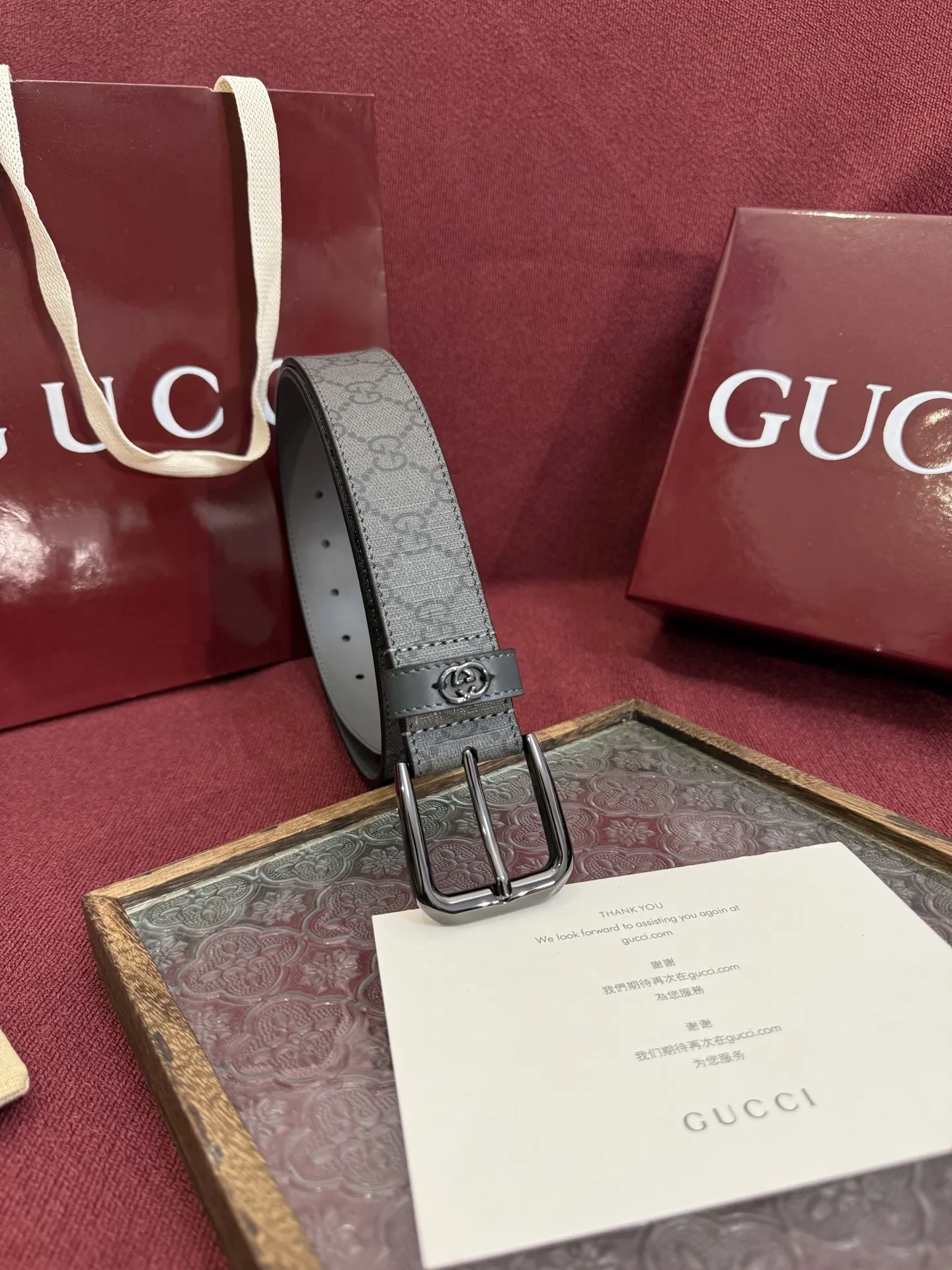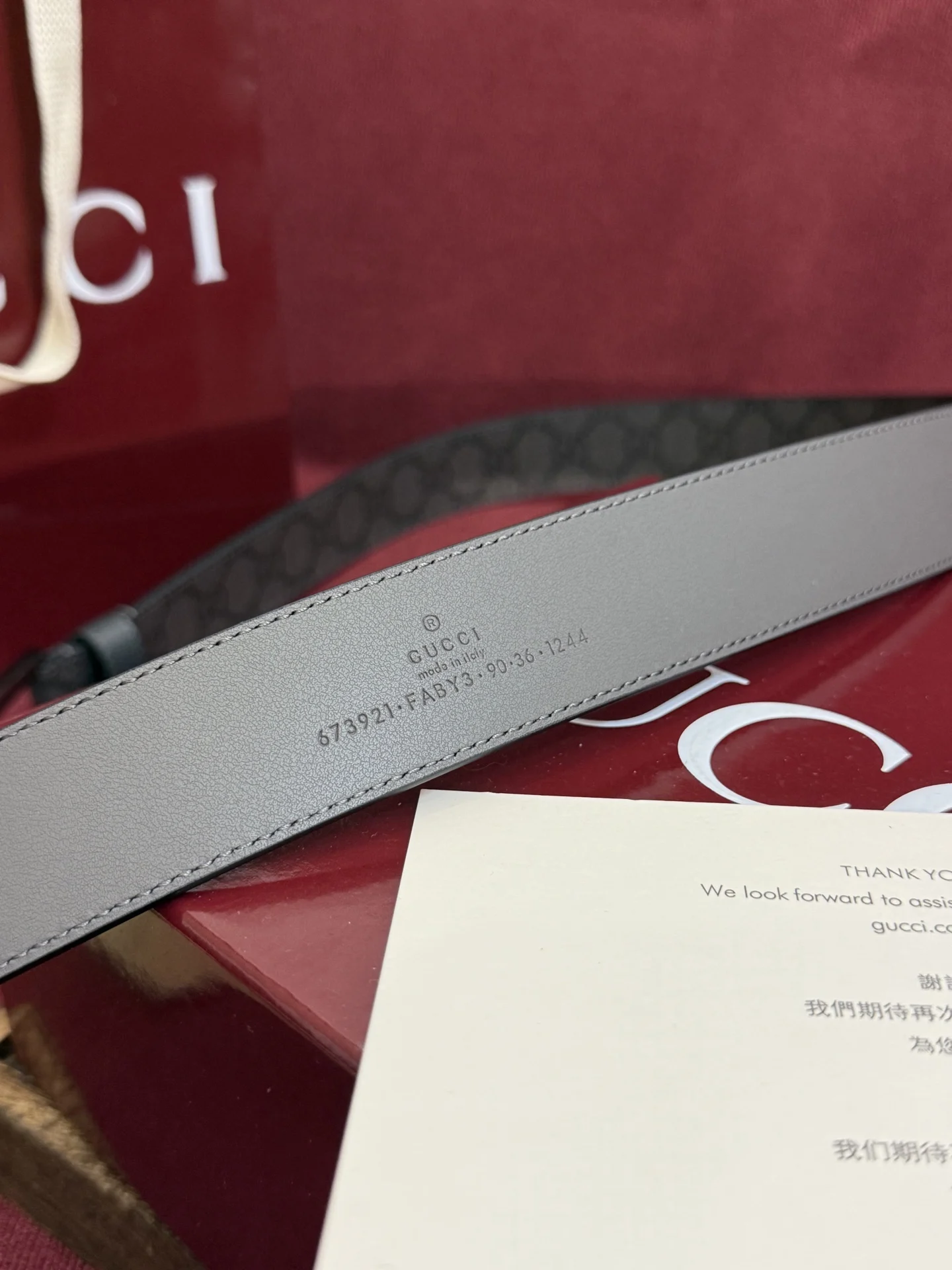 Gucci style 673921 FABY3 1244, gray custom PVC surface material, 3.5cm width, leather loop with stitched three-dimensional GG hardware, square minimalist pin buckle.