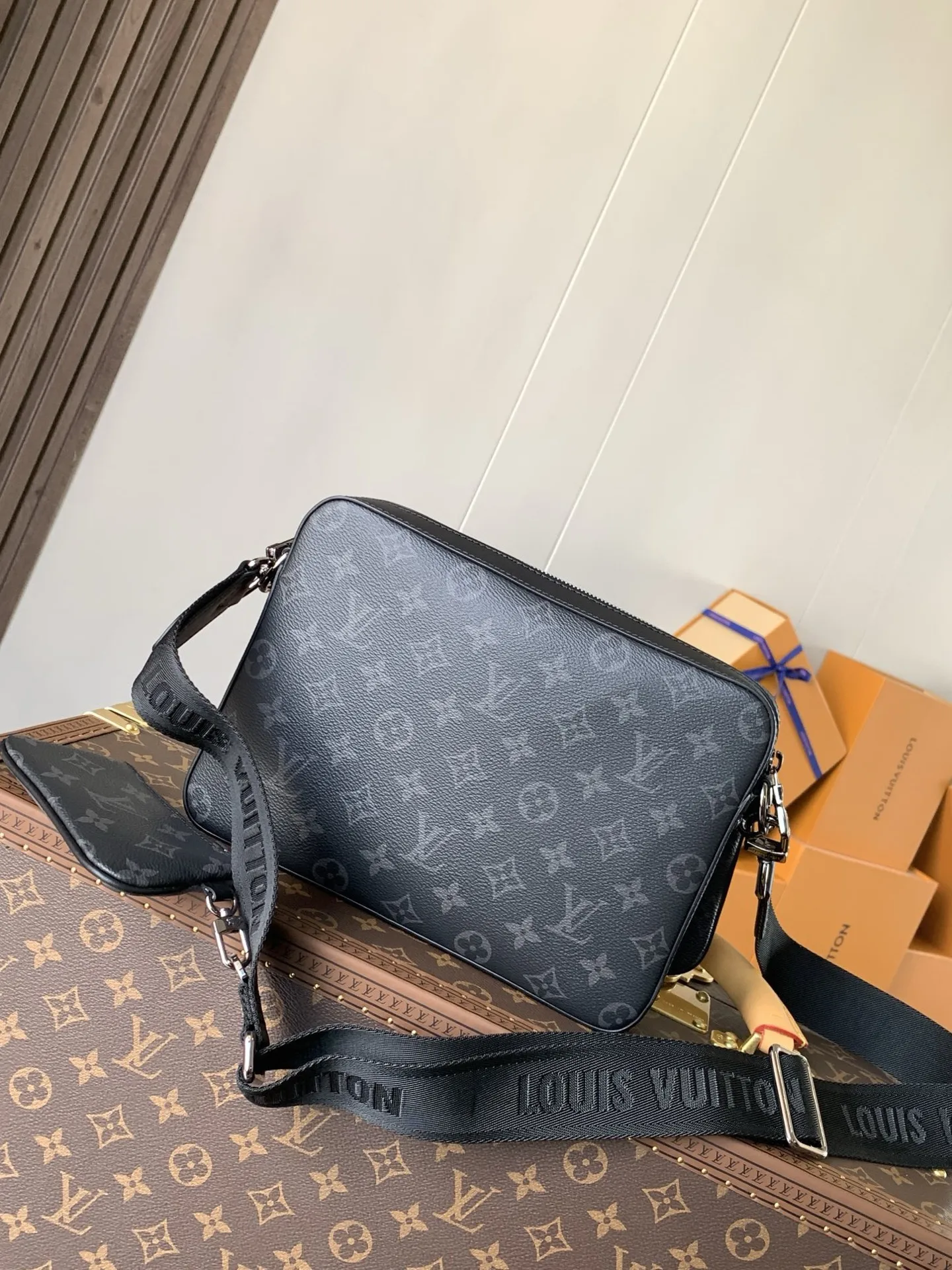 The classic Damier Graphite canvas from Louis Vuitton provides an eternal signature for this new version of the Trio Messenger. The main bag is complemented by a detachable zip pocket and a separate coin wallet that can be attached to the strap, making it perfect for carrying loose change and contactless payment cards. An elegant everyday bag that combines modern functionality with a unique traditional appearance. Dimensions: 25 x 18.5 x 7 cm