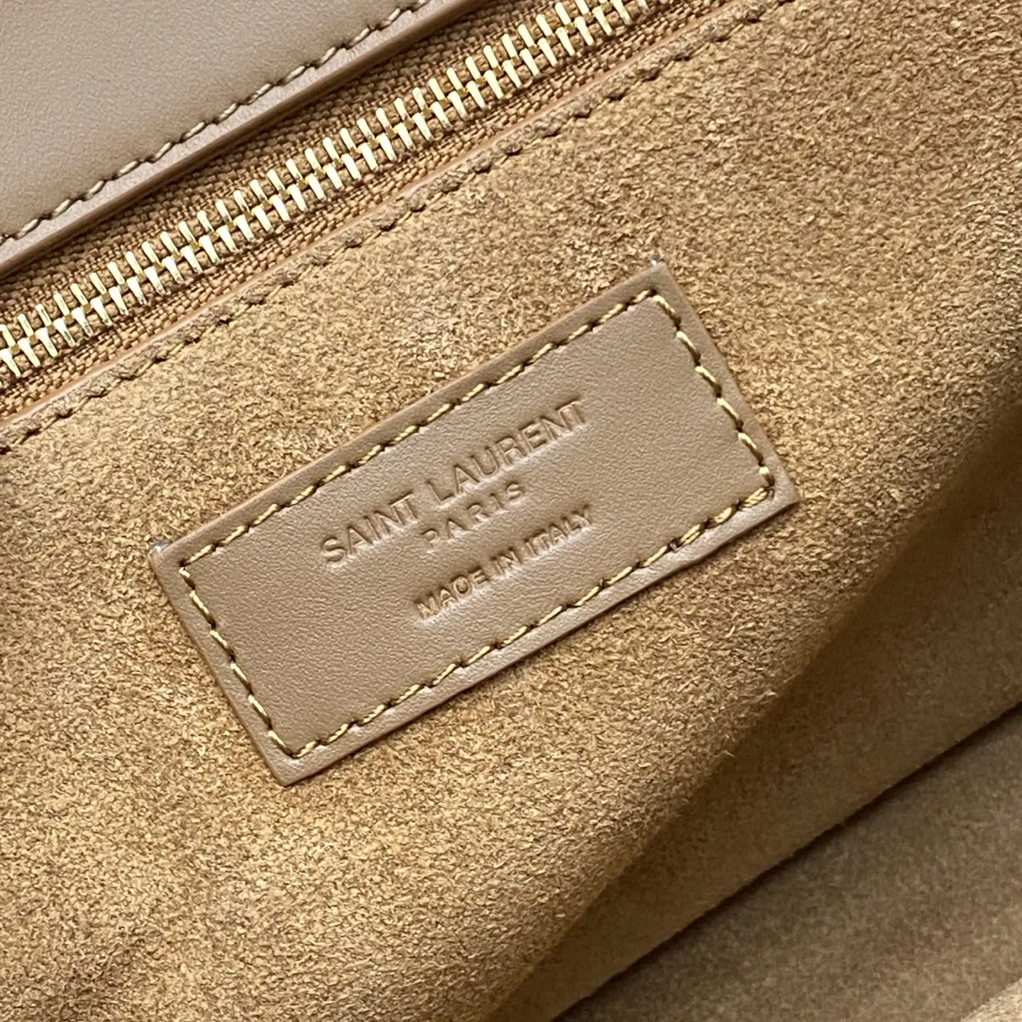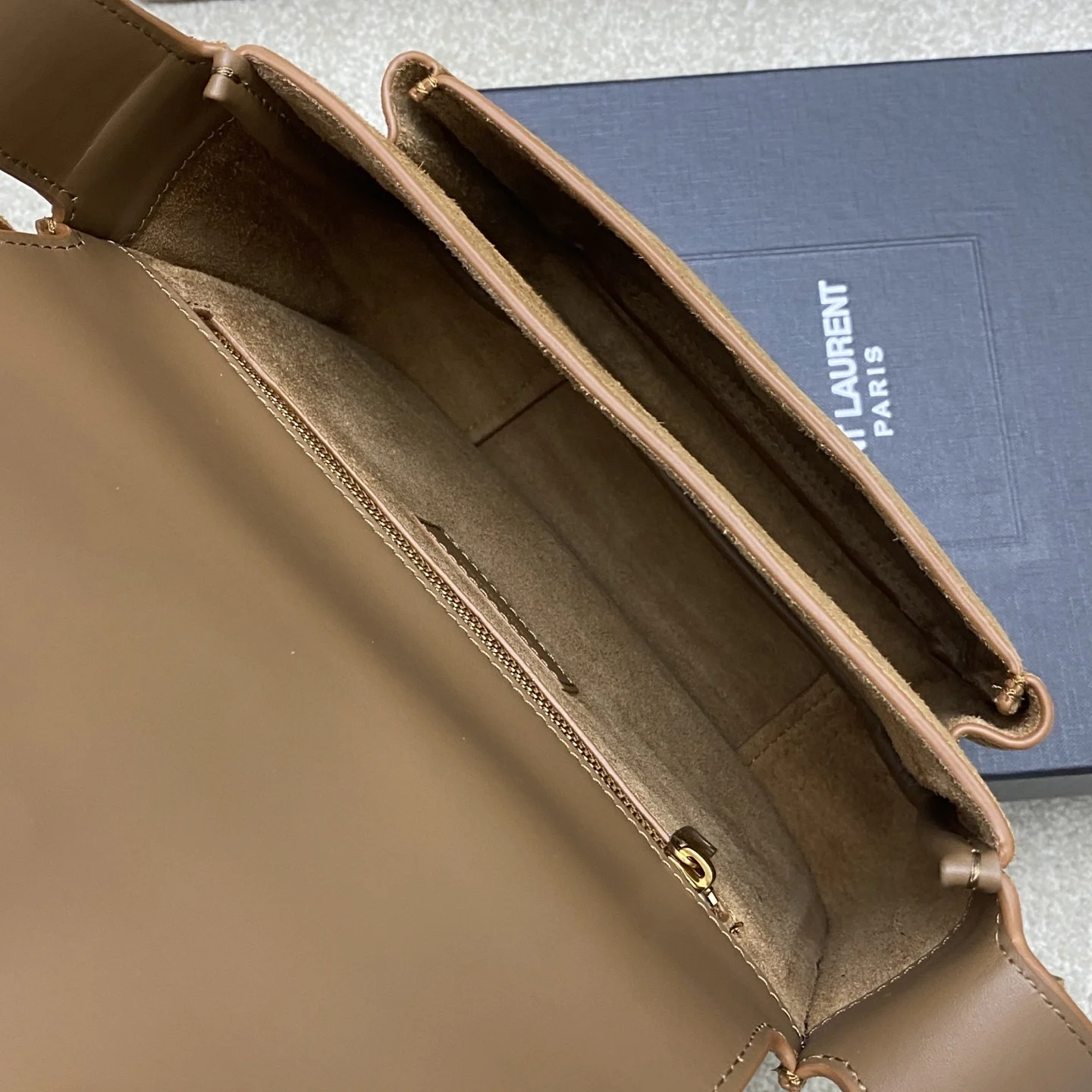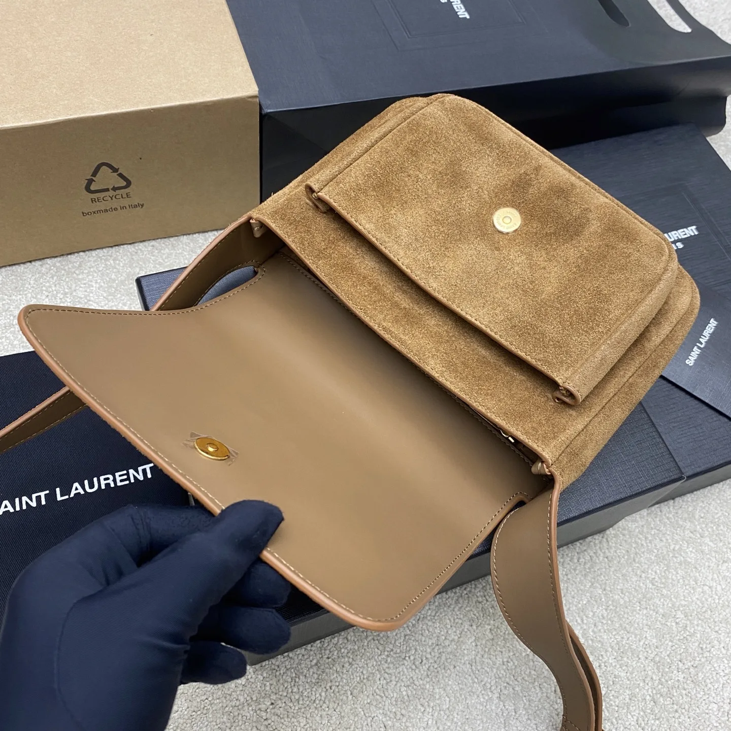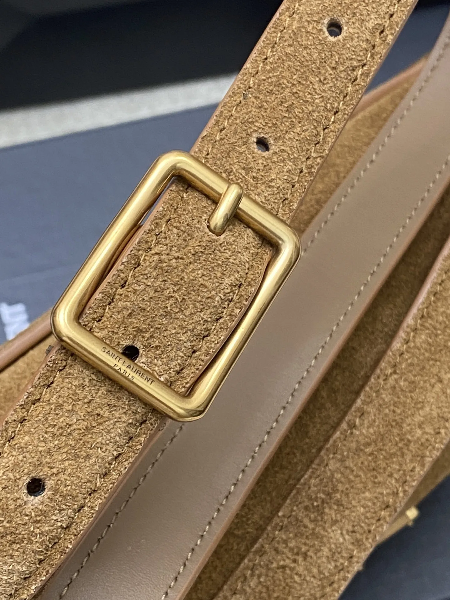The new Saint Laurent classic Niki handbag introduces a unique Besace saddle bag shape, crafted from caramel brown vegetable-tanned calfskin, adorned with a soft heart-shaped flap closure, highlighting the YSL gold logo buckle. The bag features 2 compartments and an adjustable shoulder strap, perfect for pairing with bohemian-style outfits or complementing the fall/winter Maillard style, exuding a vintage and fashionable vibe.