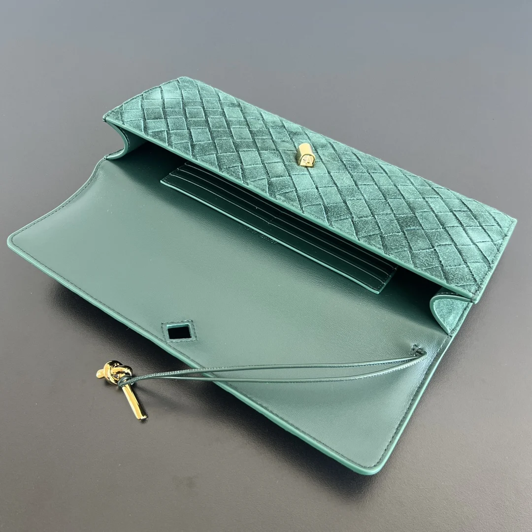 Bv Clutch Long Clutch 741511 with a handle. This clutch design embodies exquisite and sophisticated taste. Crafted from meticulously woven intreccio suede, it can be carried by hand, held, or worn under the arm. The metal rope knot embellishment exudes elegance and nobility. Featuring an interior zippered compartment, it s a perfect companion for your daily life. Whether you re walking the red carpet or attending a gala, it will add a unique charm to your ensemble. Dimensions: 31x13x3.