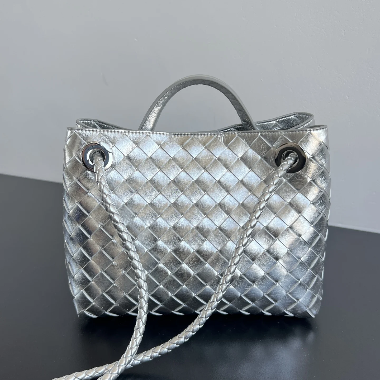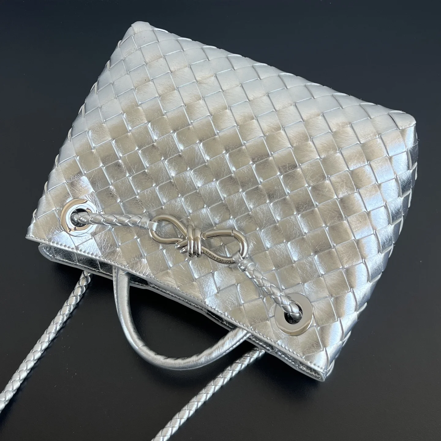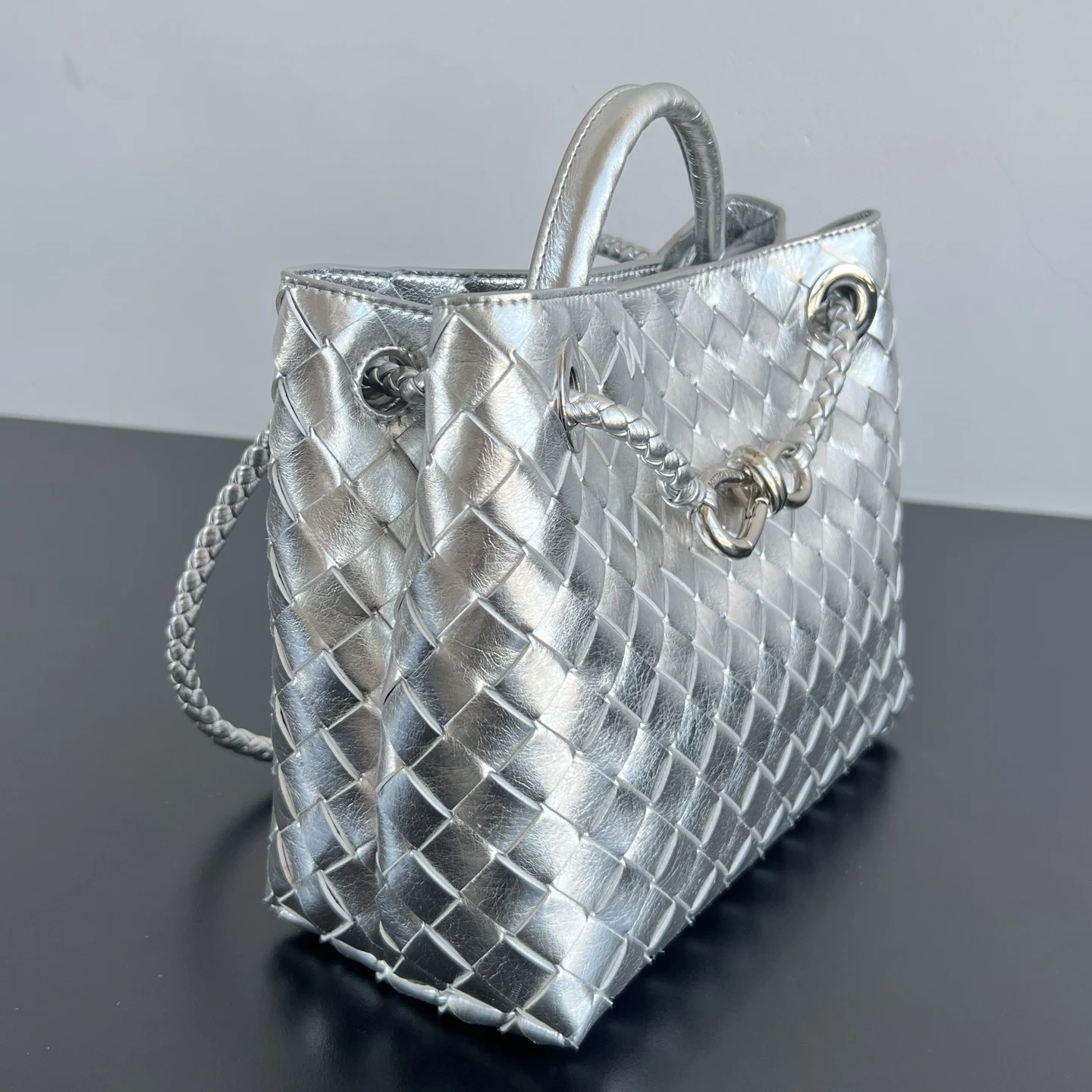 Bottega Veneta Andiamo Silver Woven Handbag, a celebrity favorite 743568. A striking and sophisticated piece , complemented by a gold knot closure for a balanced and elegant touch . Crafted entirely from Nappa lambskin, it offers a comfortable, soft, and dynamic feel. The adjustable sliding metal knot allows for versatile wear as a shoulder bag, handbag, or crossbody. With its spacious interior, it s suitable for commuting, daily use, and travel. Available in small, medium, and large sizes, there s a perfect fit for everyone. Take me home Dimensions: 25x22x10.5