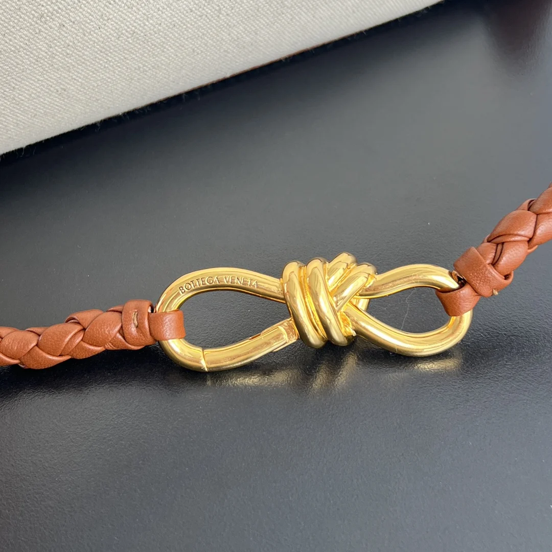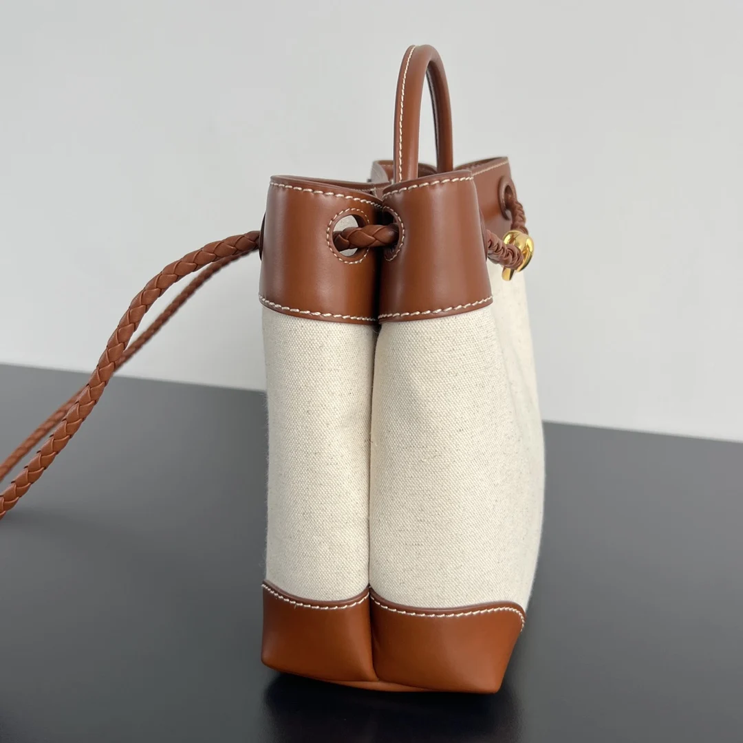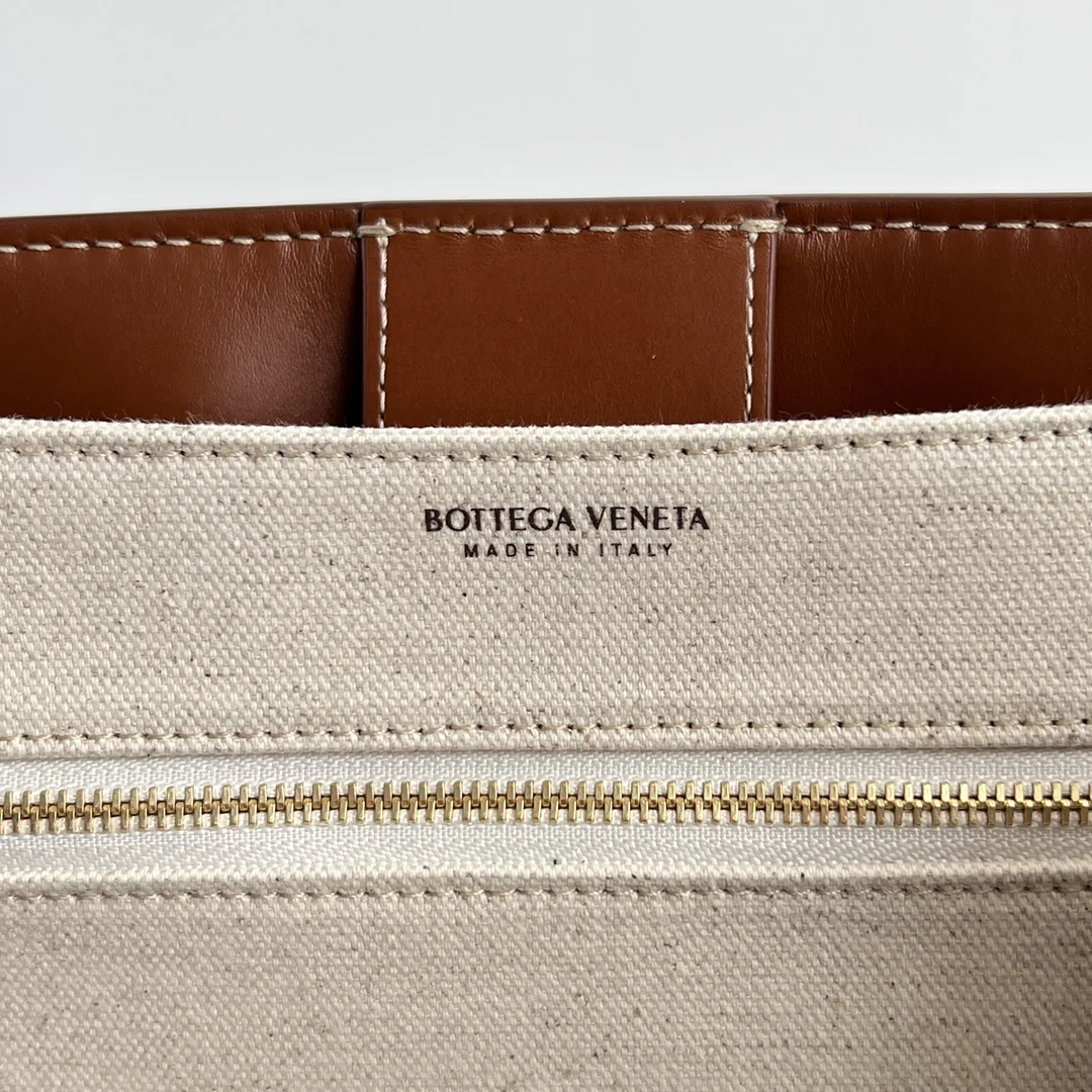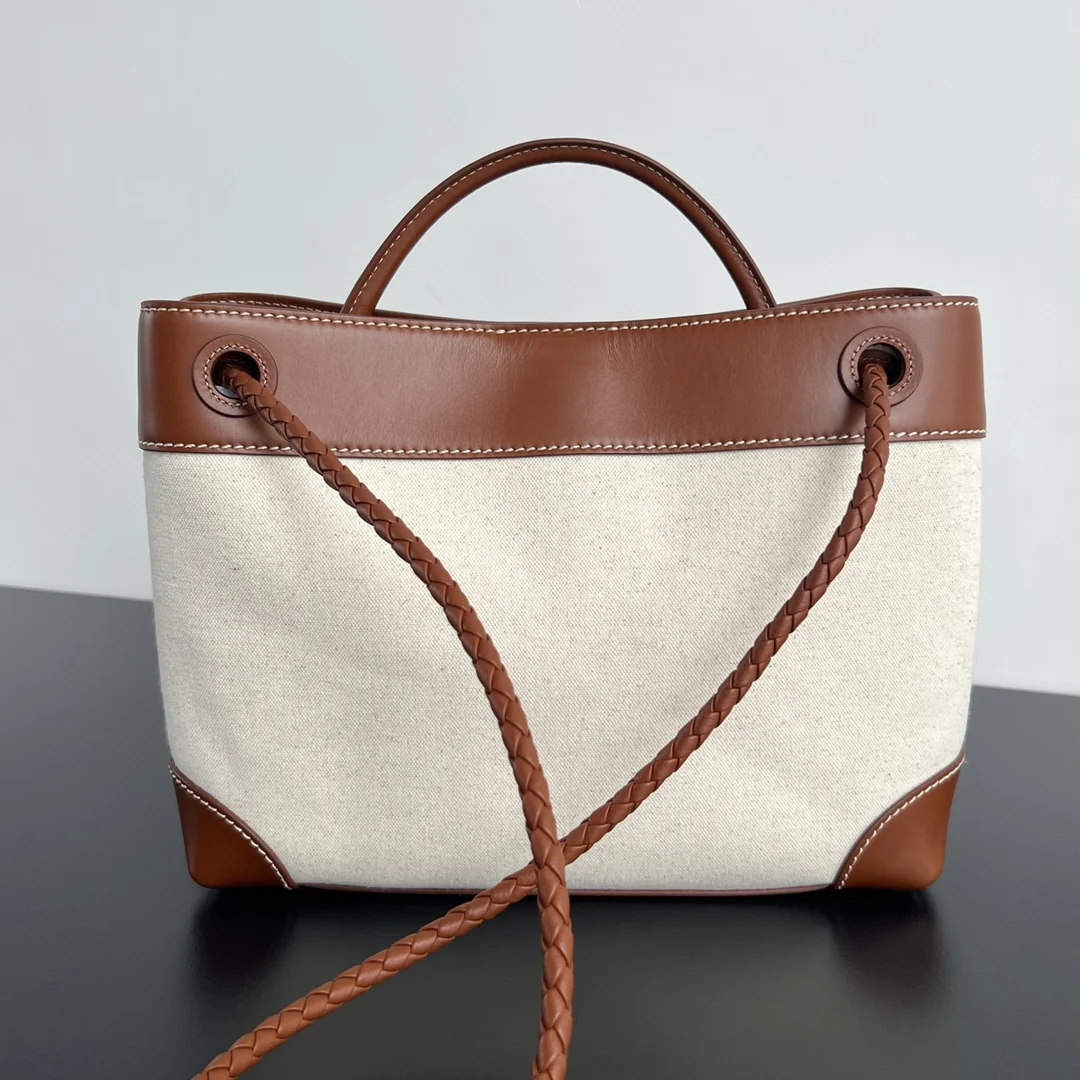 Bv Canvas and Leather Andiamo Bag 743572. Natural-colored calfskin paired with canvas - absolutely stunning! A standout piece . Combining exquisite craftsmanship with carefully selected materials, it is durable while offering an extremely soft touch. Features a brass metal knot leather-woven shoulder strap, offering multiple carrying options suitable for various occasions. Lightweight with a relaxed and effortless feel, it is more delicate than the all-leather version . Dimensions: 32.5x24x12.
