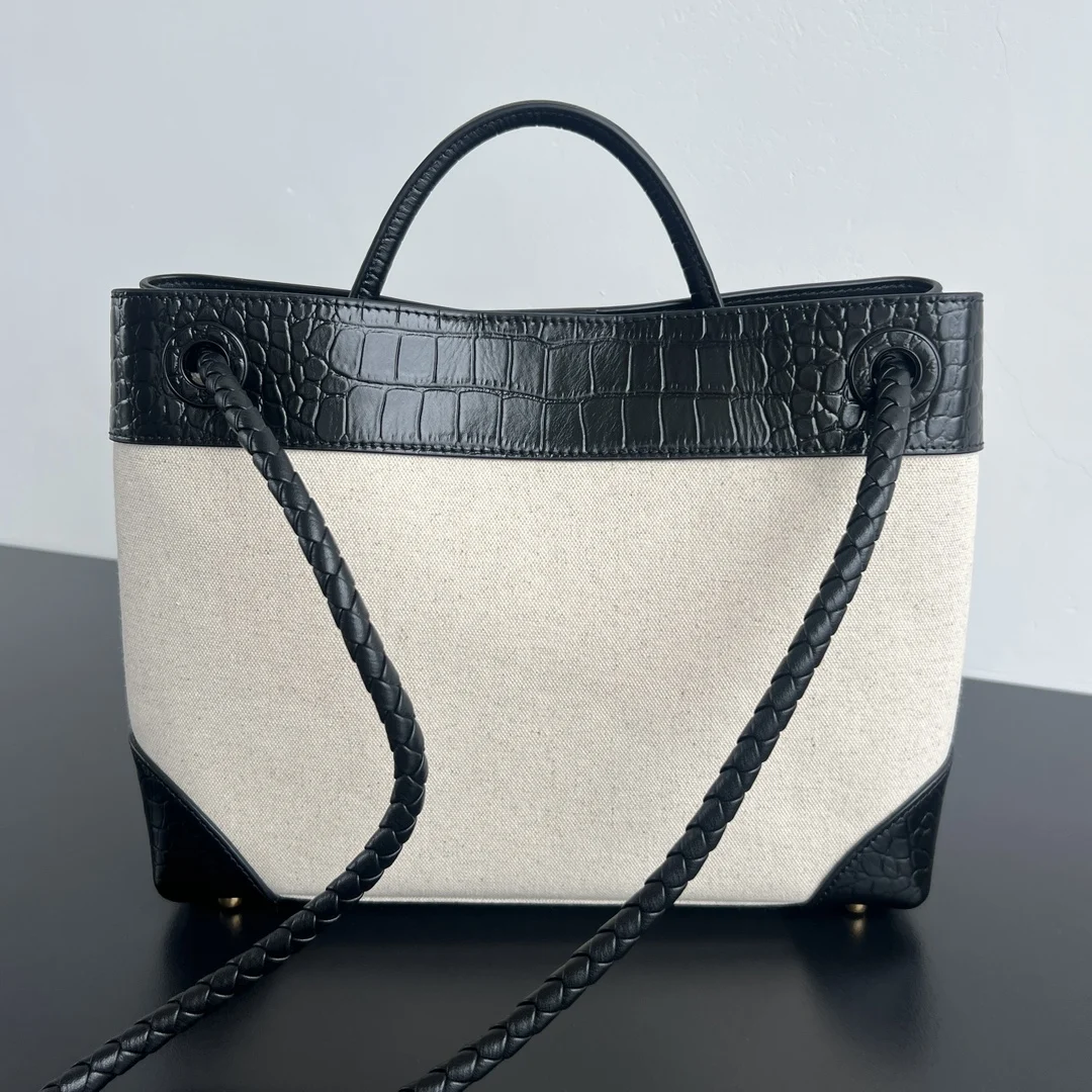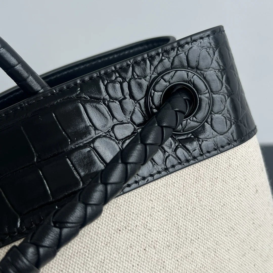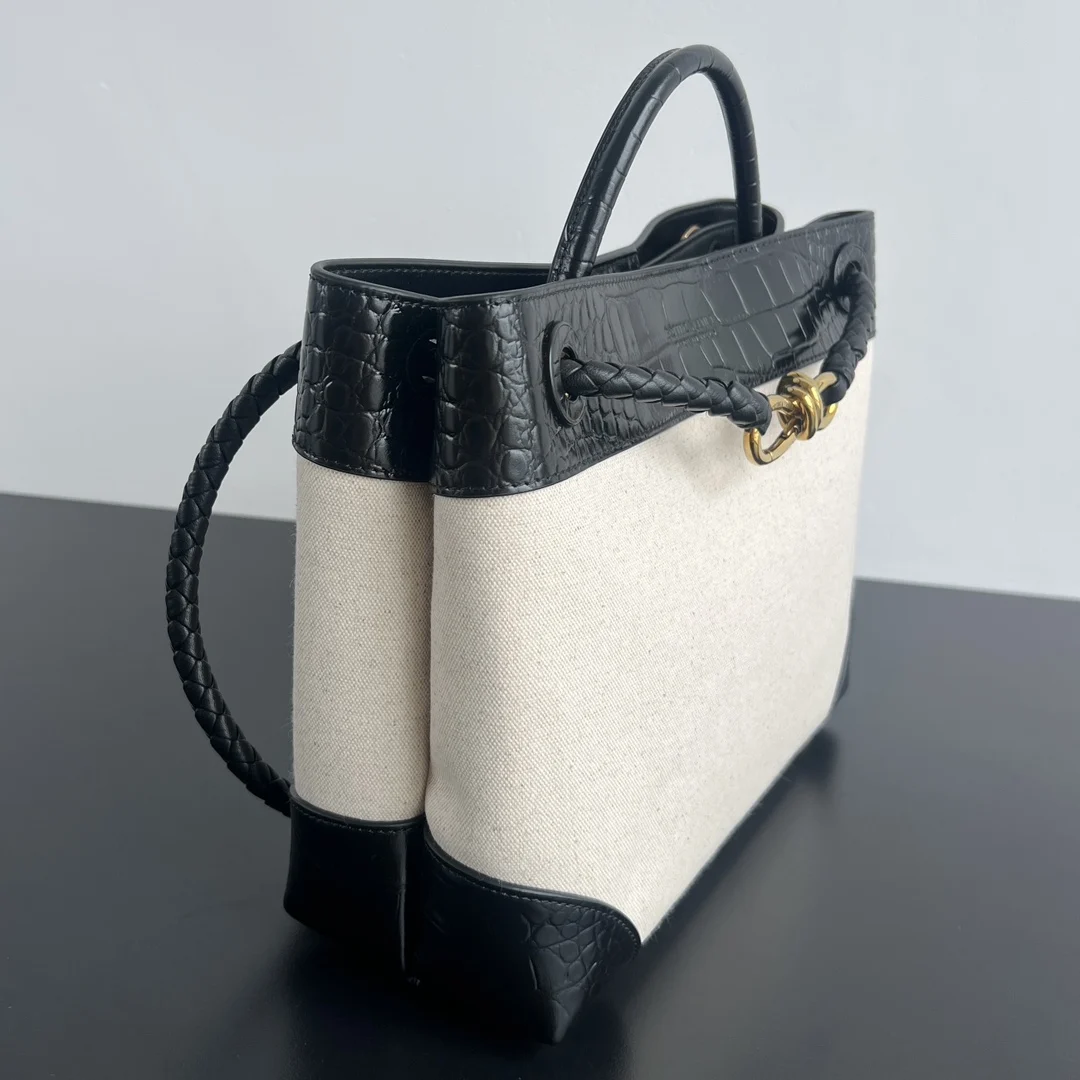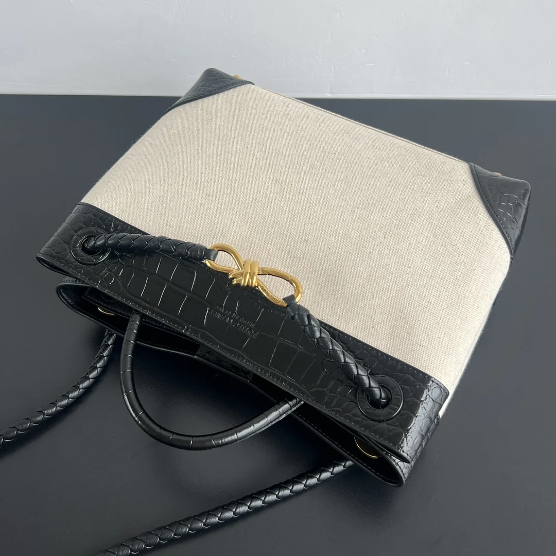 BV New Arrival: Andiamo 743572 in Crocodile-Embossed Leather and Canvas. The combination of crocodile-embossed leather and canvas exudes visible luxury. It s incredibly versatile and adds a touch of sophistication. The canvas material is lightweight yet highly durable, complemented by a metal knot closure, offering understated elegance without ostentatious logos. Perfect for both work and dates, it instantly elevates your overall style. Can be worn crossbody or carried by hand for an elegant look, truly combining beauty and practicality! [Firework] Dimensions: 32.5x24x12