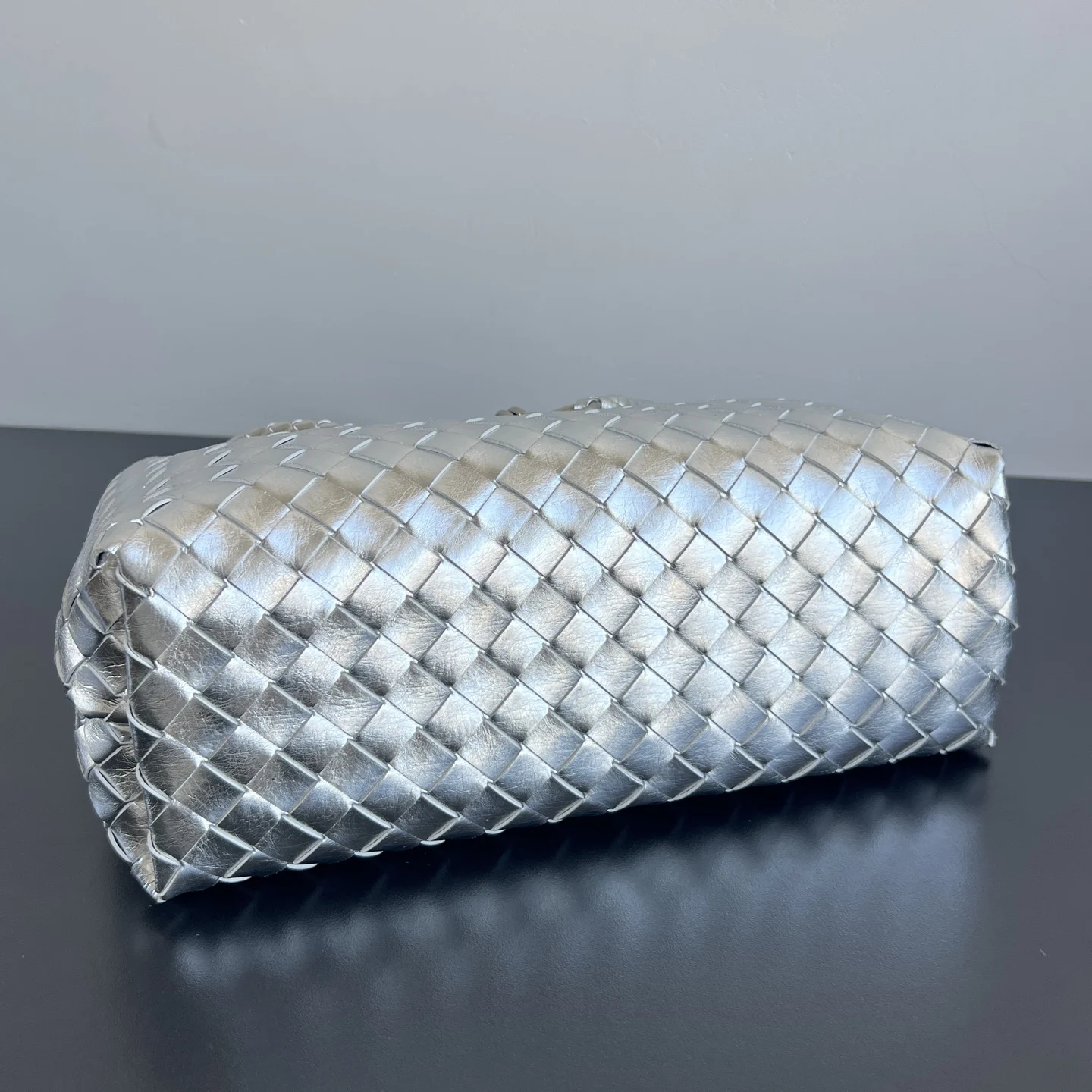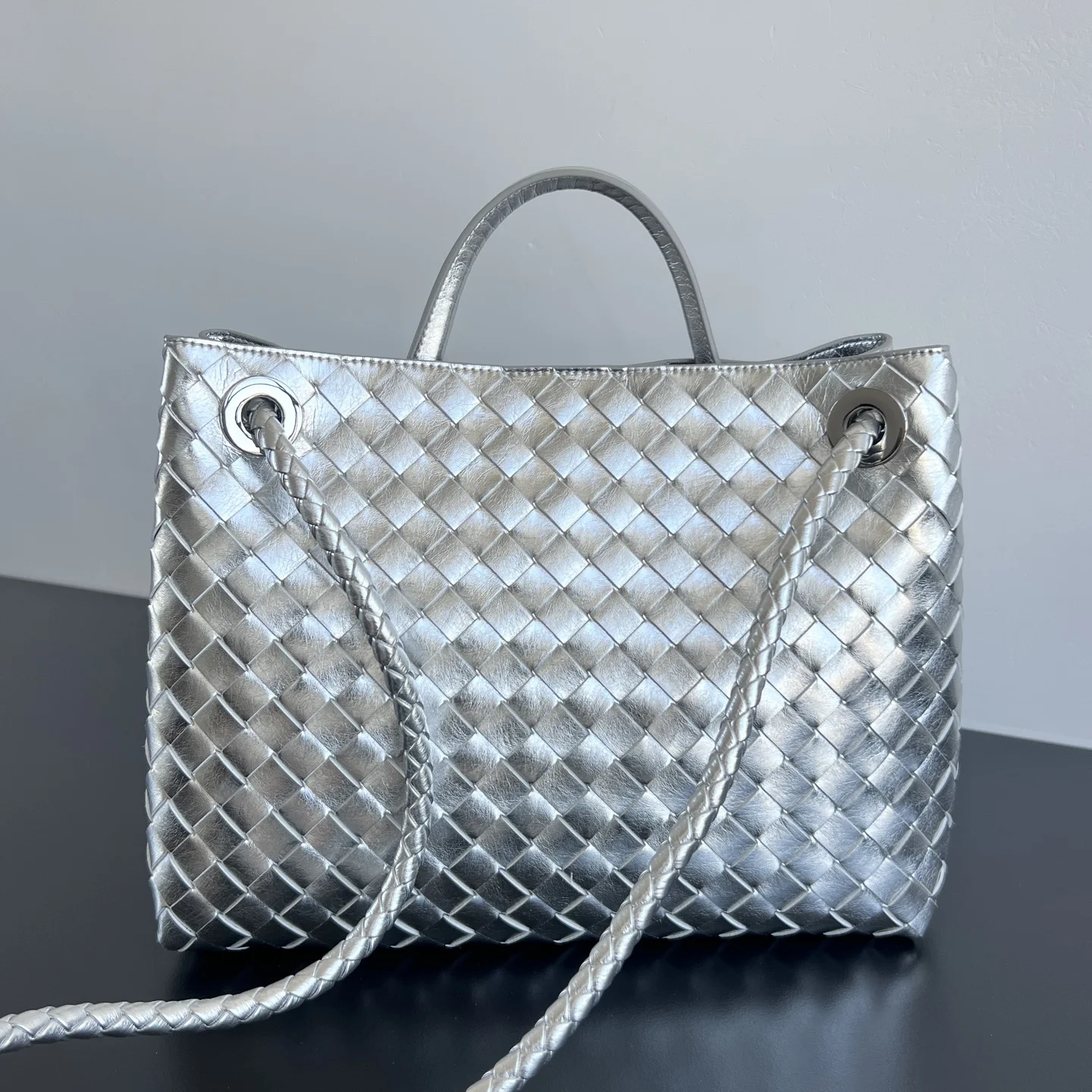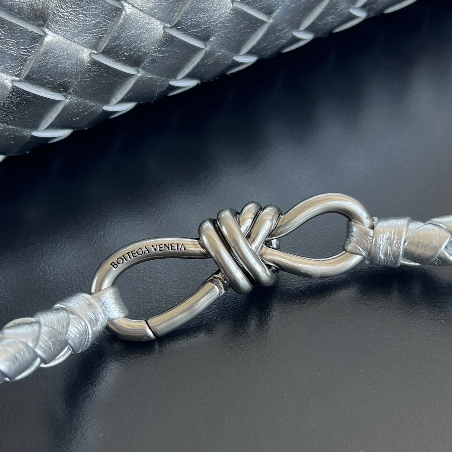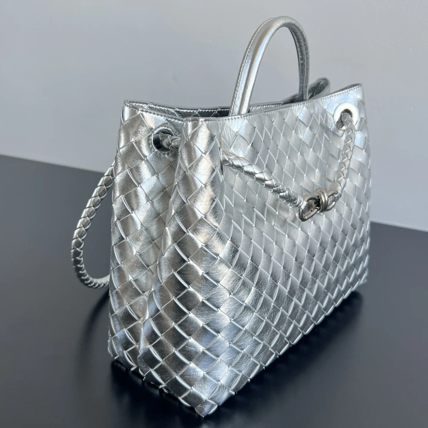 Bottega Veneta Andiamo Silver Woven Handbag, a celebrity favorite. Model number 743572. A striking and sophisticated piece. The gold knot closure adds a touch of understated elegance. Crafted entirely from Nappa lambskin, it s comfortable, soft, and dynamic. The sliding metal knot allows for adjustable straps, offering multiple carrying options: shoulder bag, handbag, or crossbody. With its generous capacity, it s suitable for commuting, daily use, and travel. Available in small, medium, and large sizes. Dimensions: 32.5x24x12.