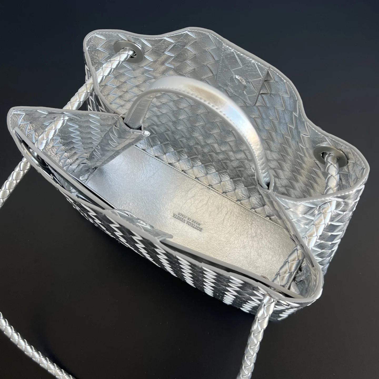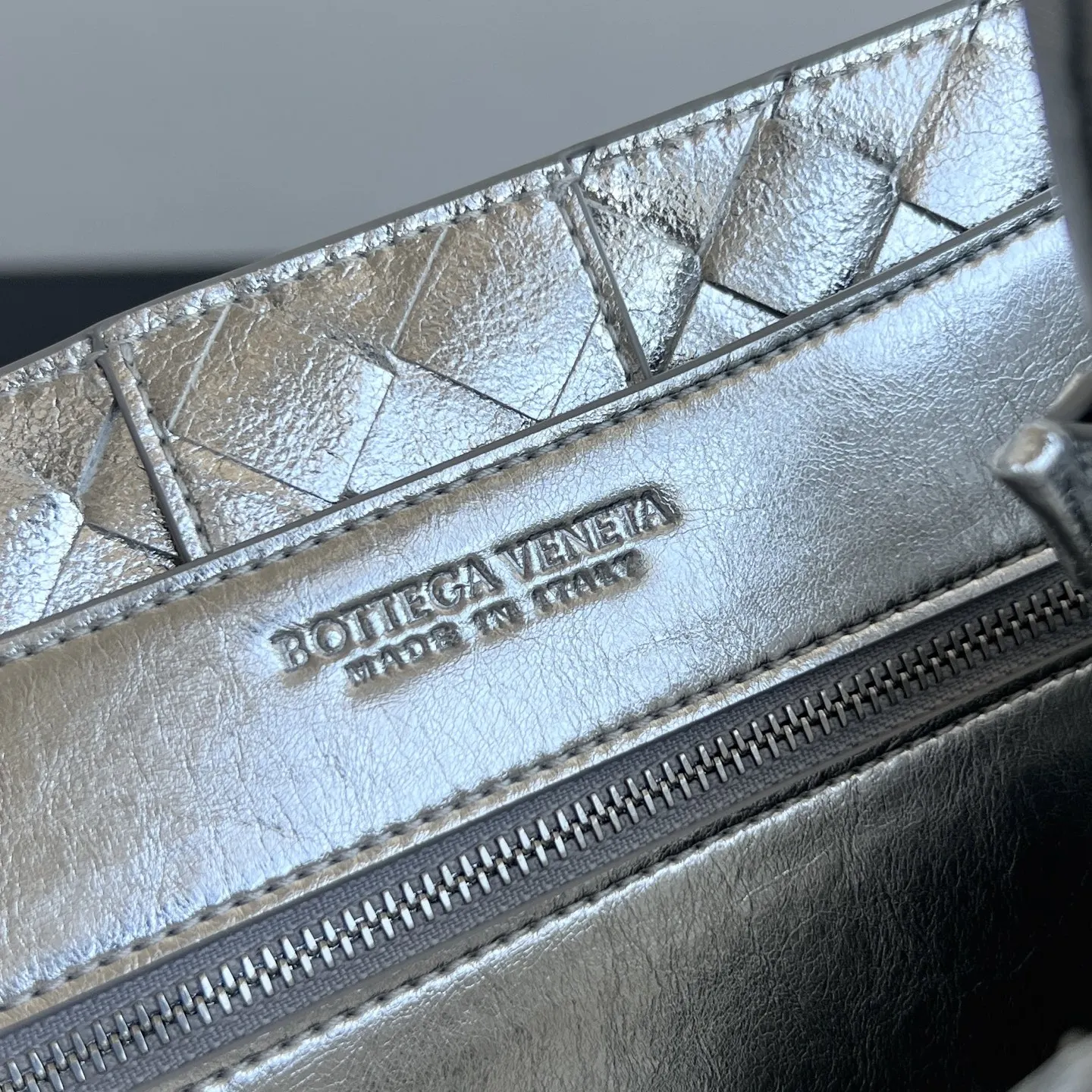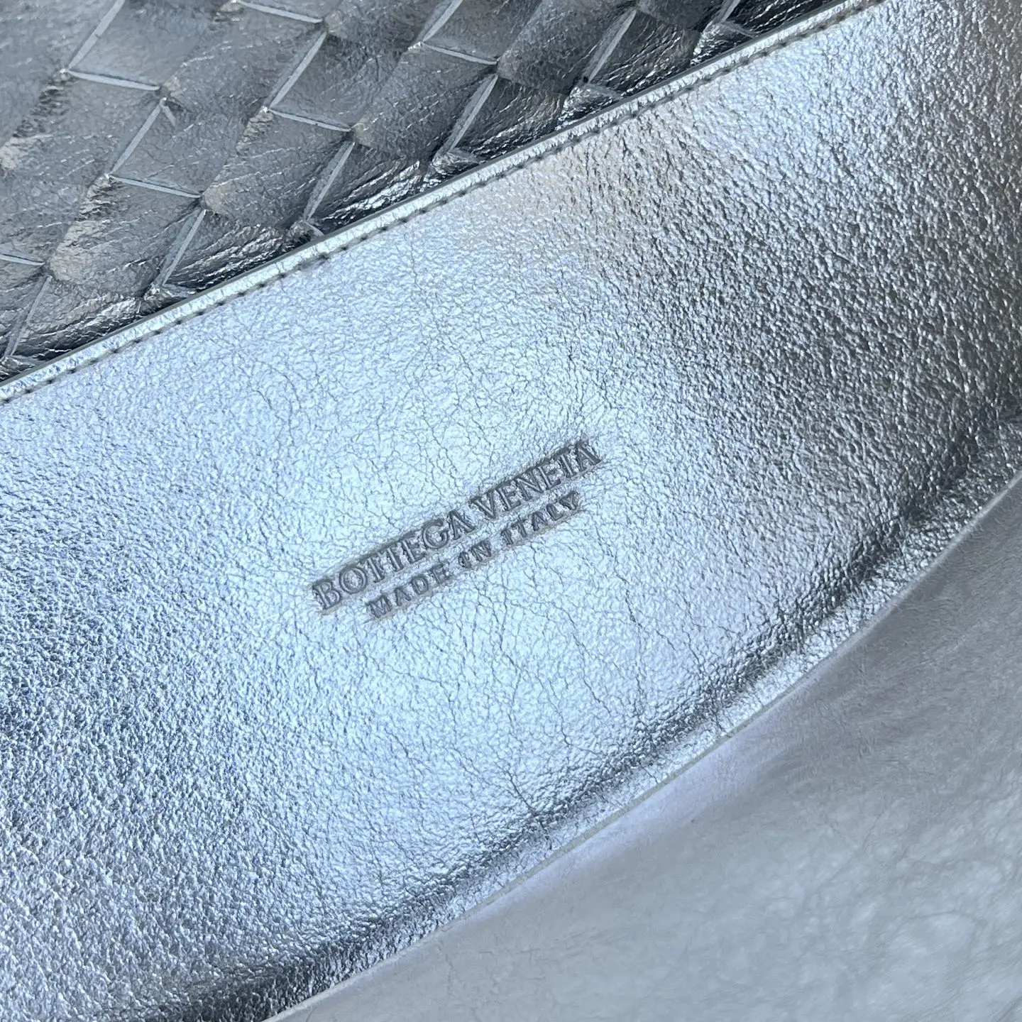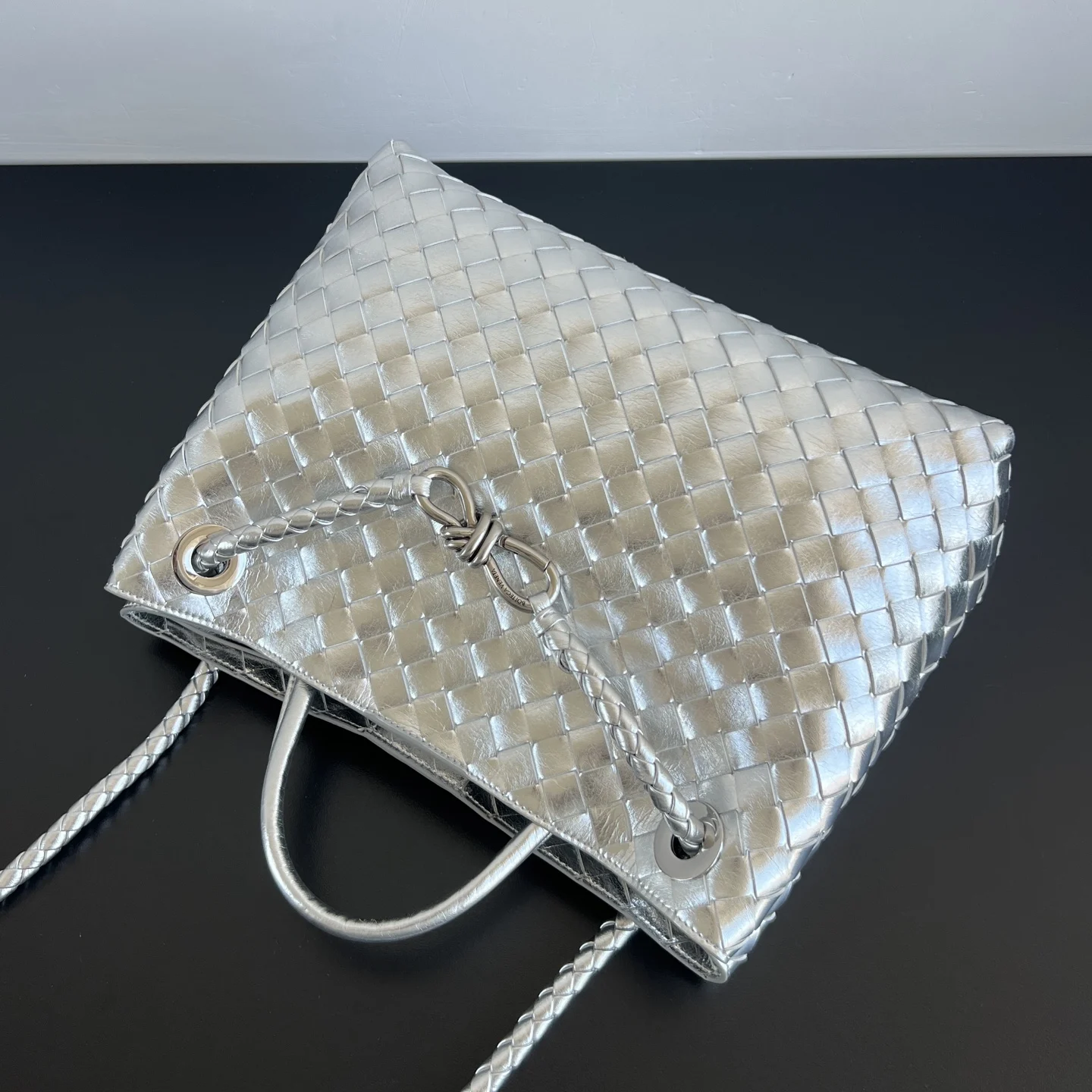 Bottega Veneta Andiamo Silver Woven Handbag, a celebrity favorite. Model number 743572. A striking and sophisticated piece. The gold knot closure adds a touch of understated elegance. Crafted entirely from Nappa lambskin, it s comfortable, soft, and dynamic. The sliding metal knot allows for adjustable straps, offering multiple carrying options: shoulder bag, handbag, or crossbody. With its generous capacity, it s suitable for commuting, daily use, and travel. Available in small, medium, and large sizes. Dimensions: 32.5x24x12.