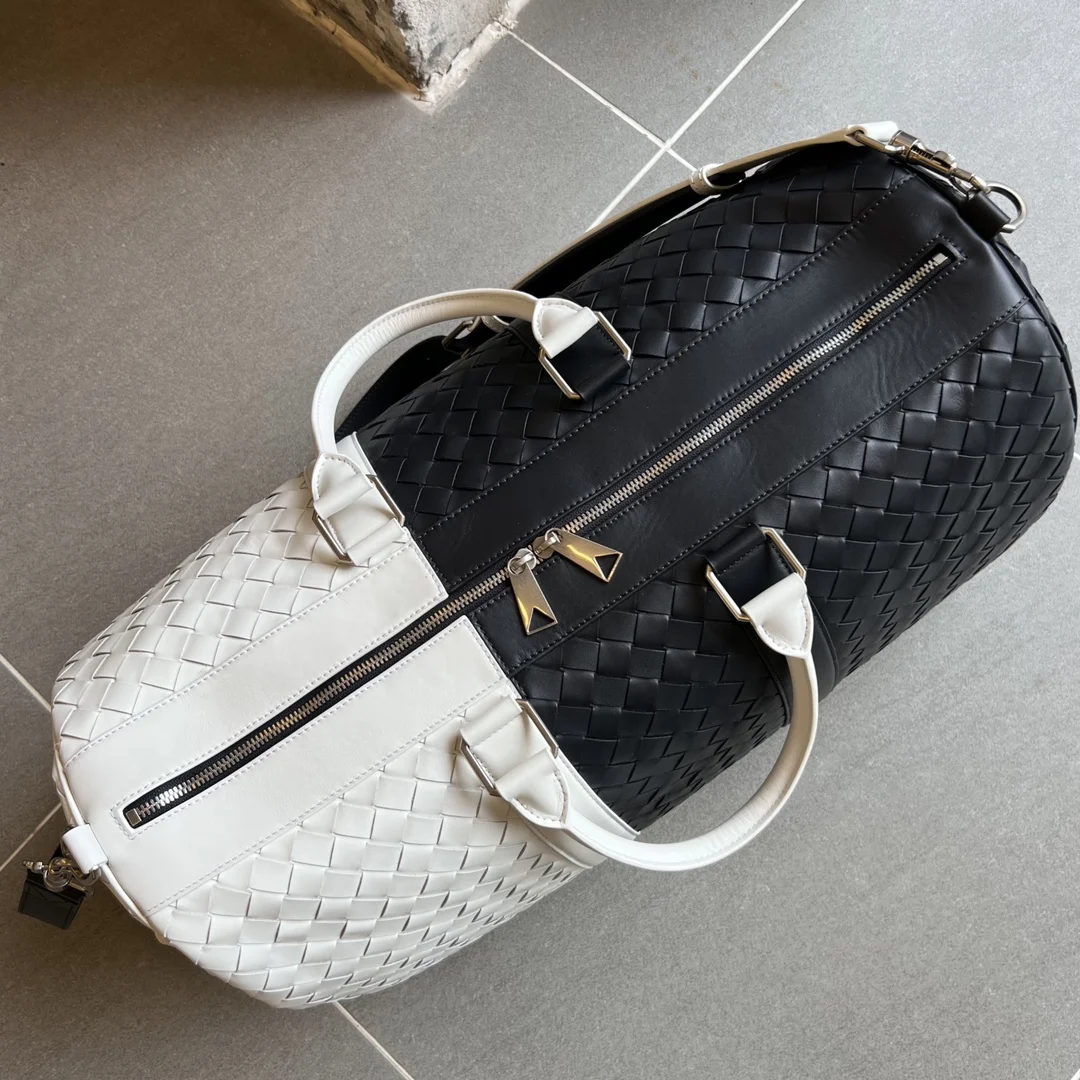 Bv intrecciato woven 755127 Travel Bag. This oversized bag offers ultimate quality, fulfilling all your travel needs. Crafted inside and out with supple woven calfskin leather, it showcases high quality and sophistication. Each touch reveals its unique texture. Ample interior and exterior pockets, along with a detachable inner pouch, ensure durability, lightweight convenience, and easy storage. This travel bag is an indispensable companion for your journeys. Dimensions: Width 50cm * Height 27cm * Depth 24cm * Handle 15cm * Shoulder Strap 55cm.
