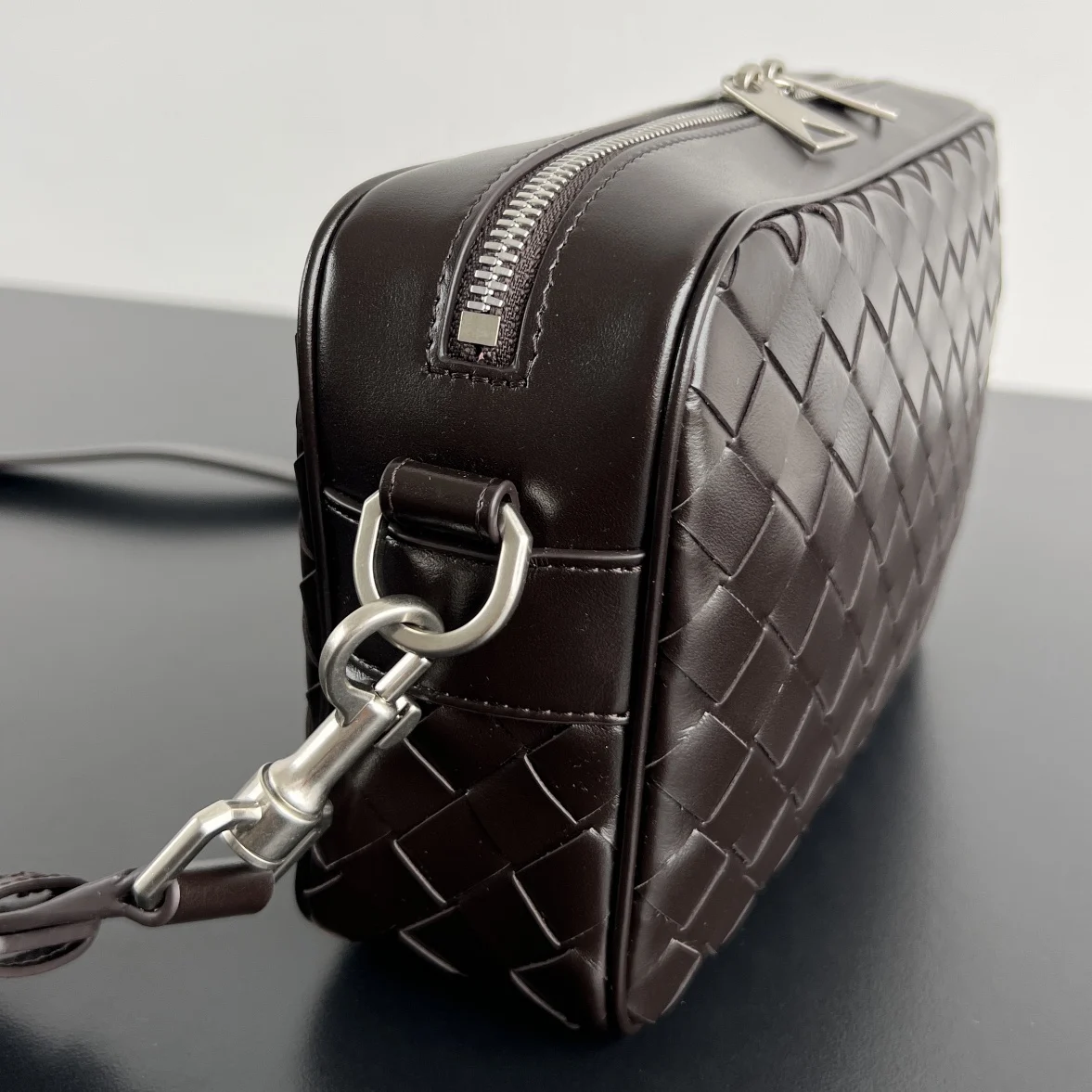 BV s new woven camera bag 755923 The most frequently used crossbody bag for men, balancing trend and practicality. Crafted with soft calfskin leather using the Intrecciato weav..