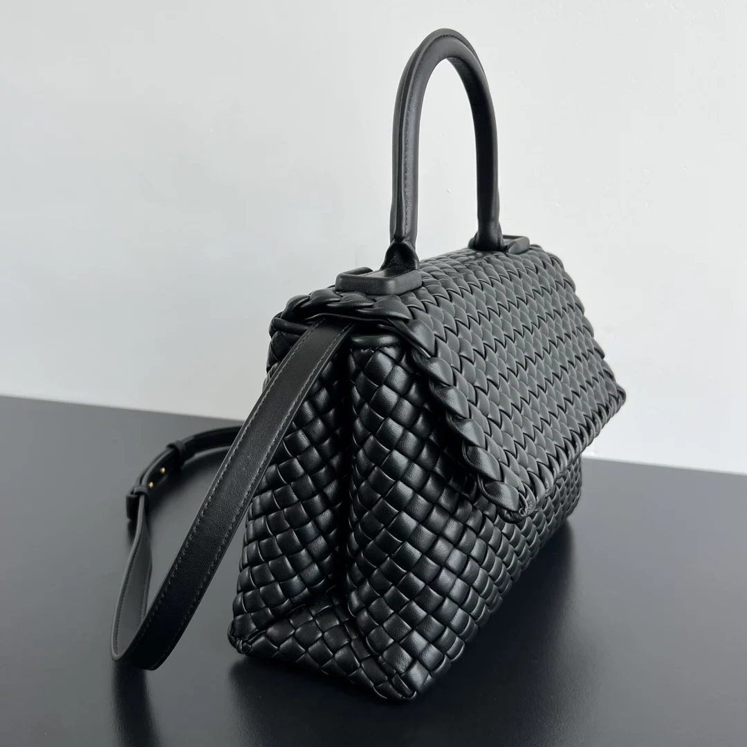 B s new 776783 Fall Winter Patti top handle woven flap handbag can be used as a shoulder bag, top handle bag, or crossbody bag. The shoulder strap is detachable, making it an elega..