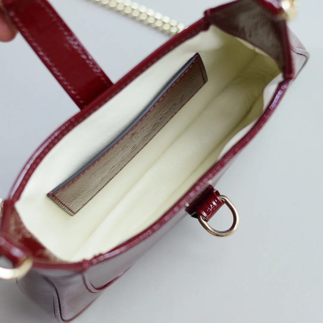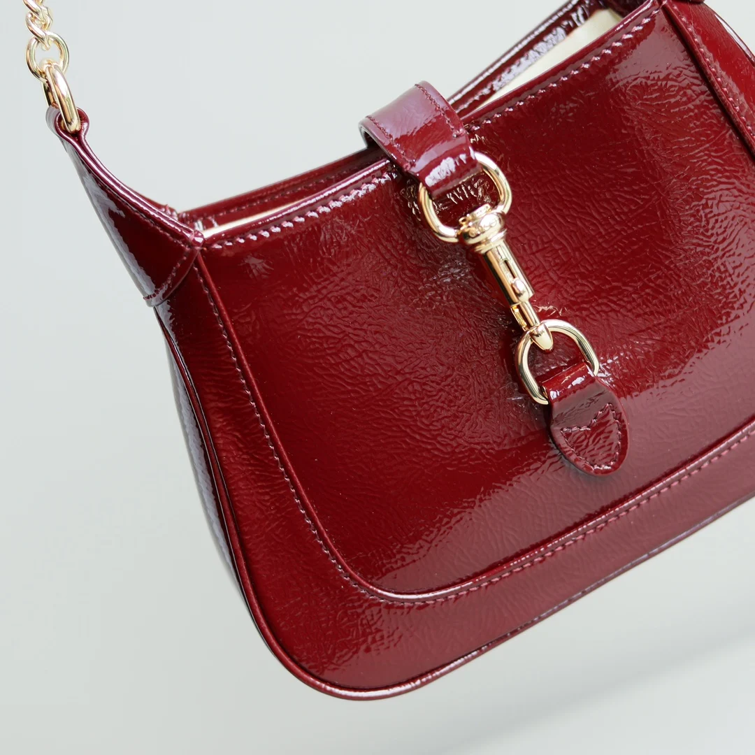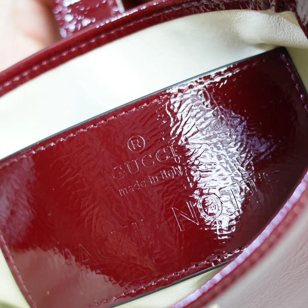 Jackie Notte mini shoulder bag. This new Jackie Notte handbag, designed by Creative Director Sabato De Sarno, vividly showcases the confident heritage of the classic Jackie line, carefully blending a new silhouette with refined details to create the ideal accessory for evening looks. The off-white patent leather and hook closure are paired with a light gold-toned Gu letter chain, giving this mini shoulder bag a distinctive sense of style. Black patent leather, gold-toned hardware, leather lining, interior: one open pocket, decorated with the Gu trademark and handwritten Jackie Notte lettering, Gu letter chain shoulder strap, each letter is fixed by hand, 54 cm drop, hook closure, weight: approximately 0.35 kg. Model: 782889 Dimensions: 19.5 (W) x 18 (H) x 3.5 cm (D) Color: Black patent leather, original leather. Made in Italy. The model is 177 cm tall and can accommodate an iPhone Pro Max Plus, AirPods, card holder, and lipstick.