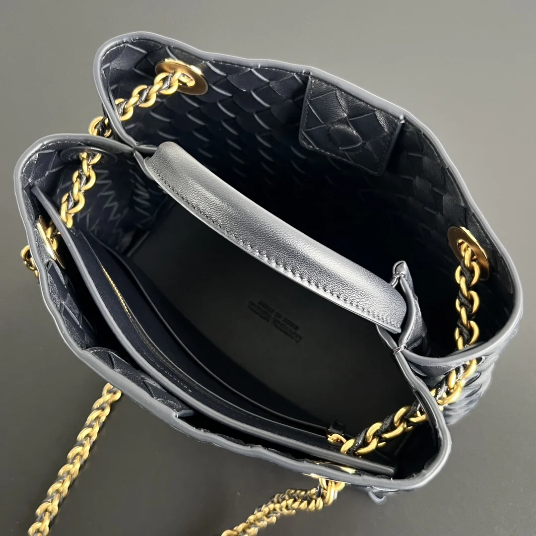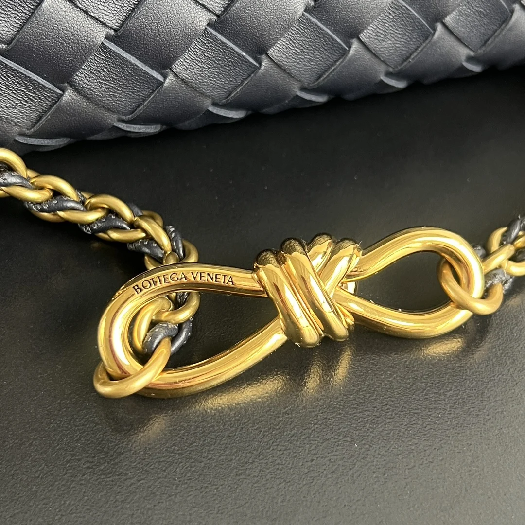The Bv Andiamo has been upgraded! 786008, black and gold chain adds a touch of sophistication . The lambskin weave is absolutely divine Black leather strips interwoven with a gold chain , paired with a sliding metal brass knot buckle for easy shoulder strap adjustment . Each piece is filled with exquisite craftsmanship, and the overall look is both high-end and timeless. It can be powerful or relaxed, perfectly blending into any corner of the city . Size: 25x22x10.5