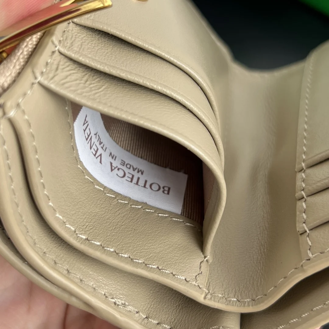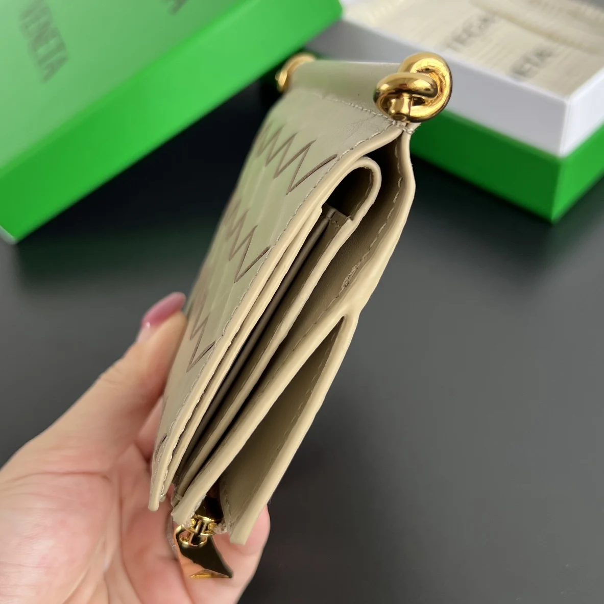 BV s new Solstice series short wallet 788055 features classic woven leather with metal hardware details, enhancing the design and integrity of the appearance . Made of soft and comfortable calfskin with a glossy finish, the flap handle features tubular Kont metal accents for a striking visual impact . Snap closure, with well-organized interior compartments for both cash and cards. A practical and unique wallet is the way to go . Size: 11.5*10*1cm