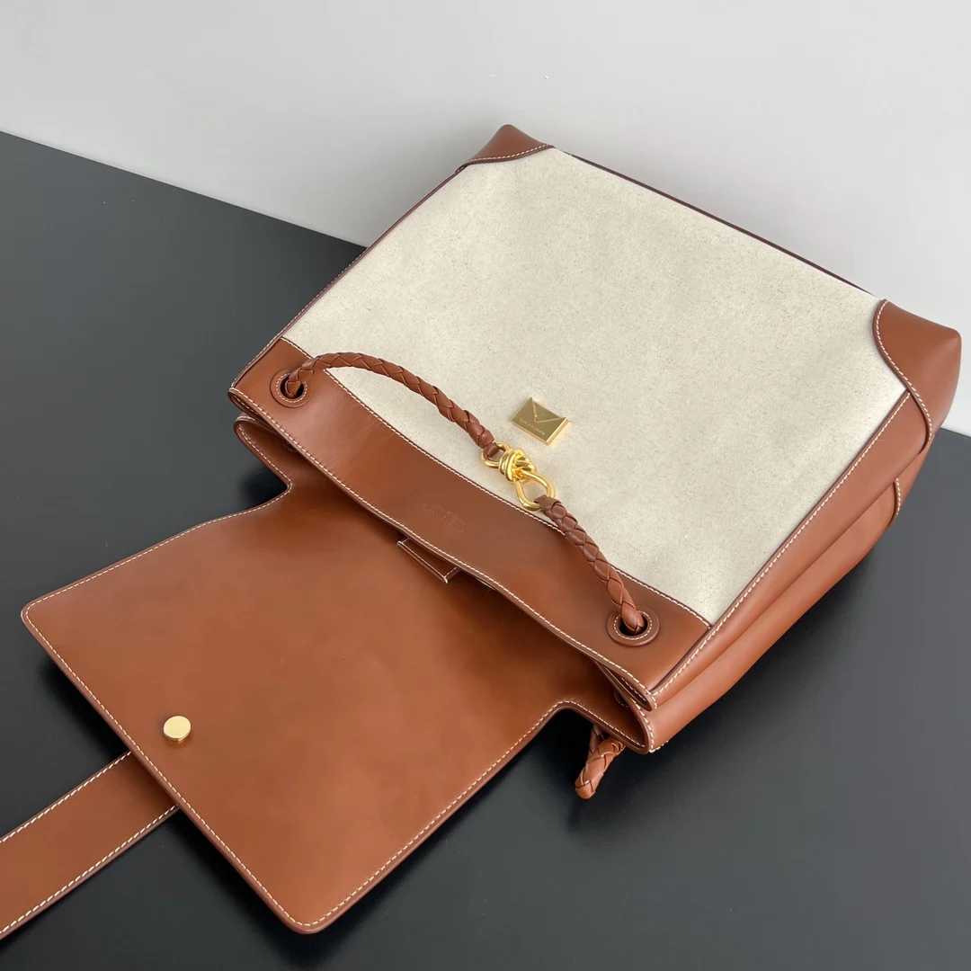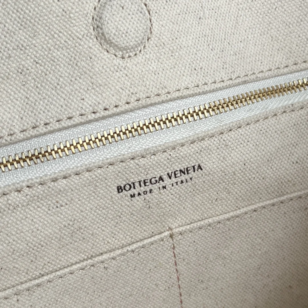 Bv Canvas and Leather Andiamo Shoulder Bag, 789039. Log-colored calfskin paired with canvas is simply stunning! It exudes a sense of distinction . Combining exquisite craftsmanship with carefully selected materials, it is both durable and exceptionally soft to the touch. The brass metal knot leather-woven shoulder strap and wide strap allow it to be worn as a shoulder bag, freeing your hands. Suitable for various occasions, it is lightweight and exudes a relaxed and lazy vibe, making every shot a masterpiece . Dimensions: 48x40x20.
