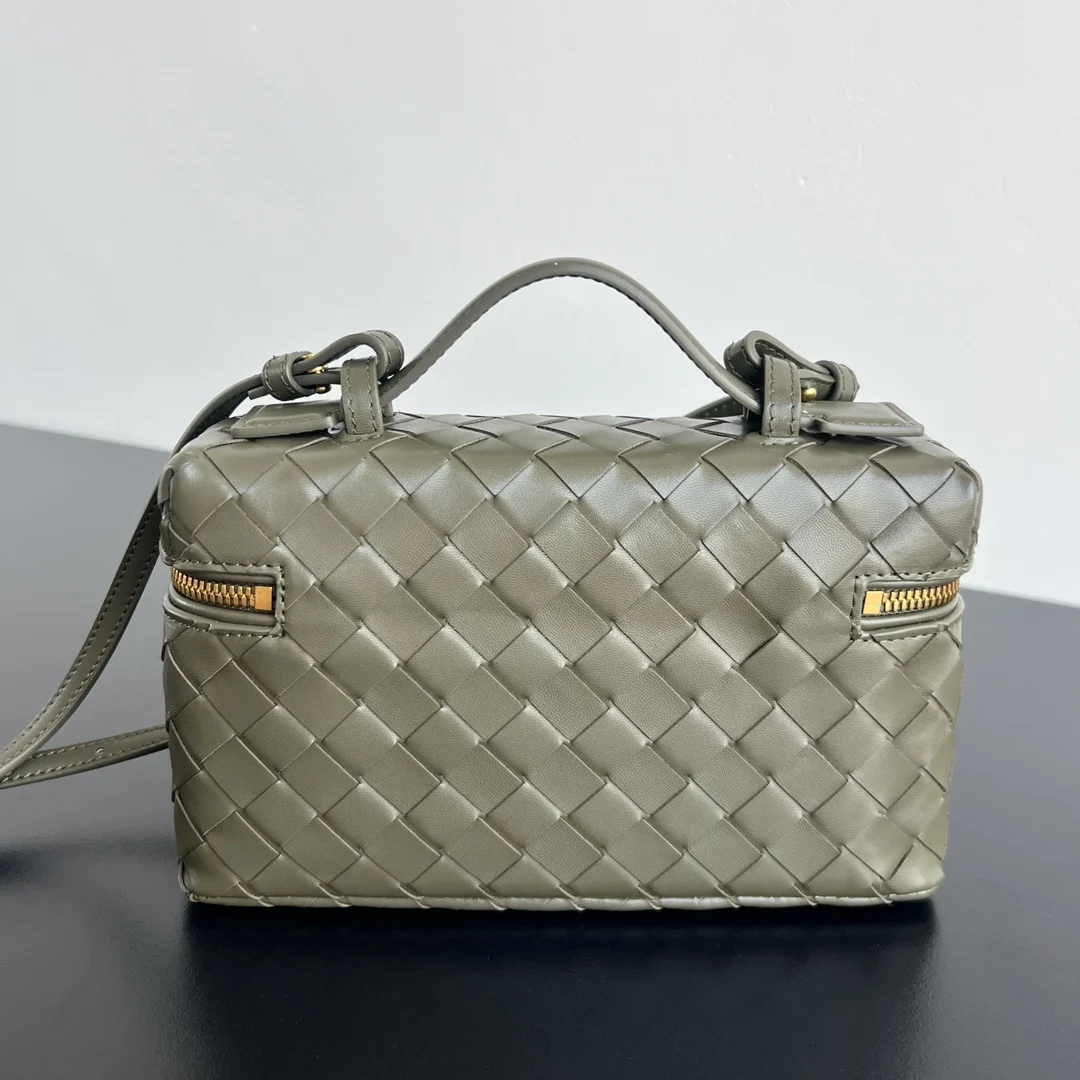 BV s new Vanity Case with strap, style 789109, is an ultra-practical and stylish boxy cosmetic bag. It features the brand s most iconic woven calfskin leather, complemented by a two-way zipper closure. The overall style is retro and elegant. It has a top handle and an adjustable shoulder strap, allowing for elegant hand-carrying or casual crossbody wear, unlocking various styling scenarios. Dimensions: 22x12.5x5.