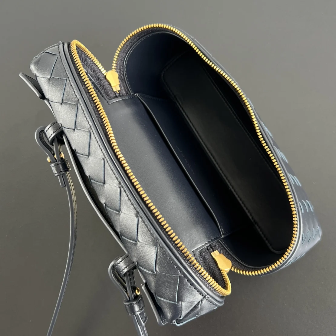 BV s new Vanity Case with strap, 789109 , is a super practical and stylish boxy makeup bag [fireworks]. It features the brand s most classic woven calfskin, paired with a two-way z..