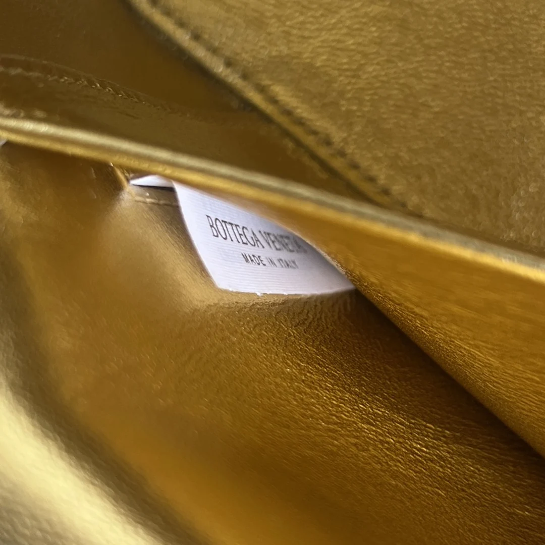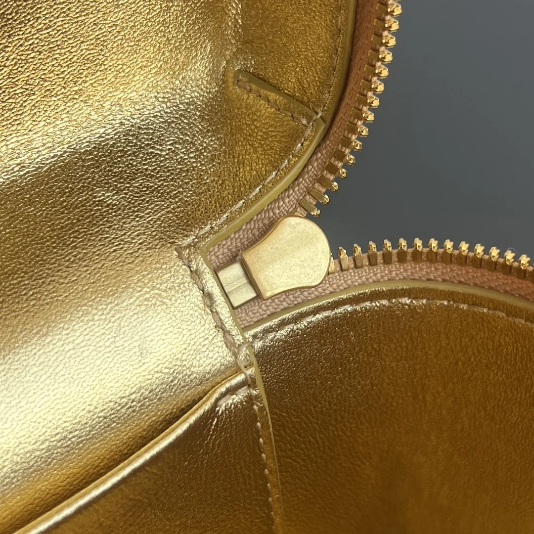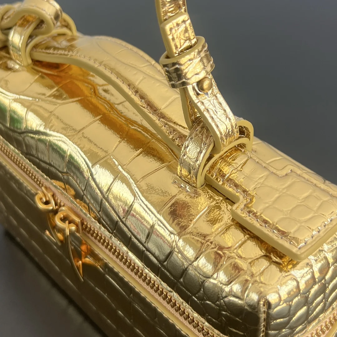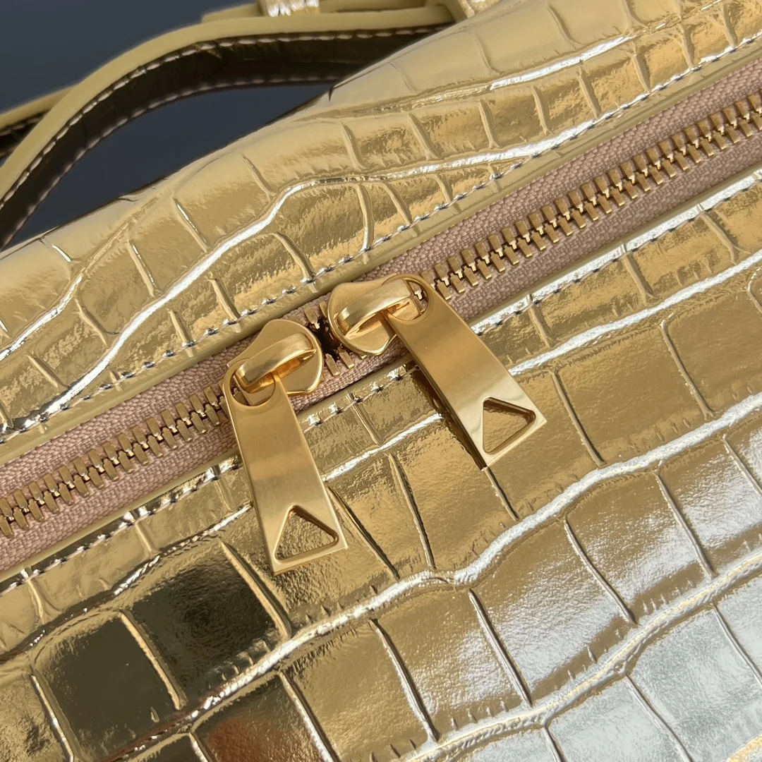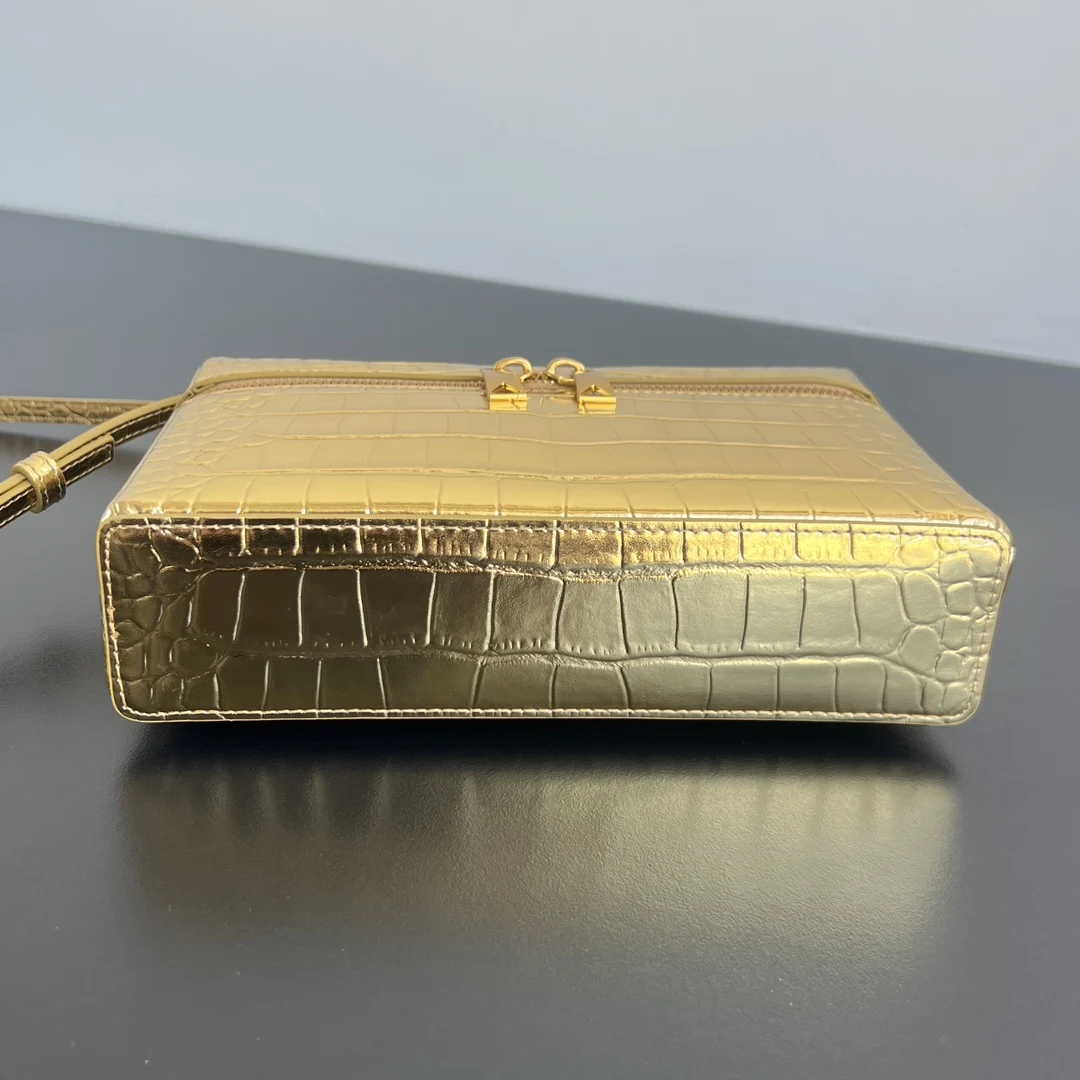 BV New Vanity Case Crocodile-Embossed Makeup Bag, 789109 The shimmering gold crocodile-embossed texture stands out in the crowd The metallic luster shines under the light, showcasing luxury and aura Top handle and adjustable shoulder strap allow for versatile styling. Carry it by hand for an elegant look, or wear it crossbody for a casual vibe, unlocking various styling scenarios Dimensions: 22x12.5x5